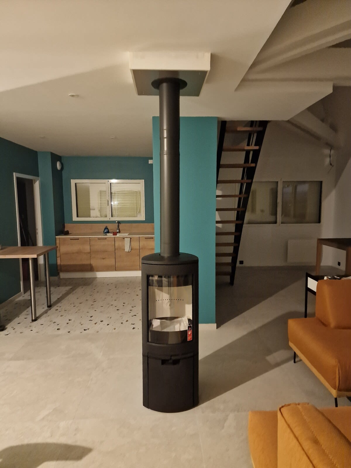1 poêle à bois au centre de la maison pour les soirées d’hivers