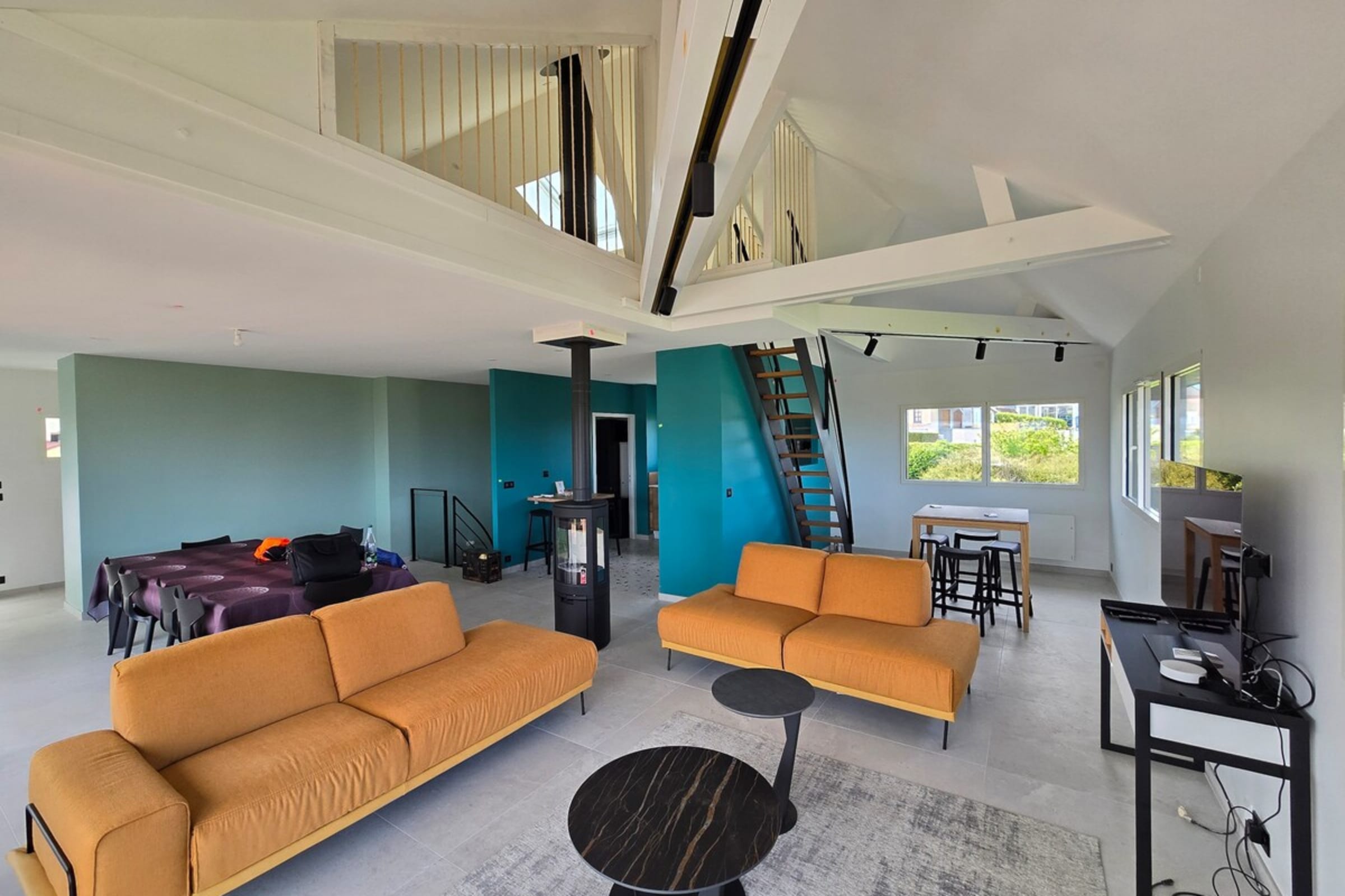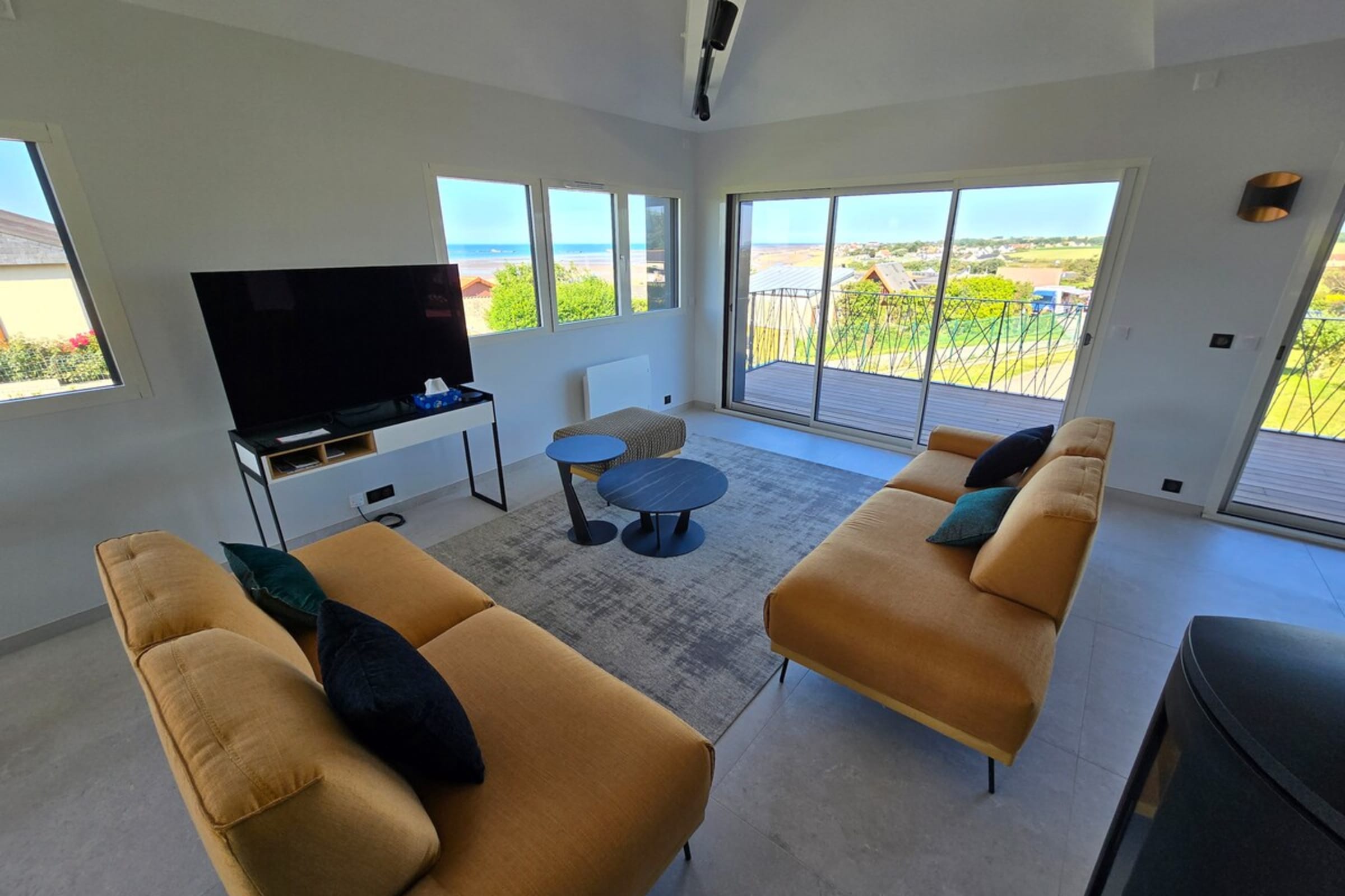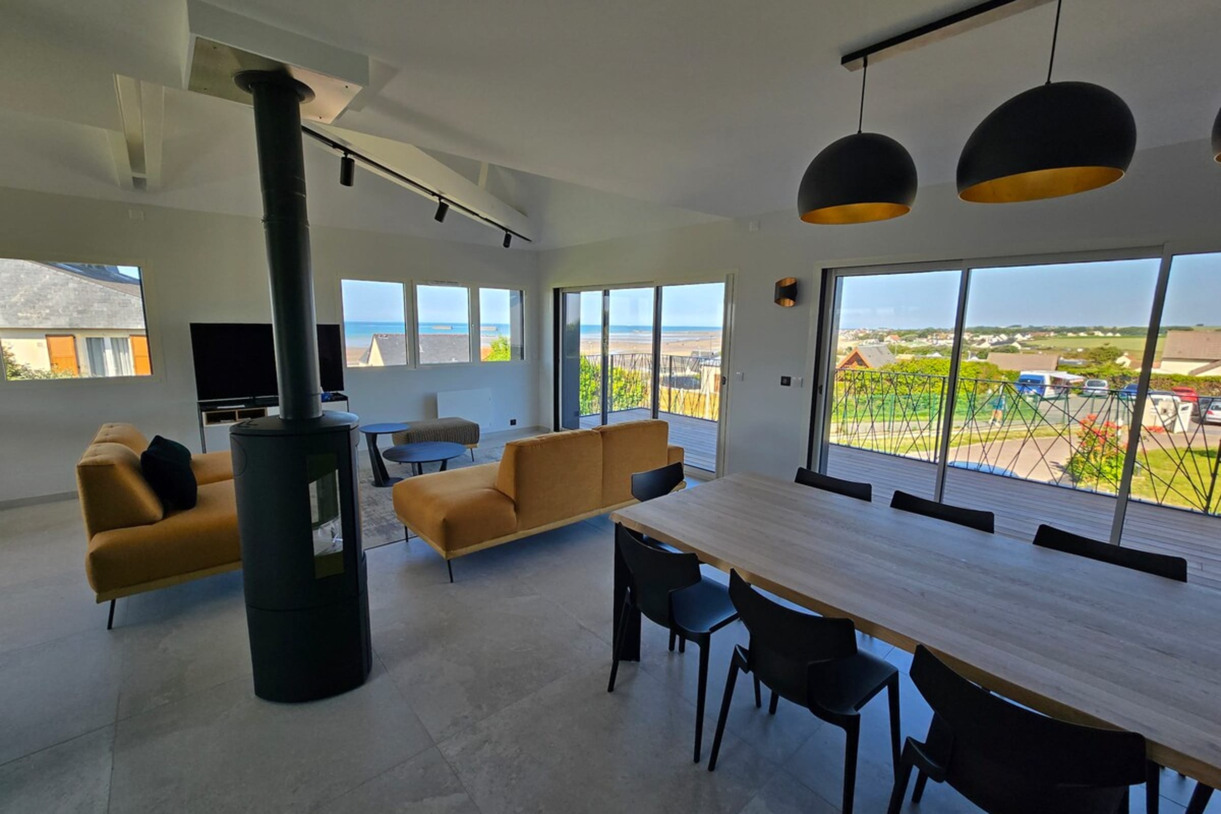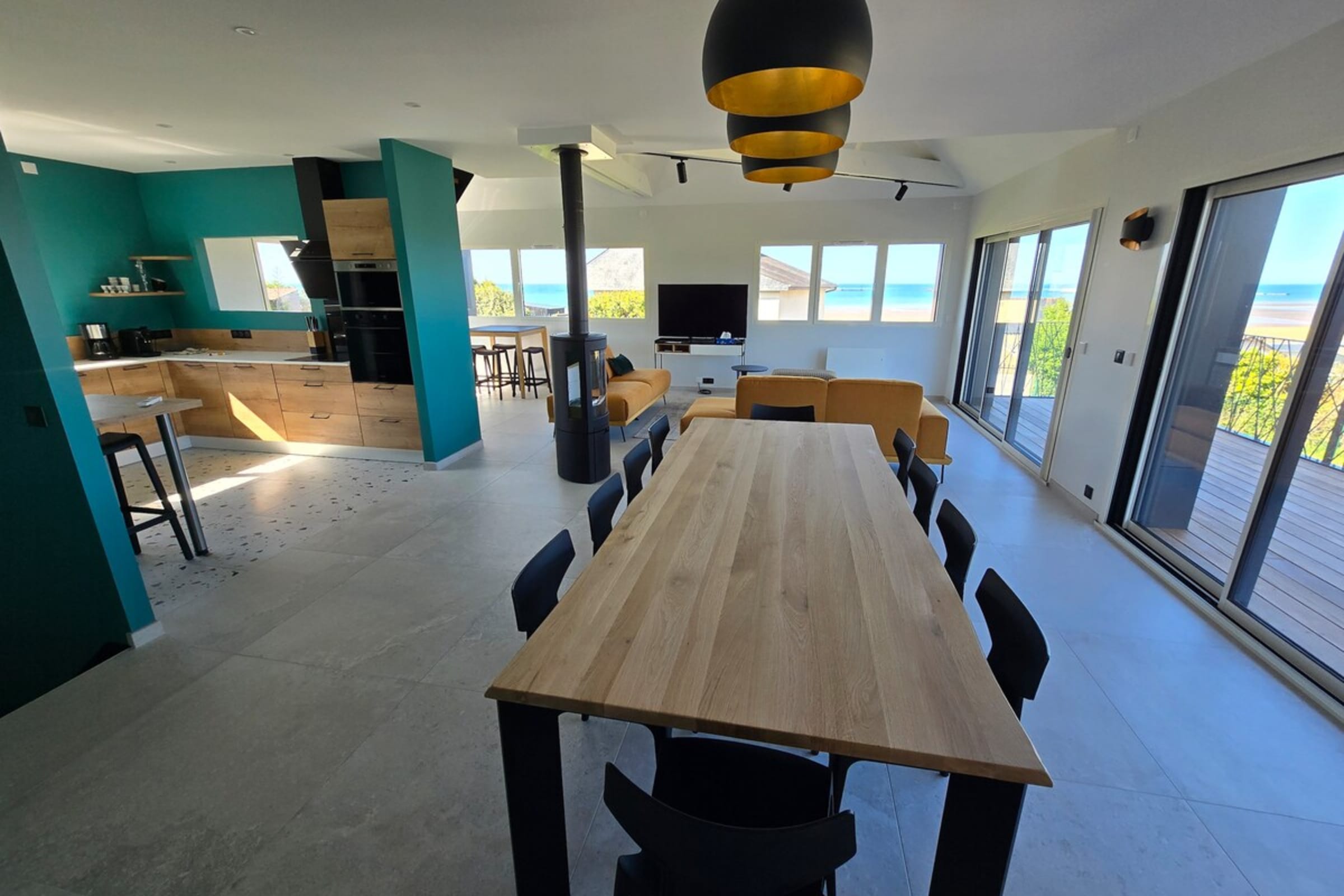 Le Salon avec une vue imprenable sur la mer et les vestiges du port artificiel donne accès à une mezzanine pour vos enfants. Une grande salle à manger pour 10 personnes, 1 arrière cuisine et 1 WC