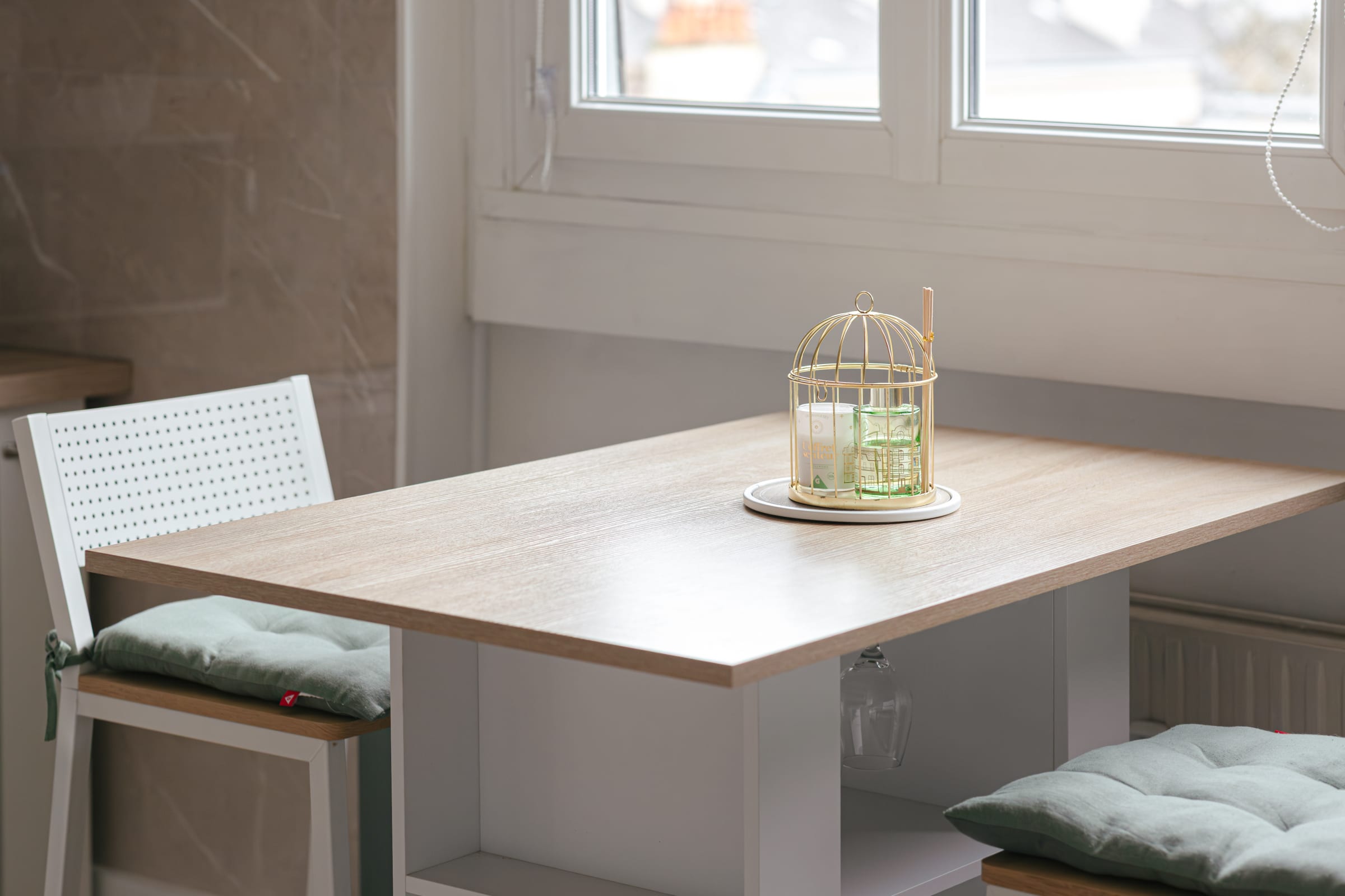 La cuisine, ouverte et entièrement équipée, invite à la convivialité autour d’une table pour deux. Elle dispose de tout l'équipement nécessaire : réfrigérateur, plaque à induction, micro-ondes, Air Fryer, cafetière, bouilloire, ainsi que tout le nécessaire pour cuisiner avec plaisir.