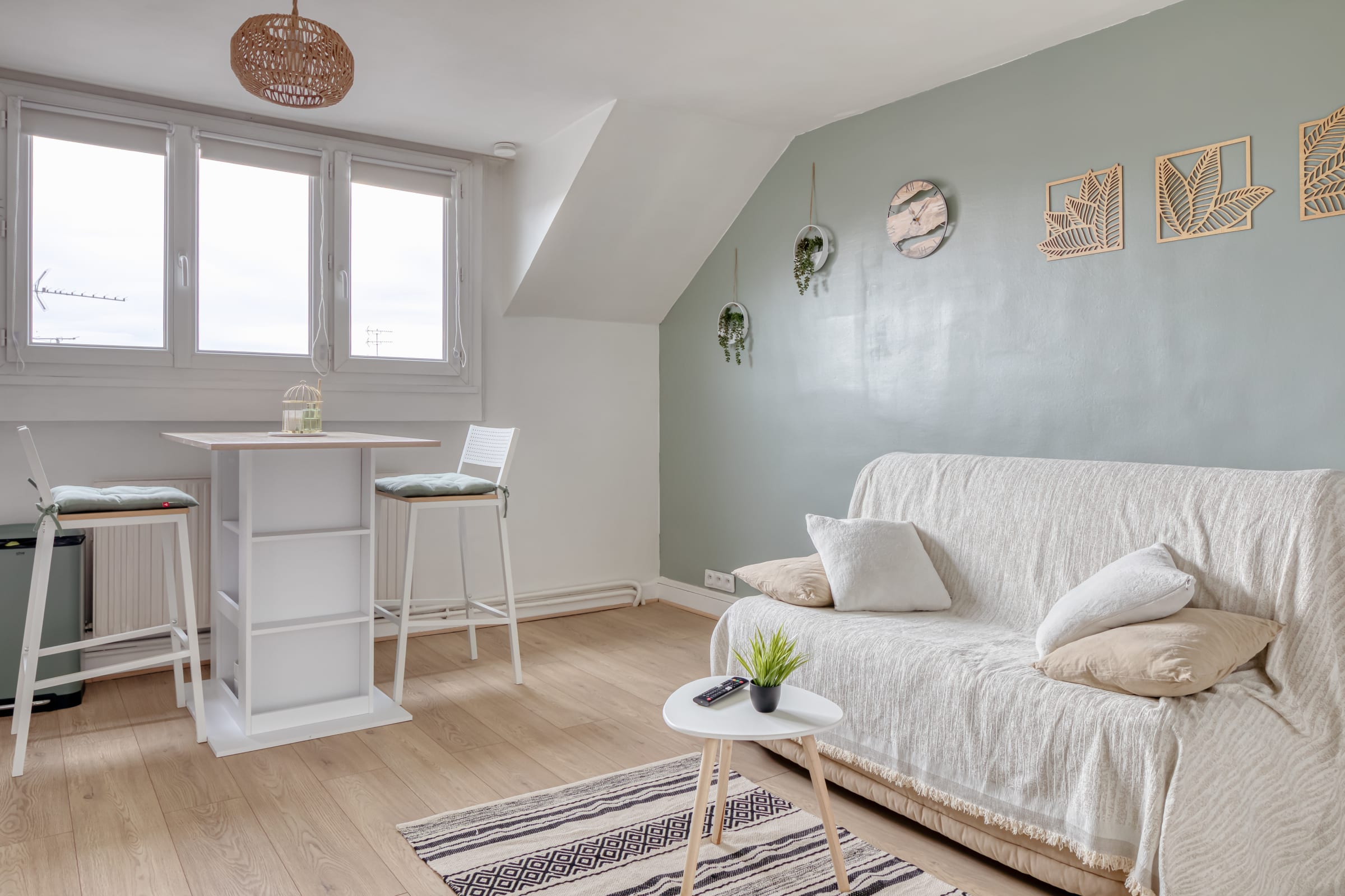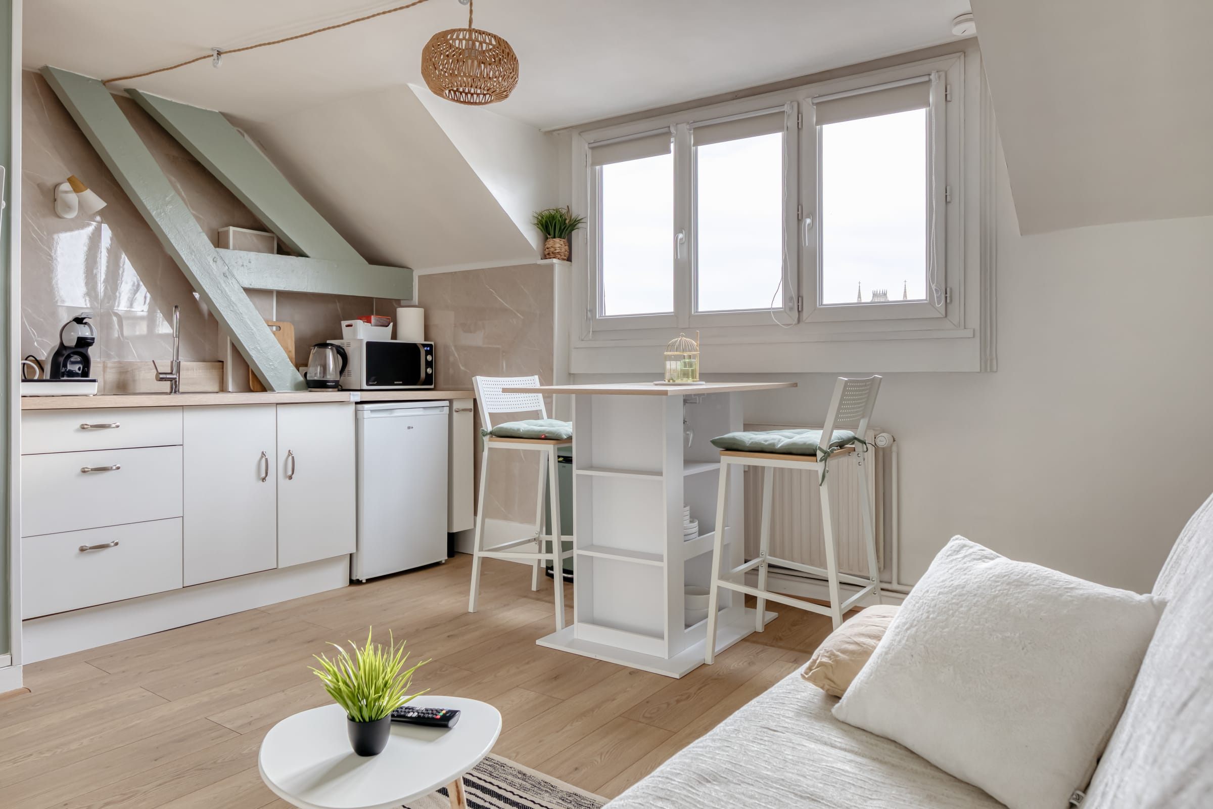 Dans le séjour, le canapé dépliant offre un espace douillet pour se reposer. Un endroit idéal pour se reposer, tout en profitant de la splendide vue sur la Cathédrale de Rouen.