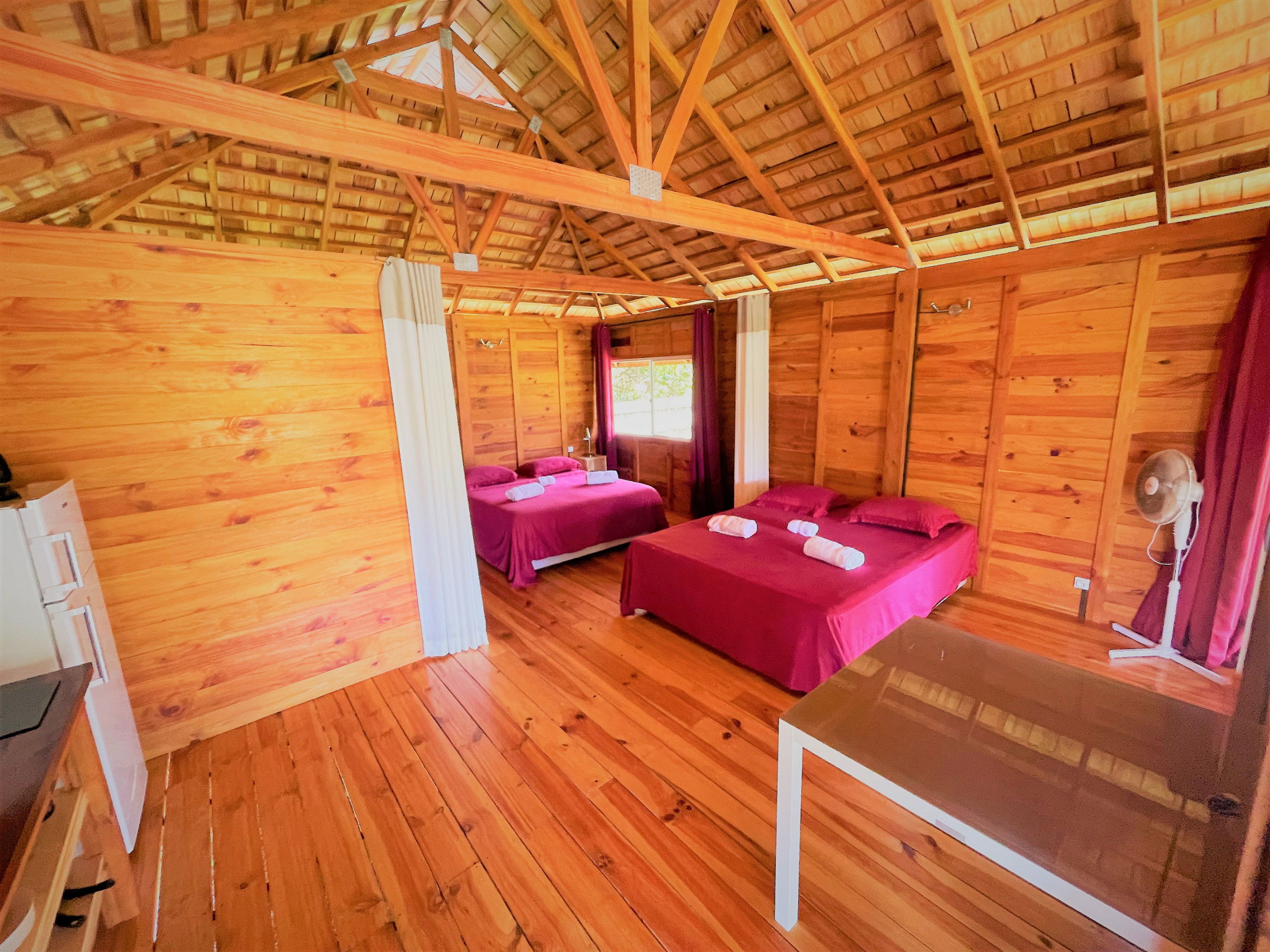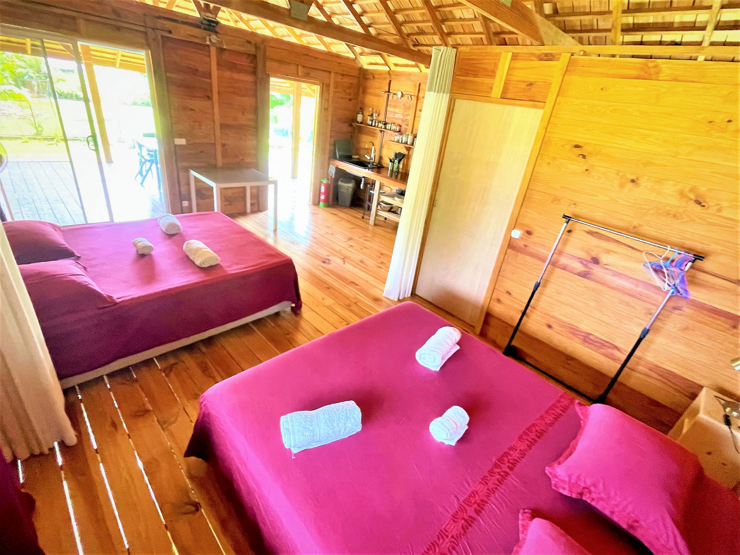 Le bungalow est doté d'une cuisine équipée, vous permettant de préparer vos repas à votre guise. Vous trouverez également une salle de bain privative avec douche, WC et lavabo, garantissant tout le confort nécessaire à votre séjour.