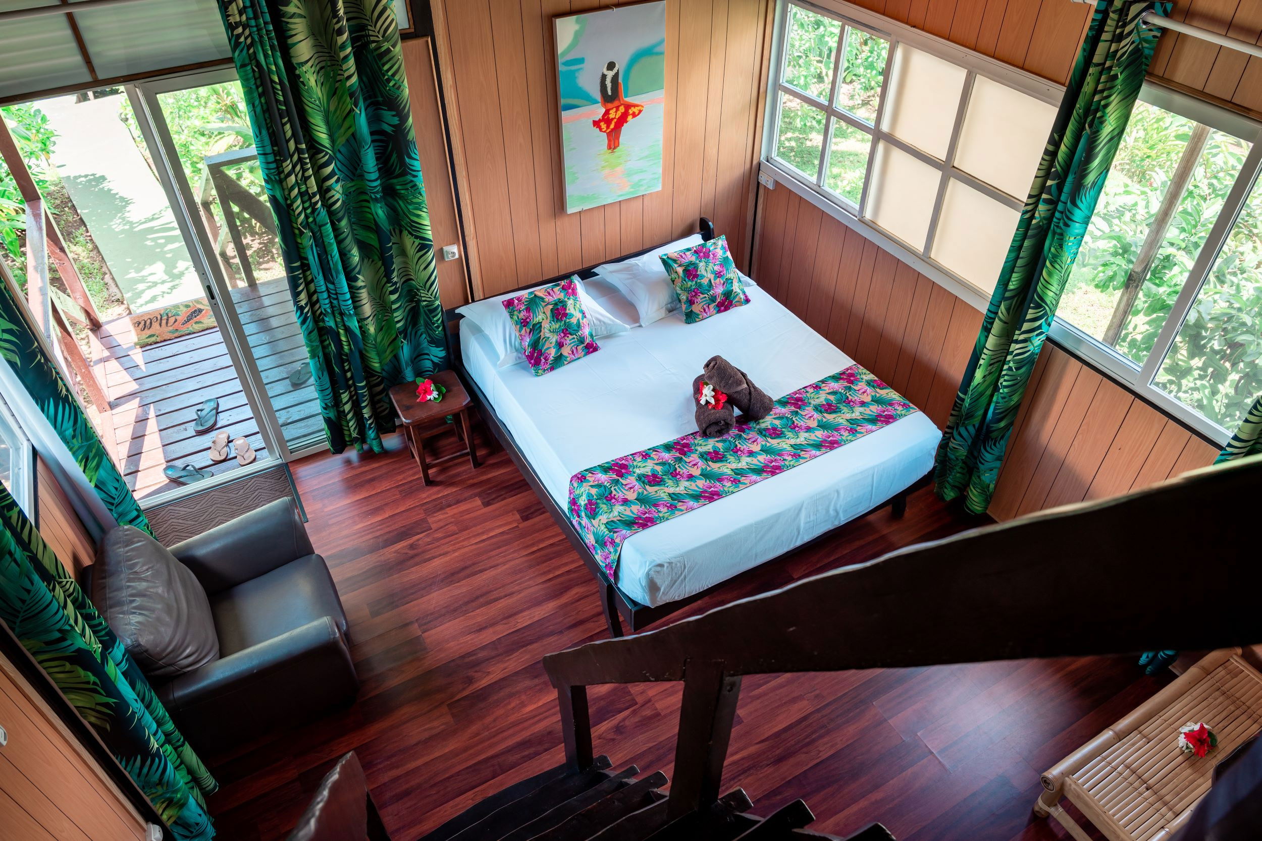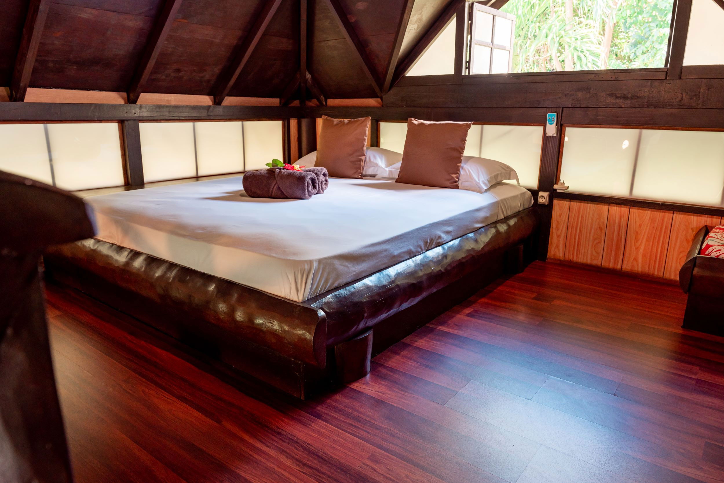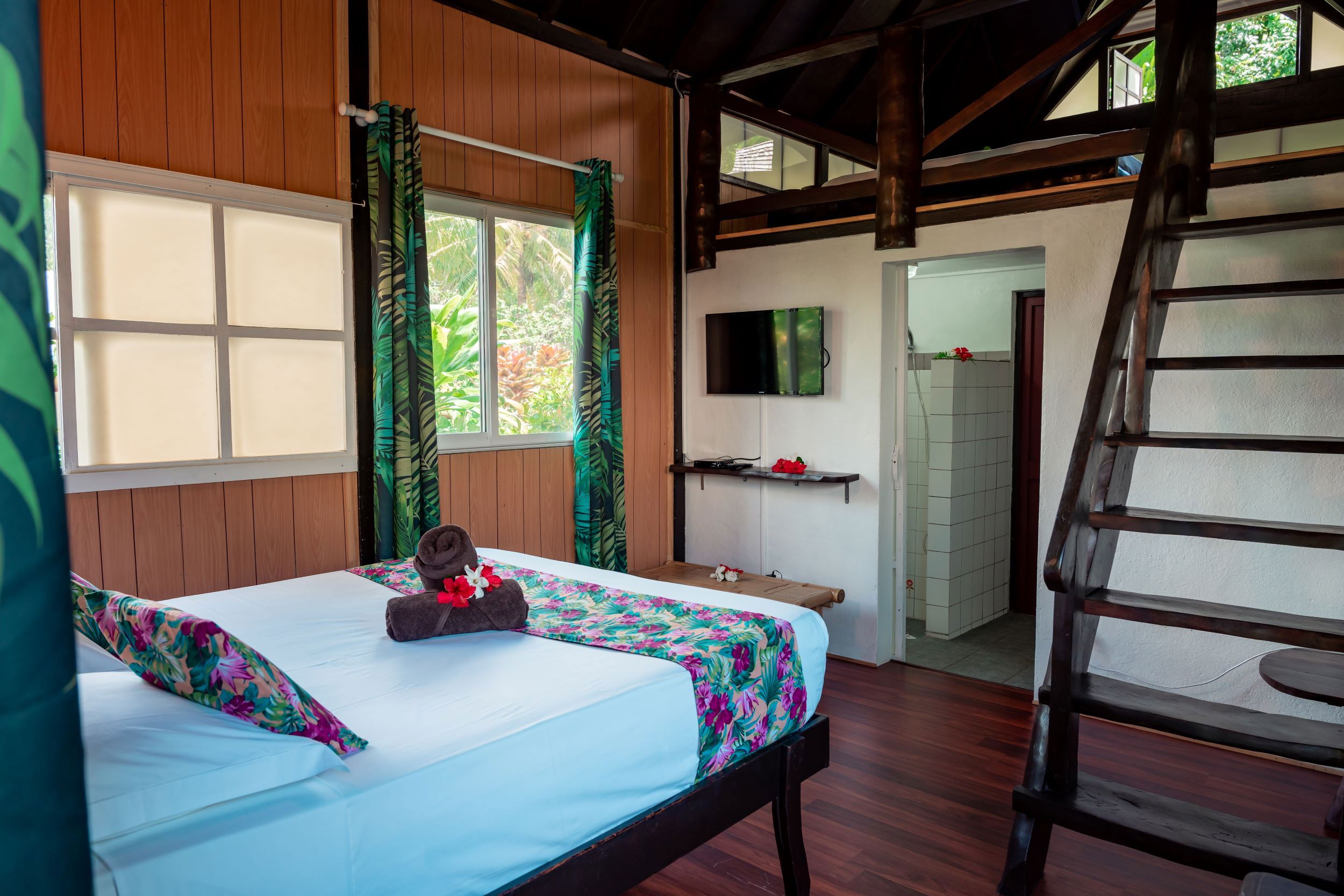 Il peut accueillir jusqu'à 4 personnes, il est confortable et décoré dans un style local élégant. Il dispose de 2 lits queen size, ainsi qu'une salle de bain privée avec douche et WC. La climatisation et un ventilateur sont disponibles pour plus de confort, ainsi qu'une télévision pour les moments de détente. Le bungalow s'ouvre sur un balcon couvert et aménagé avec une table et des chaises, idéal pour savourer un café le matin, se reposer ou encore s'adonner à la lecture de son roman préféré.
