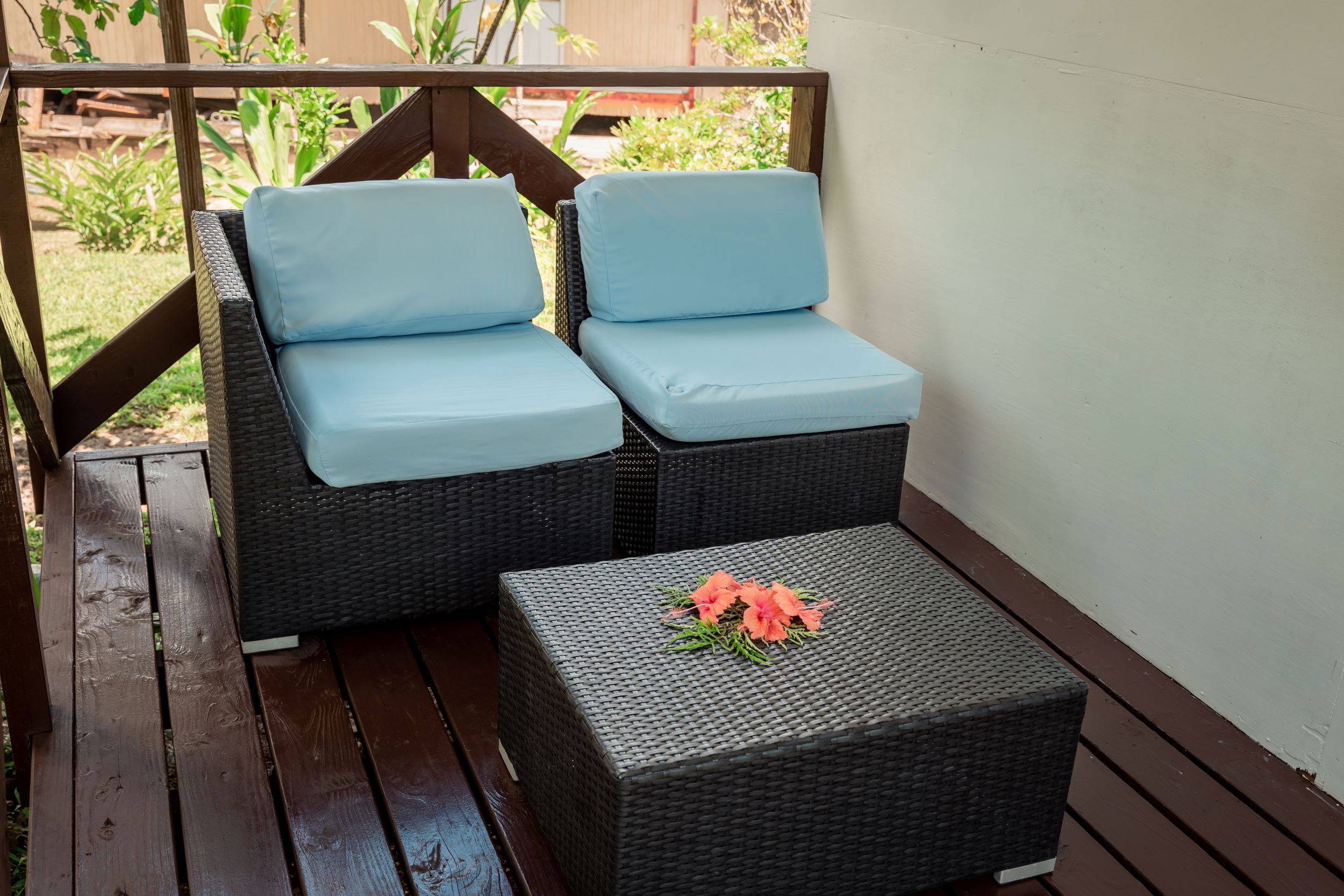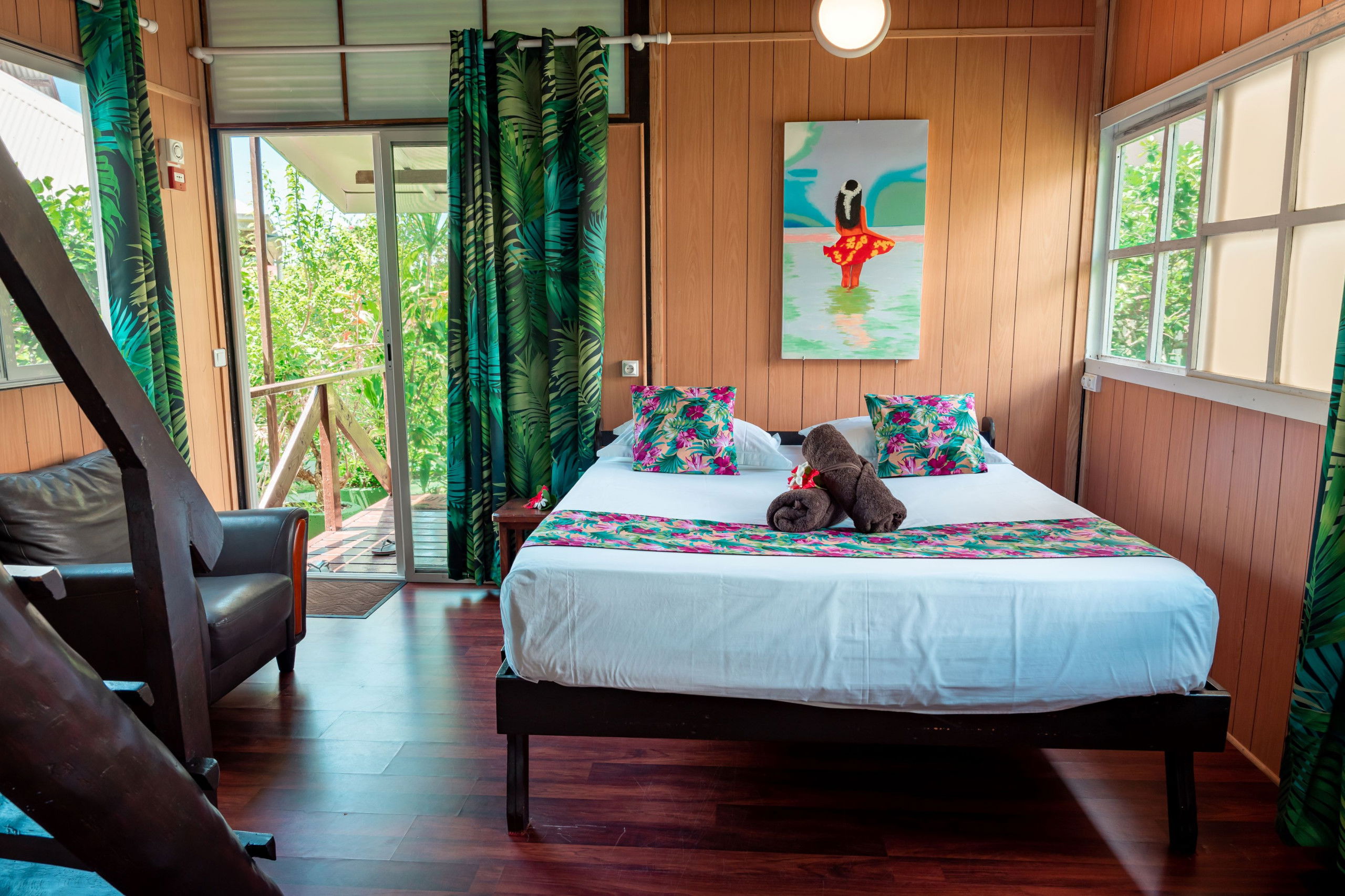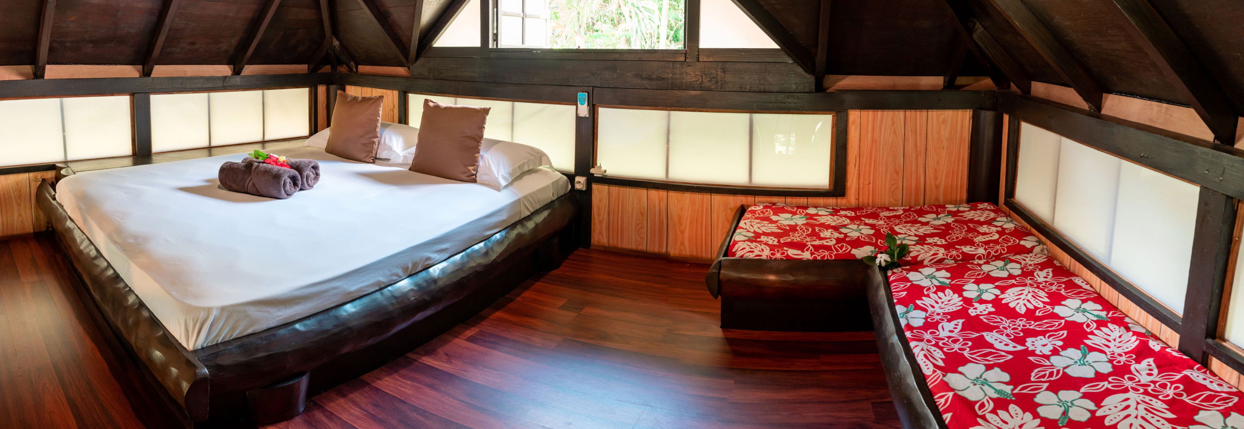 Il peut accueillir jusqu'à 4 personnes, il est confortable et décoré dans un style local élégant. Il dispose de 2 lits queen size, ainsi qu'une salle de bain privée avec douche et WC. La climatisation et un ventilateur sont disponibles pour plus de confort, ainsi qu'une télévision pour les moments de détente. Le bungalow s'ouvre sur un balcon couvert et aménagé avec une table et des chaises, idéal pour savourer un café le matin, se reposer ou encore s'adonner à la lecture de son roman préféré.