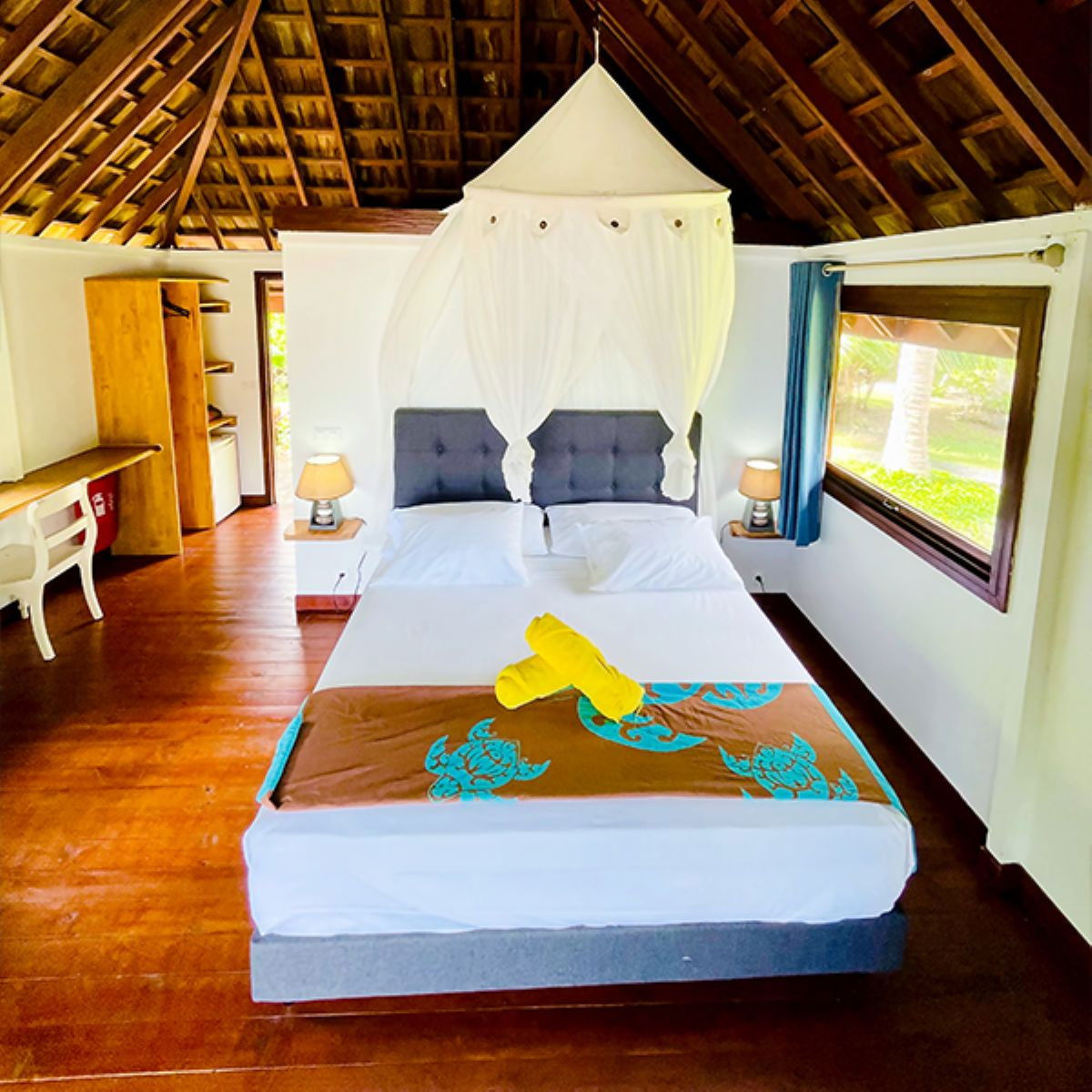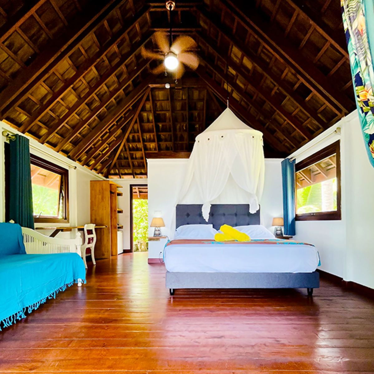 Pensé pour un couple ou une petite famille, le bungalow Ariitea allie authenticité polynésienne et confort moderne. Il est l'une des 2 unité premium du lodge.
