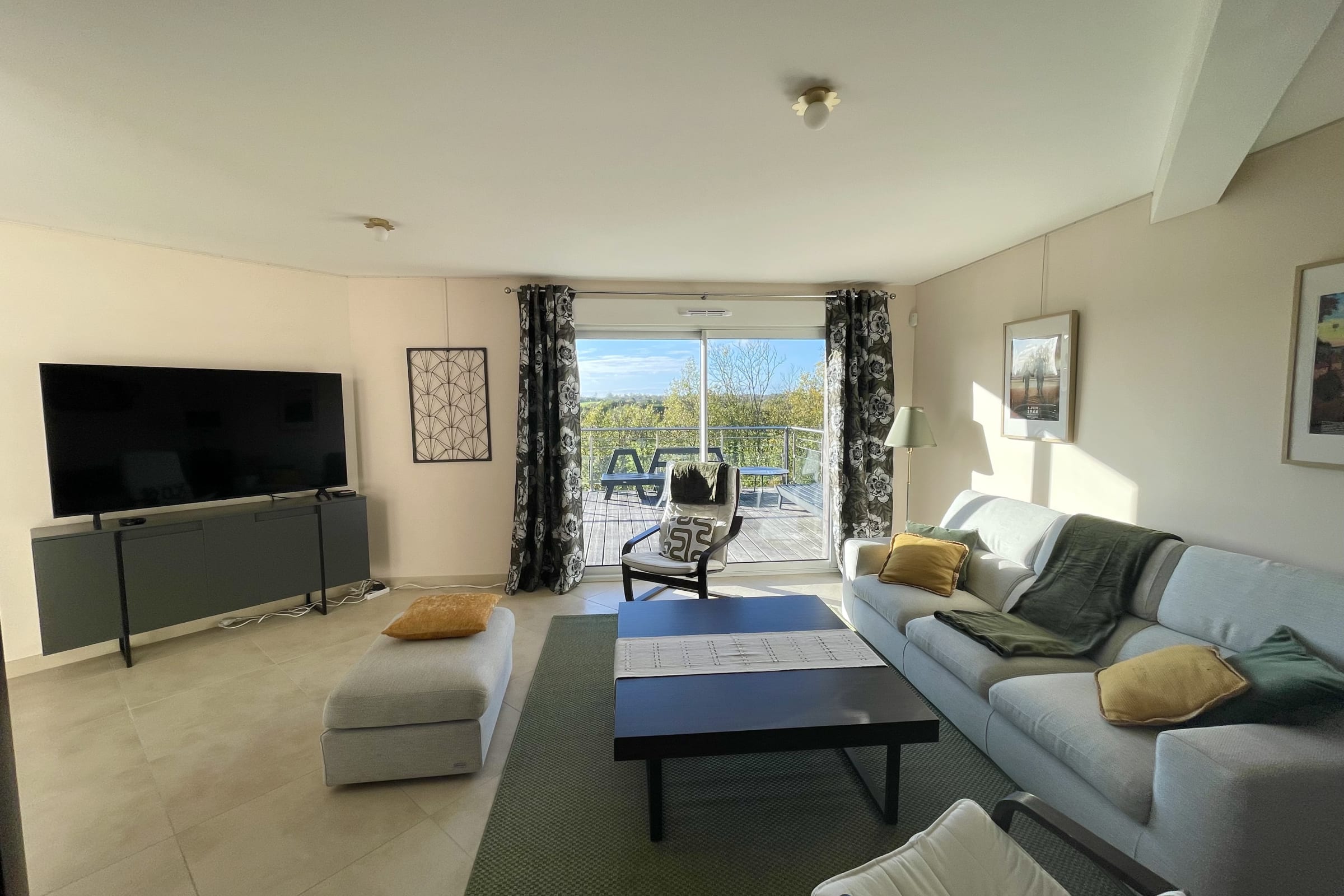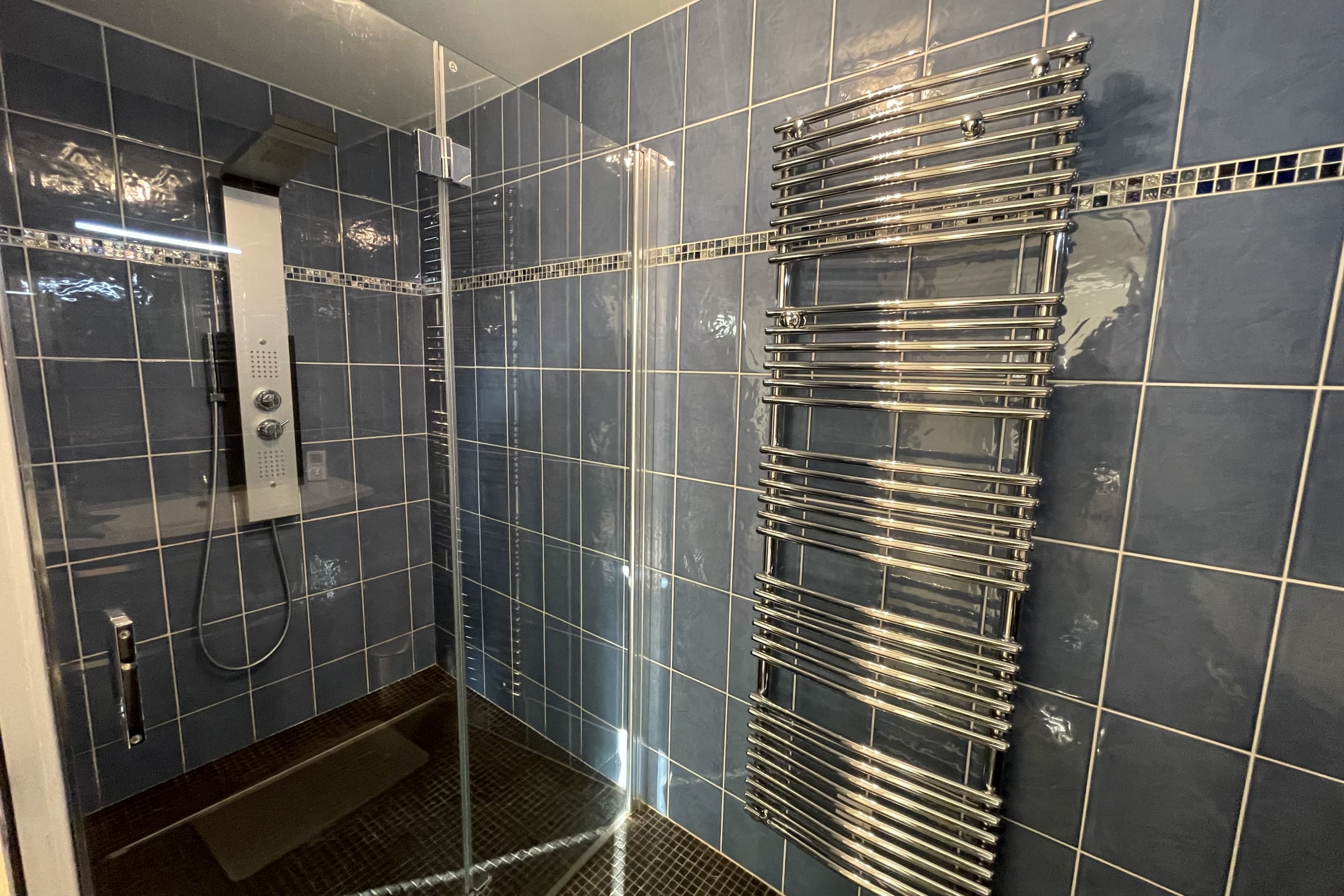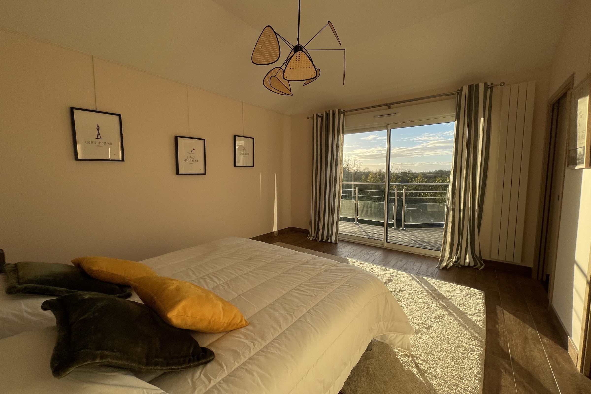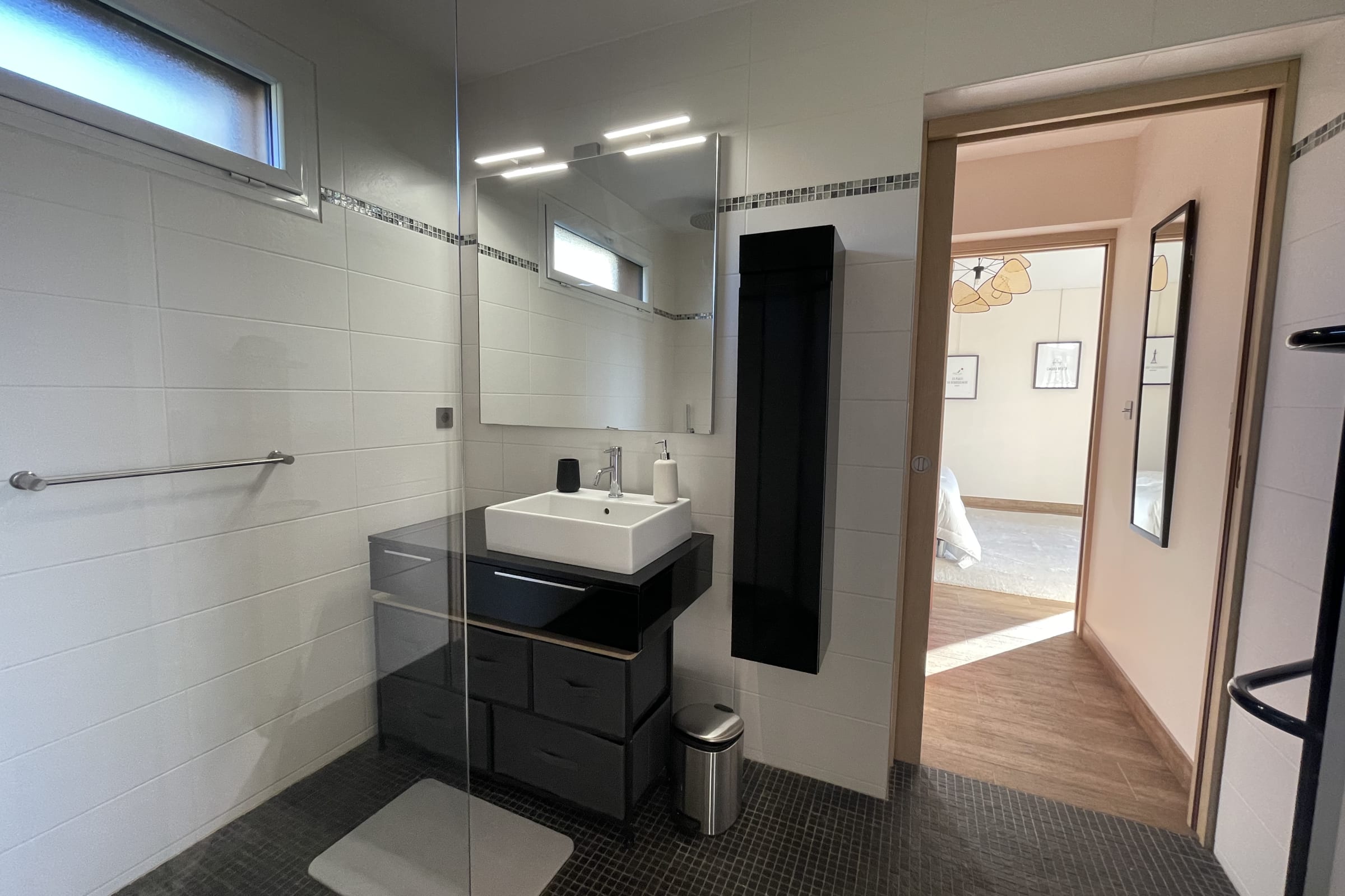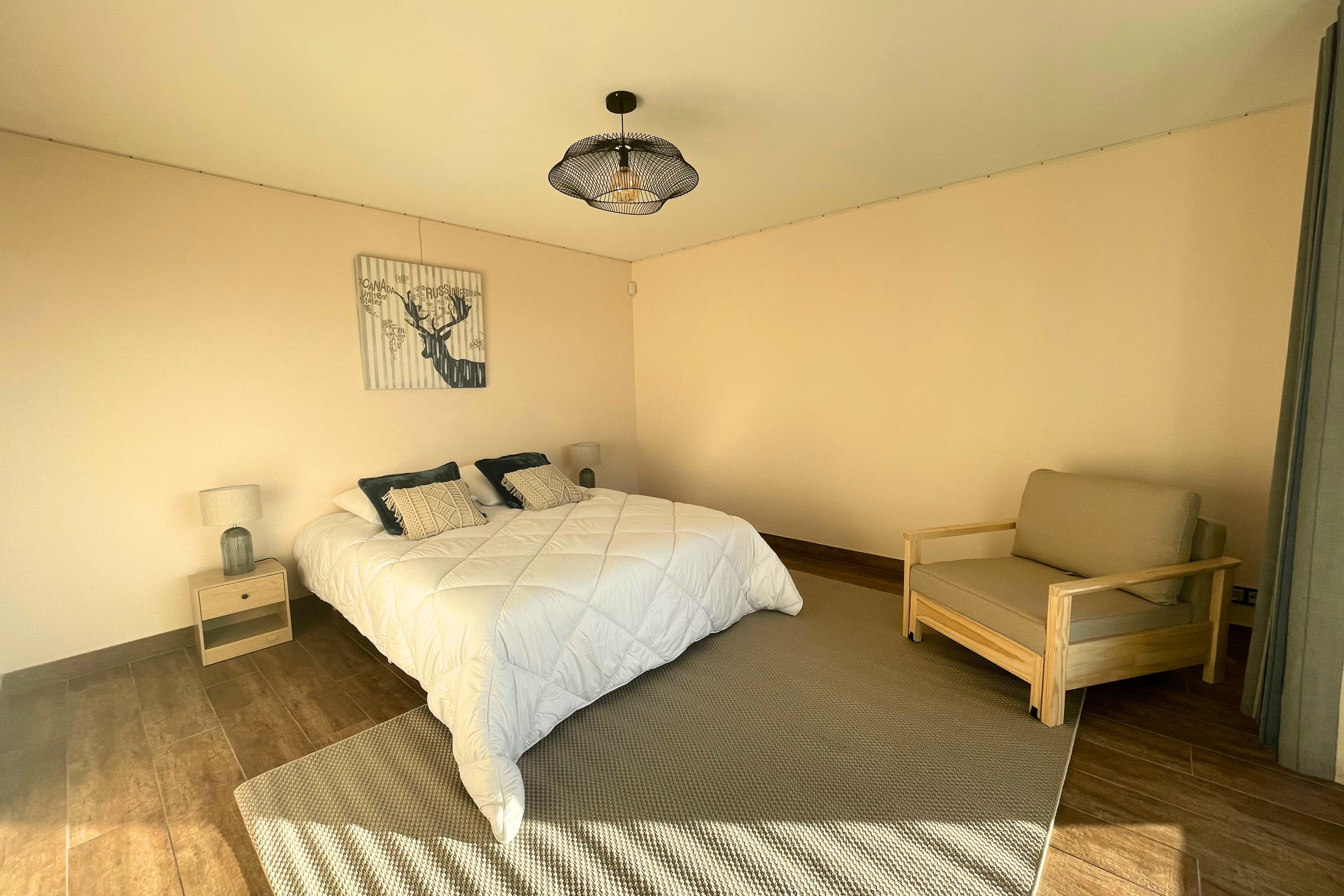 En rez-de-chaussée, une belle chambre avec lit queen size et baie vitrée sur le jardin, une salle de douche à l'italienne avec balnéo et wc séparé. Un studio avec kitchenette et canapé-lit.
