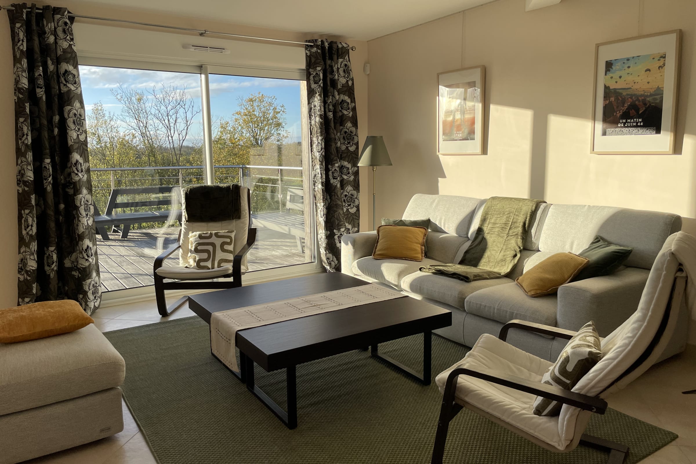 Au 1er étage, une salle à manger lumineuse avec une grande hauteur sous plafond. Vue sur la plaine de Trévières. Un coin salon et une cuisine ouverte très bien équipée avec une ouverture sur la véranda à l'arrière de la maison. Une chambre avec 1 lit queen size, une salle de douche à l'italienne attenante, wc séparé.