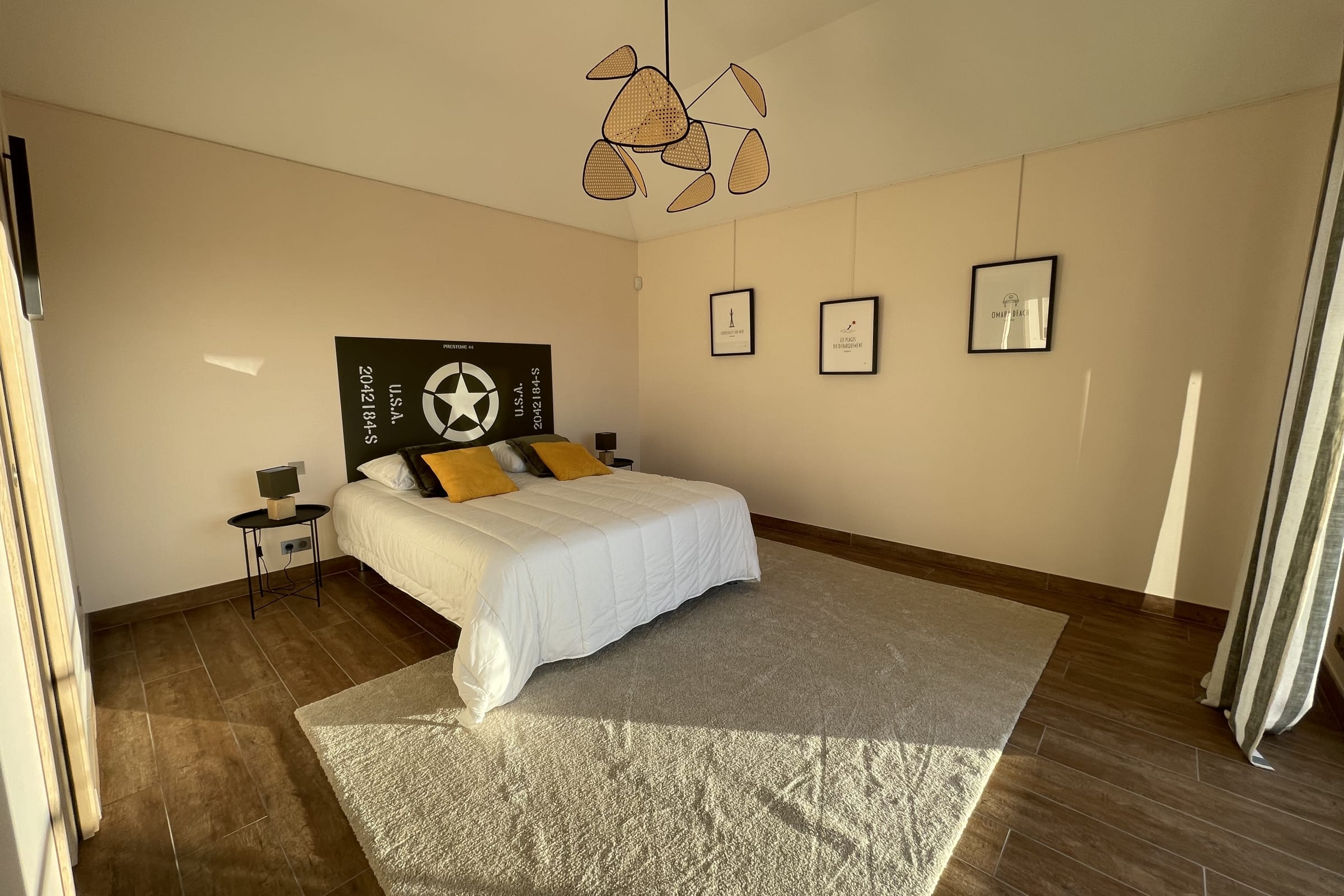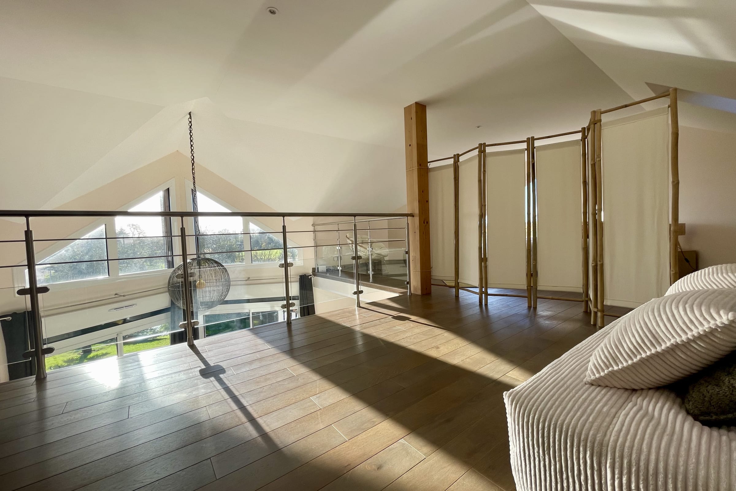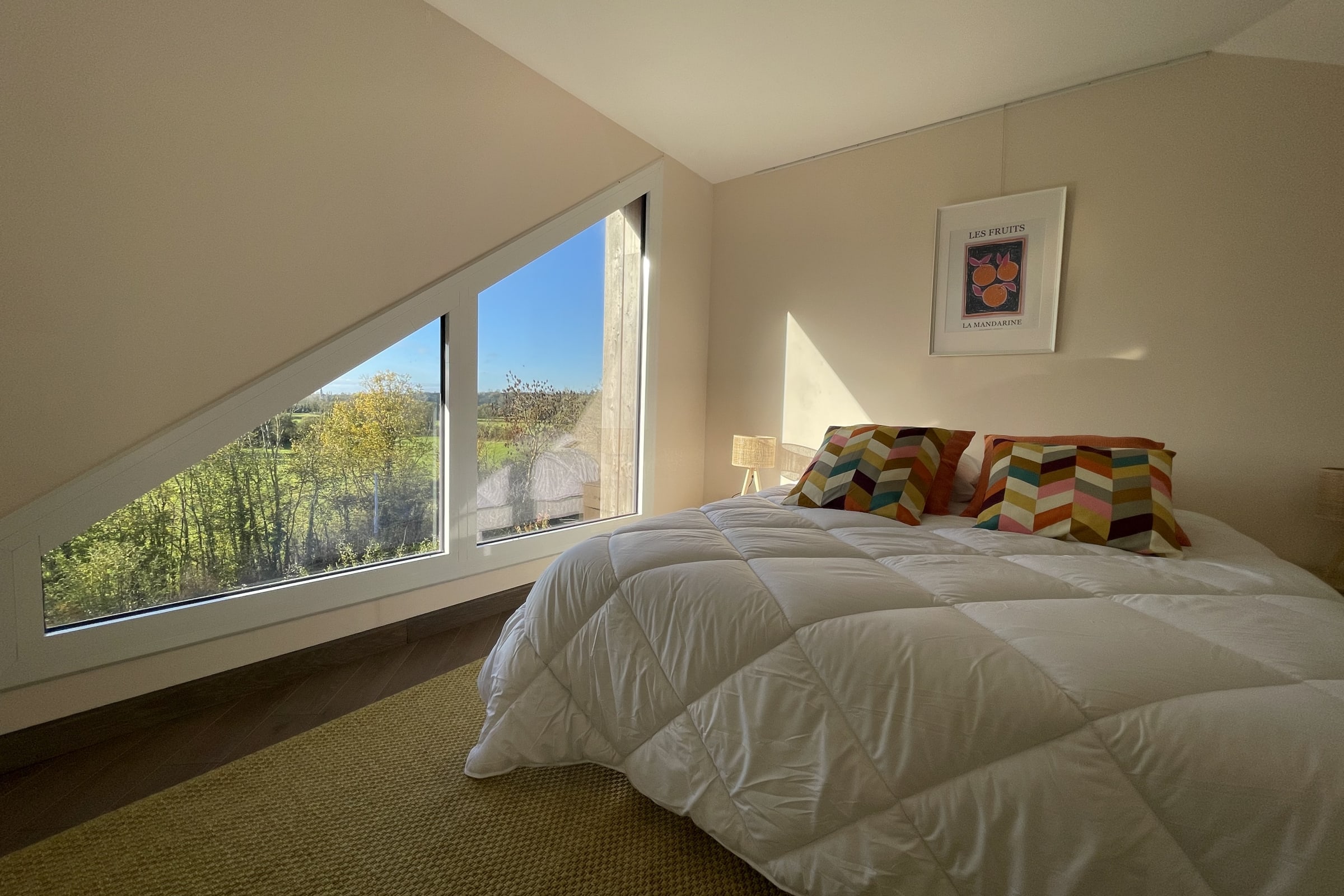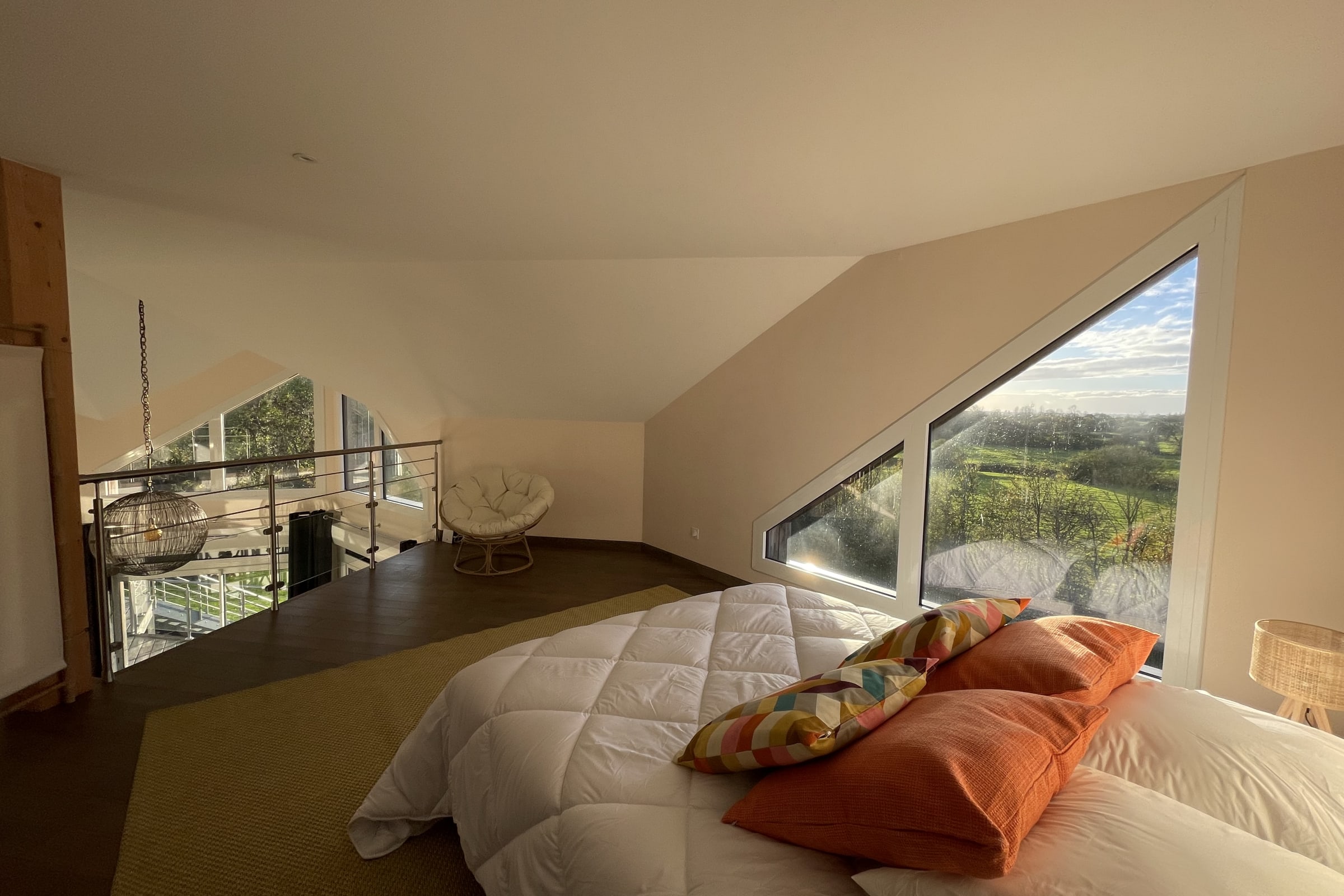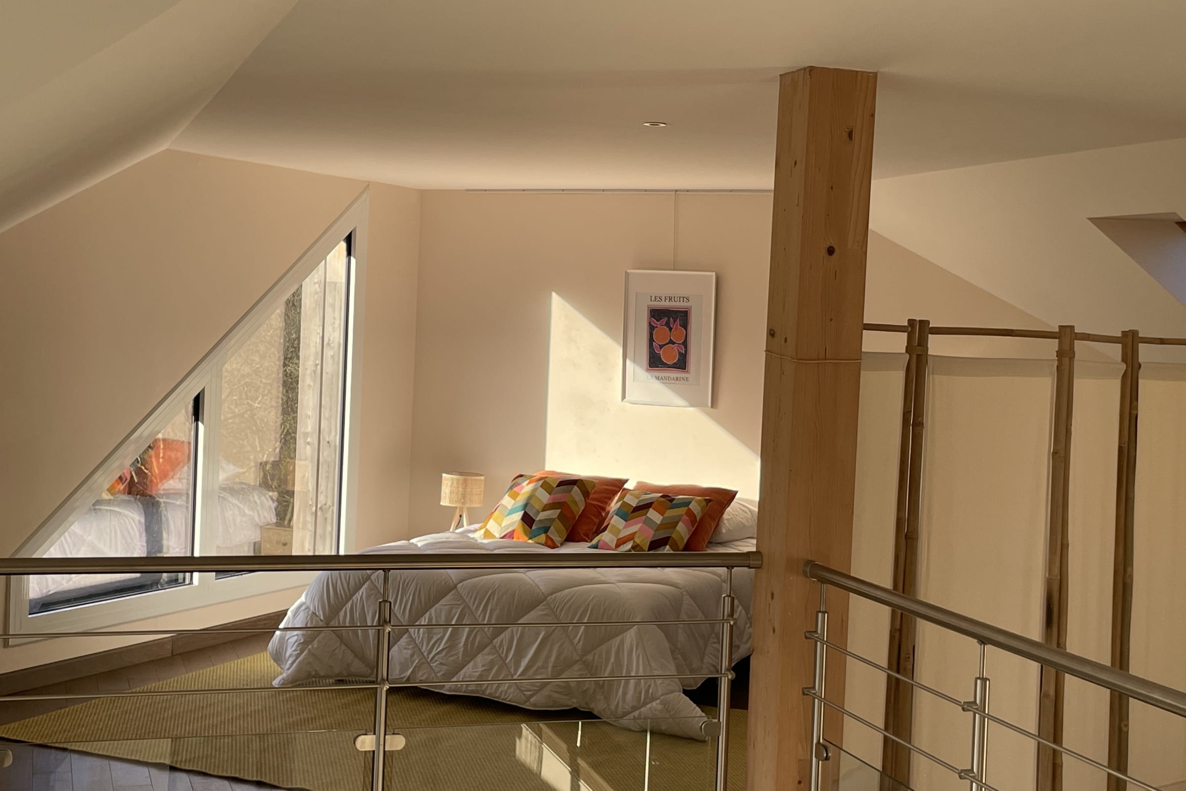 Au 2ème étage, une grand espace ouvert, comprenant un espace nuit avec 1 lit queen size (pas de rideaux occultants) et un coin bureau.