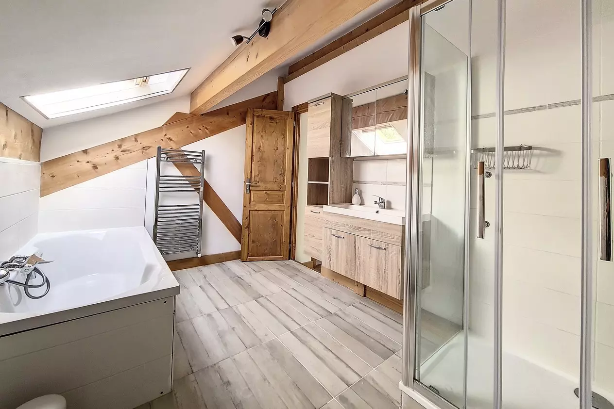 Chambre 1 en suite : 1 lit double en 160, 2 lits simples superposés, salle d'eau avec douche, lavabo, WC et sèche serviette et sèche cheveux. Accès direct au balcon