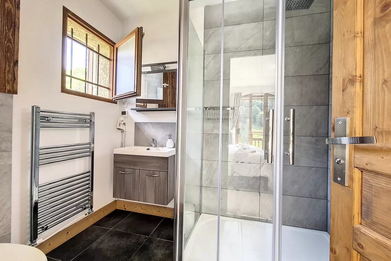Chambre 2 en suite : 2 lits jumeaux (90x200), salle d'eau avec douche, lavabo, WC et sèche serviette et sèche cheveux.