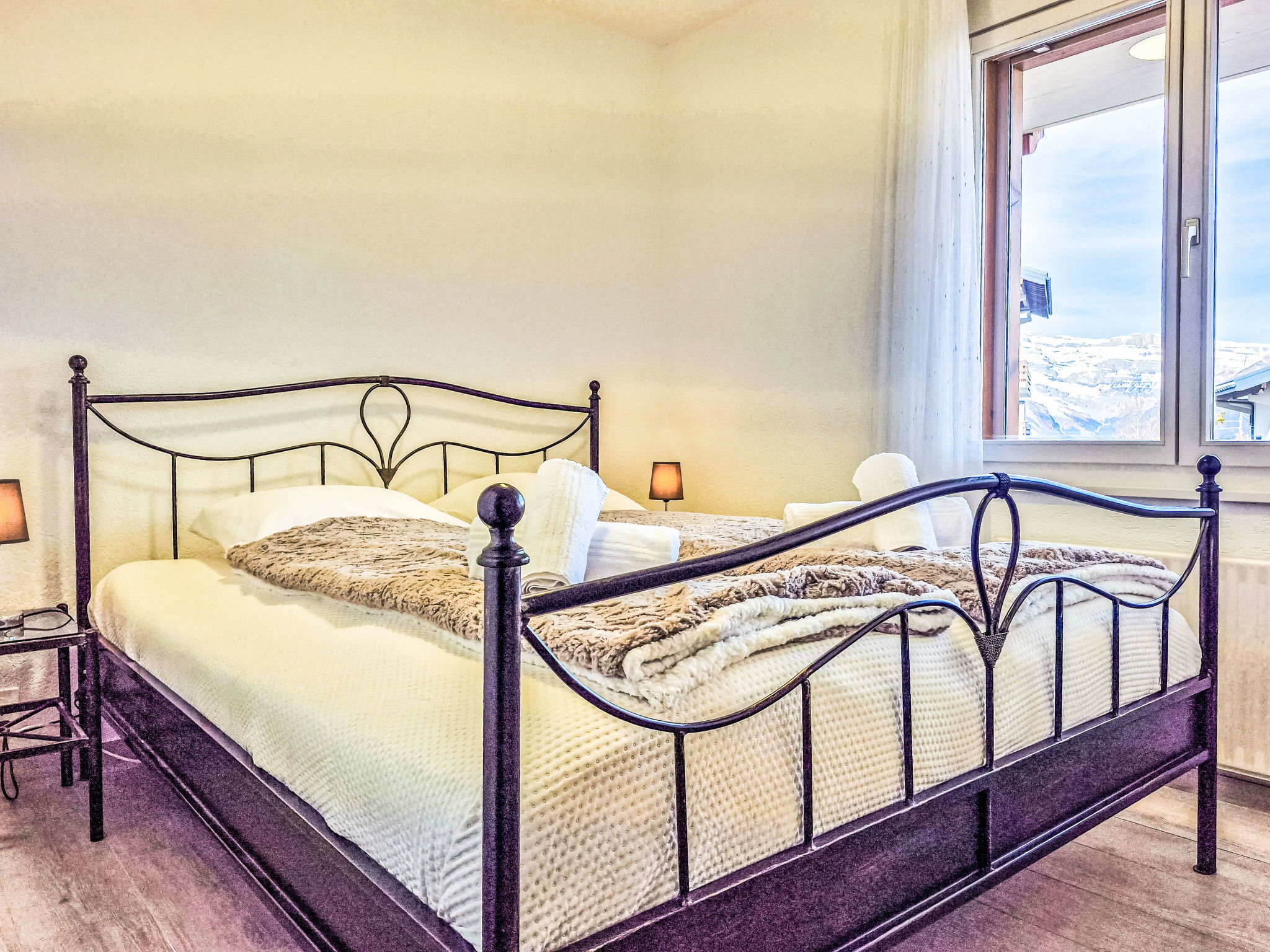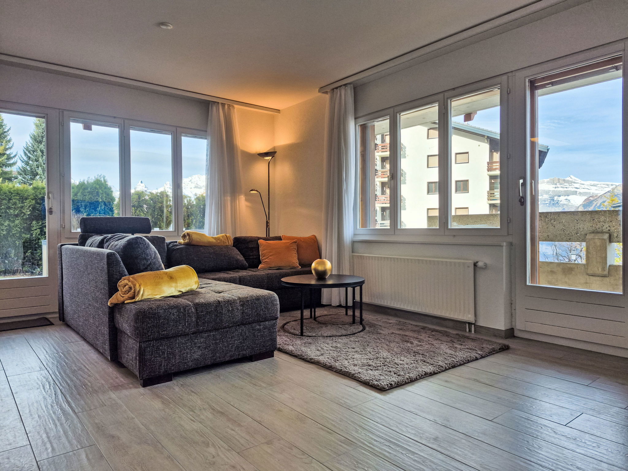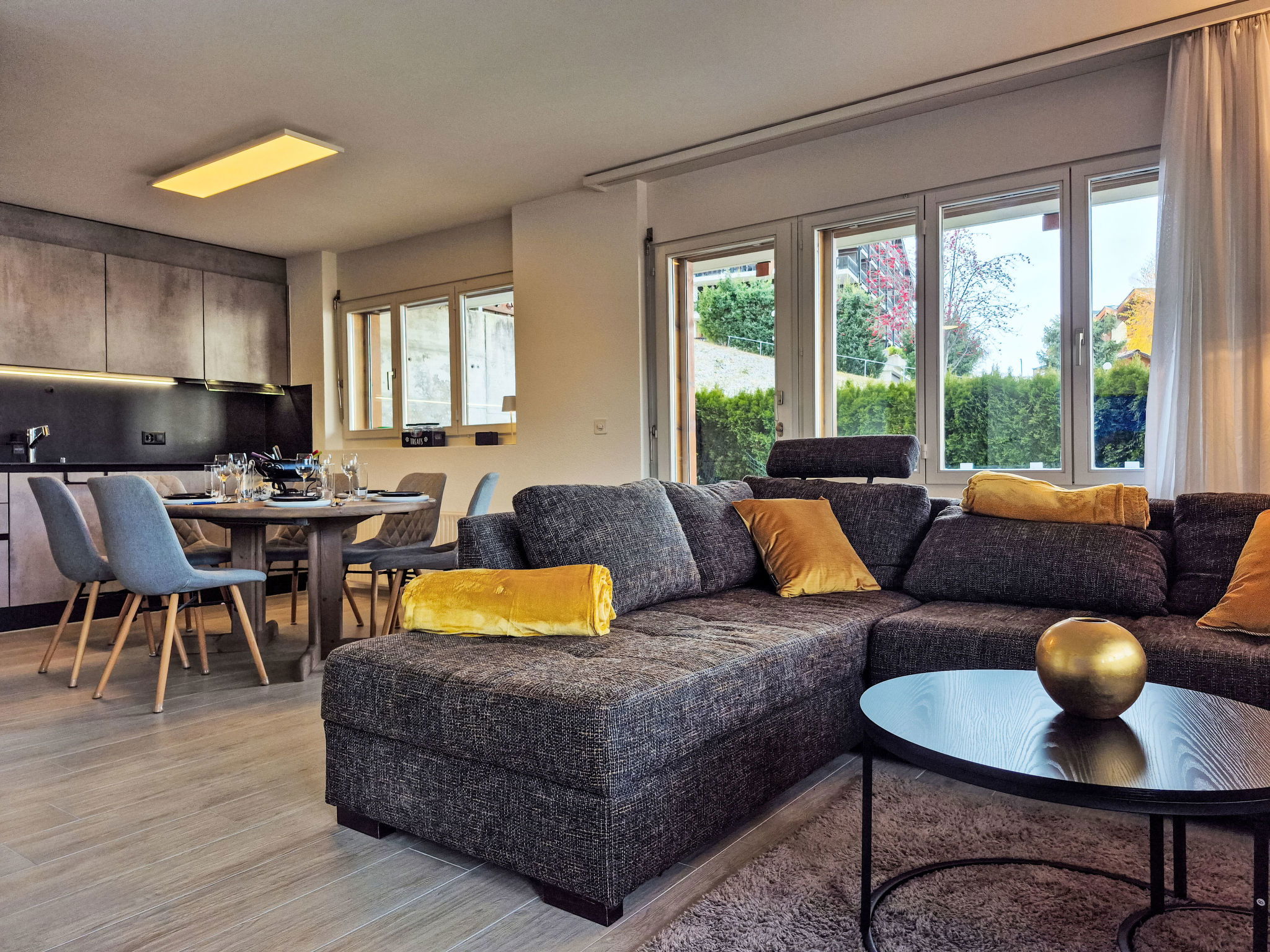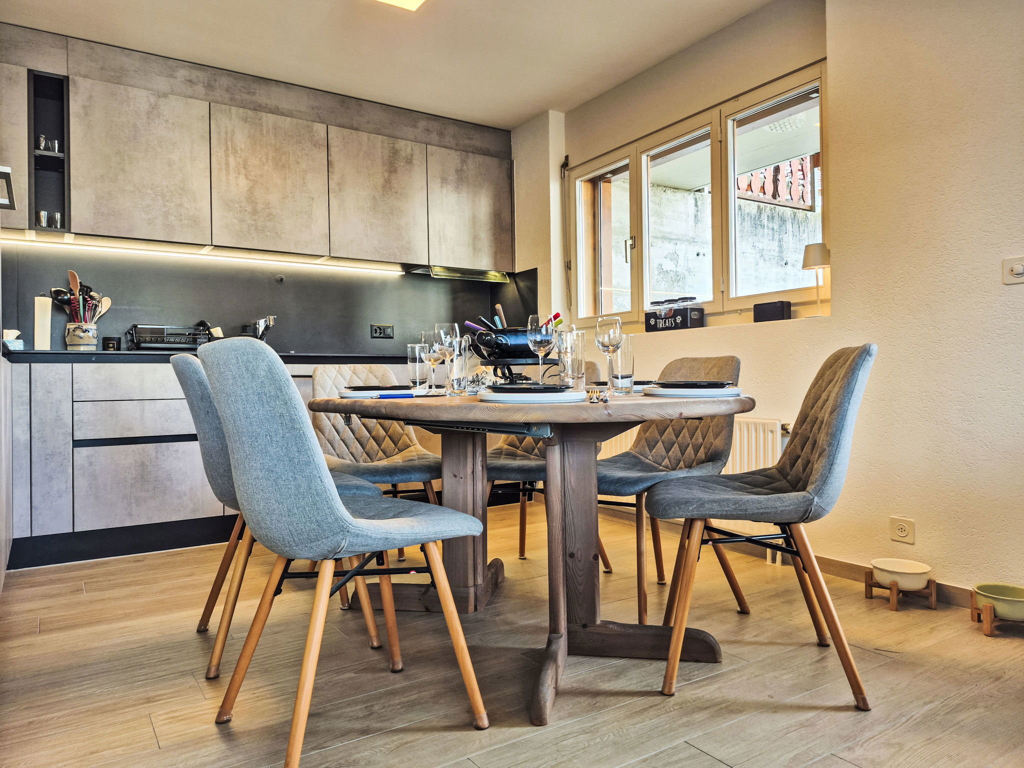 "Ambassador 2/1", Appartement de 3 pièces 80 m2, au rez-de-chaussée. Rénové en 2025, aménagement confortable et moderne: séjour/salle à manger avec TV (câblée). Sortie sur la terrasse, orientée ouest. 2 chambres, chaque chambre avec: 1 lit double. Cuisine ouverte (four, lave-vaisselle, 4 plaques vitrocéramiques, bouilloire électrique, congélateur, cafetière électrique, Capsules pour machine à café (Nespresso) (NON INCLUSES), appareil à raclette, service à fondue (fondue chinoise, fondue au fromage)). Bain/WC, douche/WC. Terrasse, situation ouest. Meubles de terrasse. A disposition: Internet (Connexion WIFI). Garage No 3. Veuillez noter: logement non-fumeur. 1 animal/ chien autorisé.