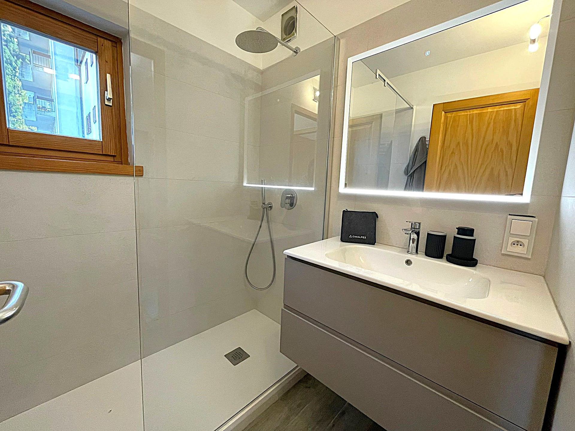 - Salle d'eau avec douche, sèche serviette et sèche-cheveux