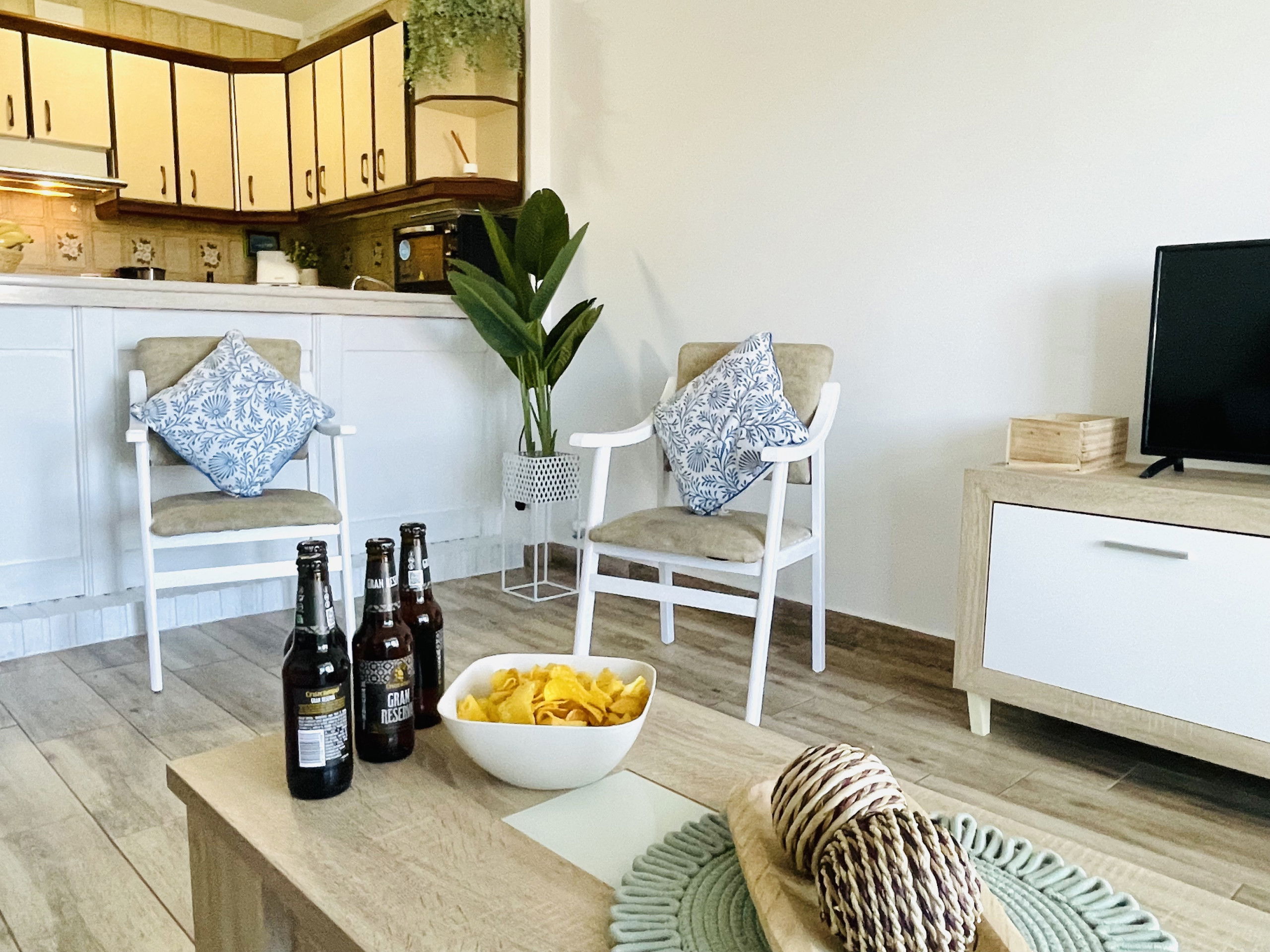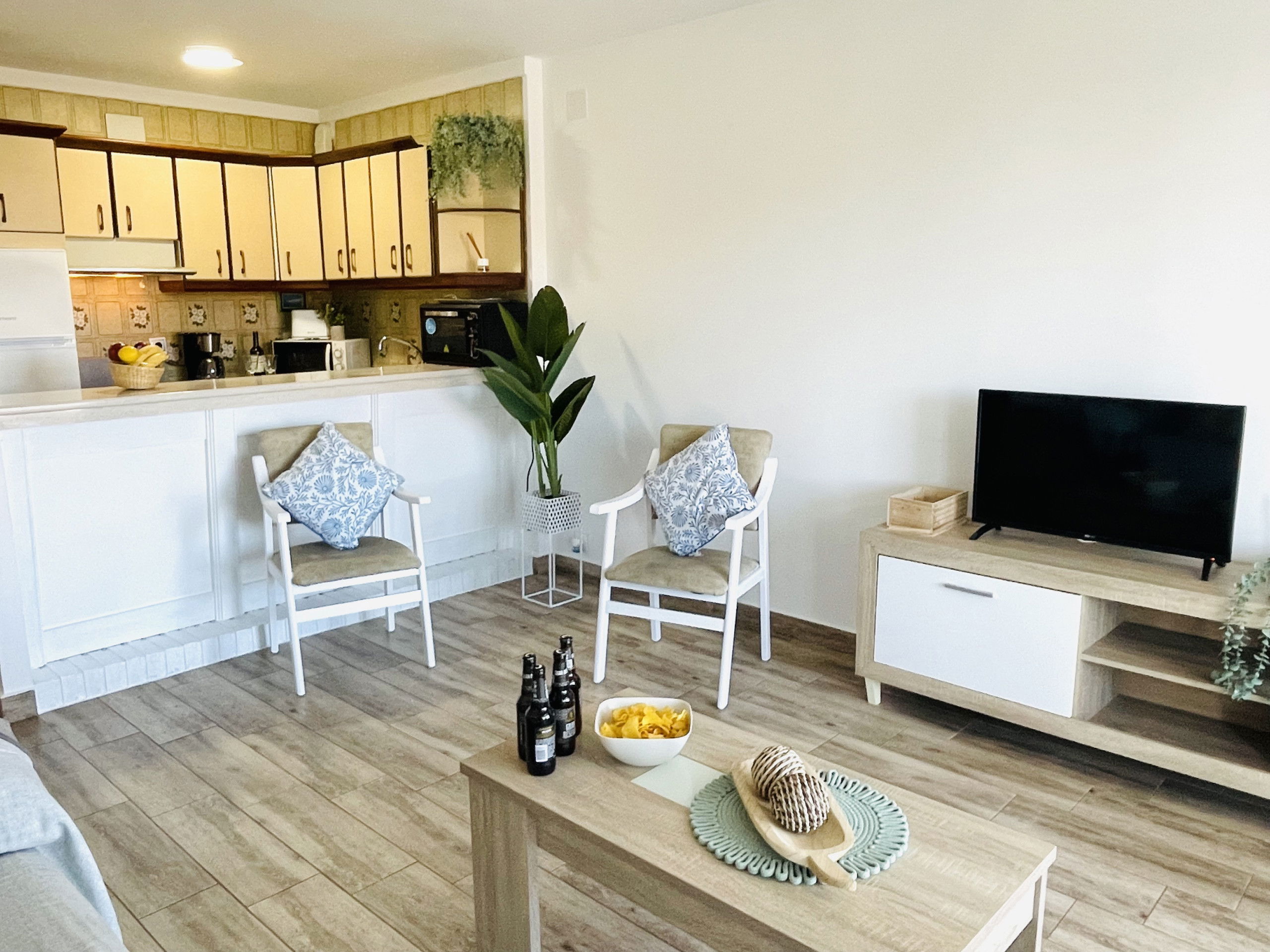 Le salon avec cuisine américaine entièrement équipée est spacieux et lumineux, équipé de climatisation, TV avec chaînes internationales, parfait pour profiter de votre séjour.