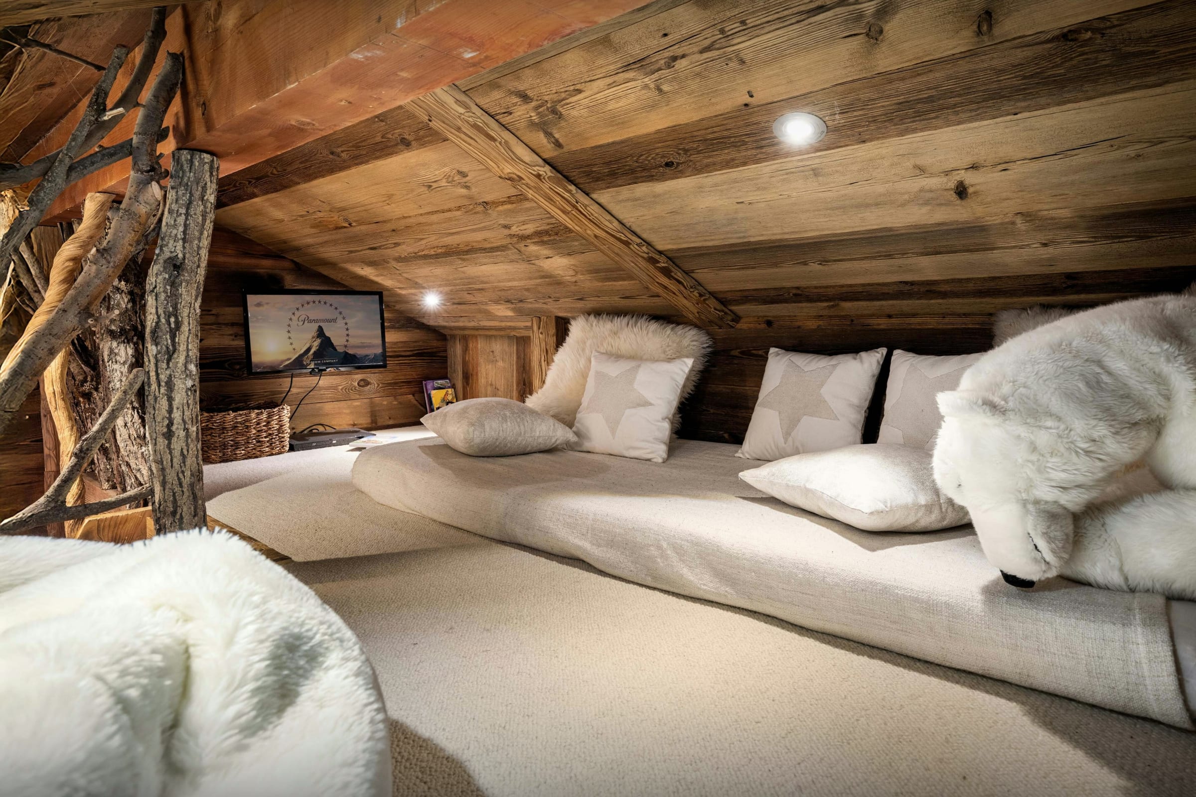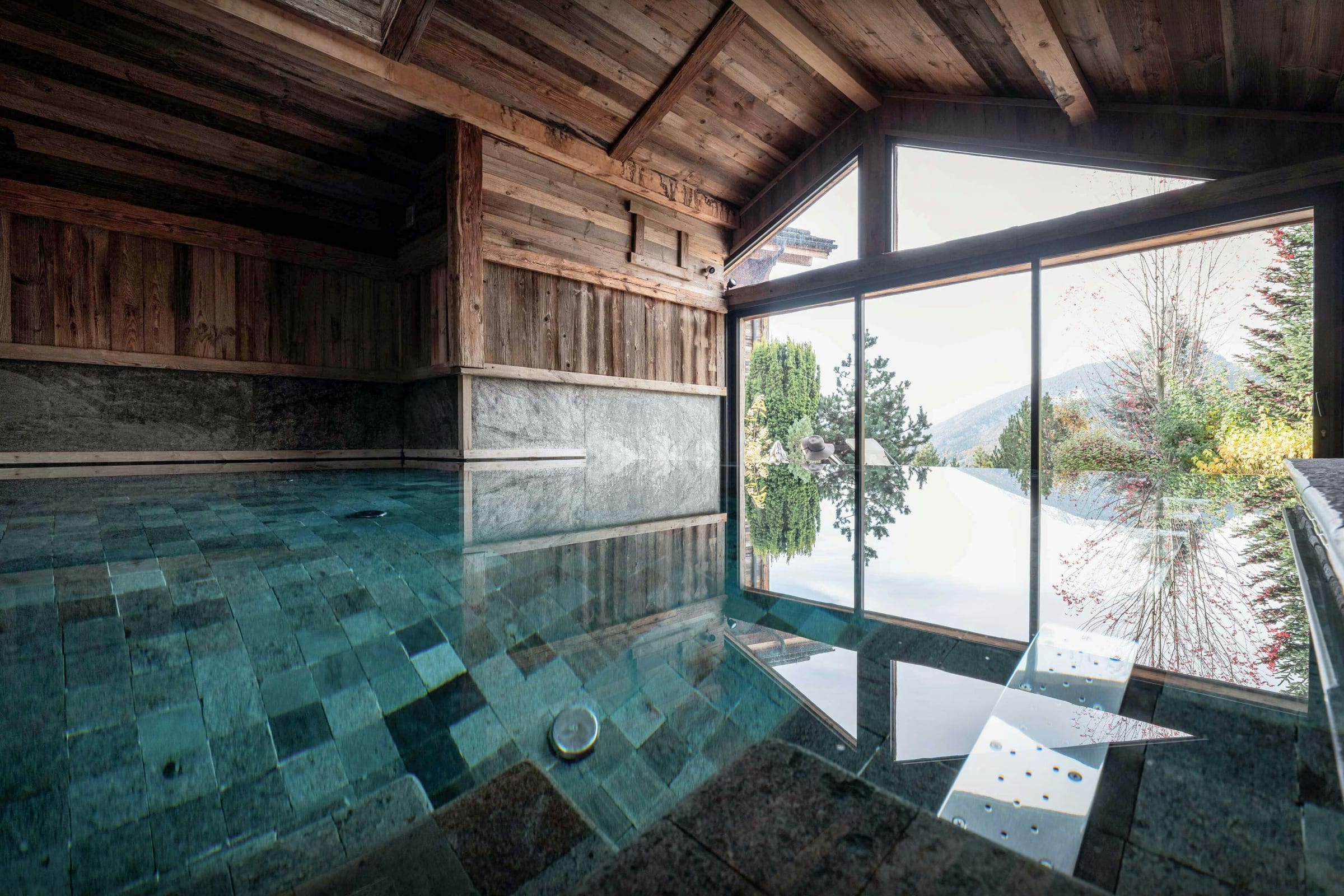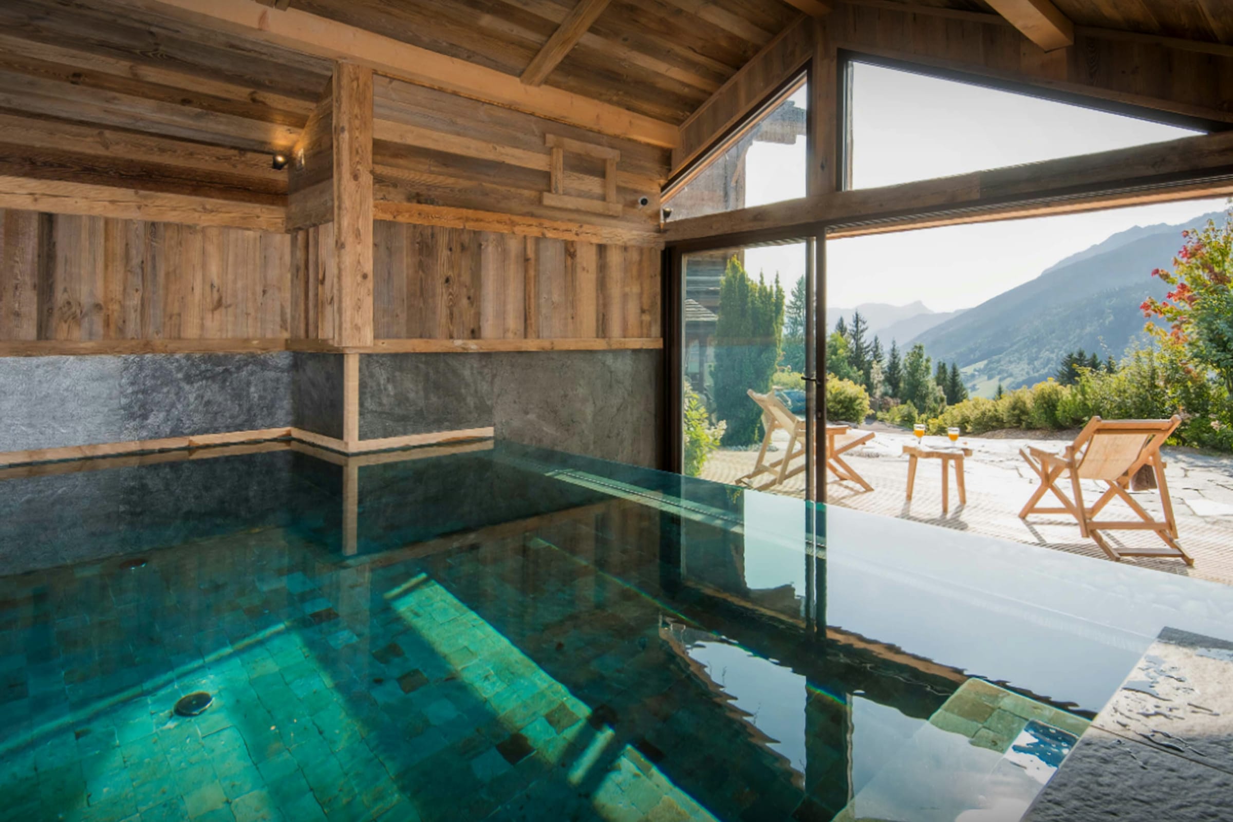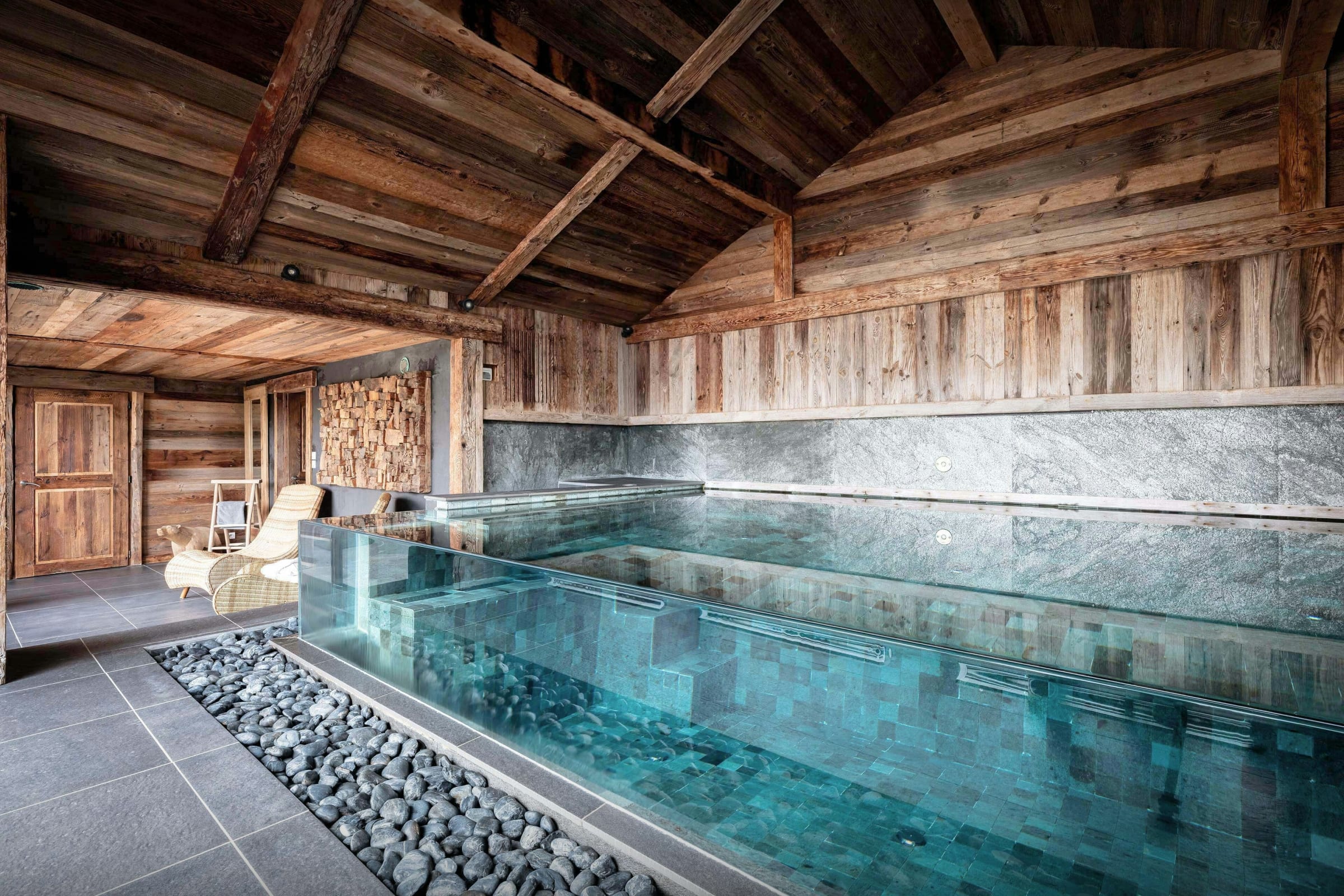 Aménagé à l’entrée, le local à skis avec sèche-chaussures chauffant facilite chaque retour des pistes, tandis qu’à ce même niveau, la piscine intérieure révèle un superbe panorama sur les montagnes. La première chambre, accompagnée d’une salle de bains et aménagée en suite familiale, combine un lit double et un lit superposé pour deux enfants.
