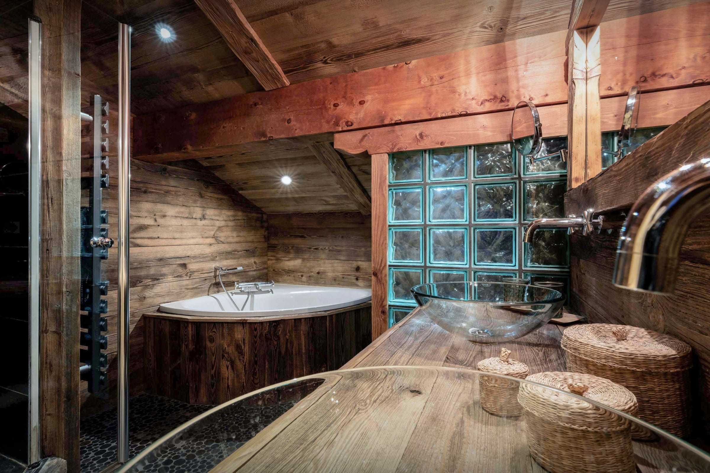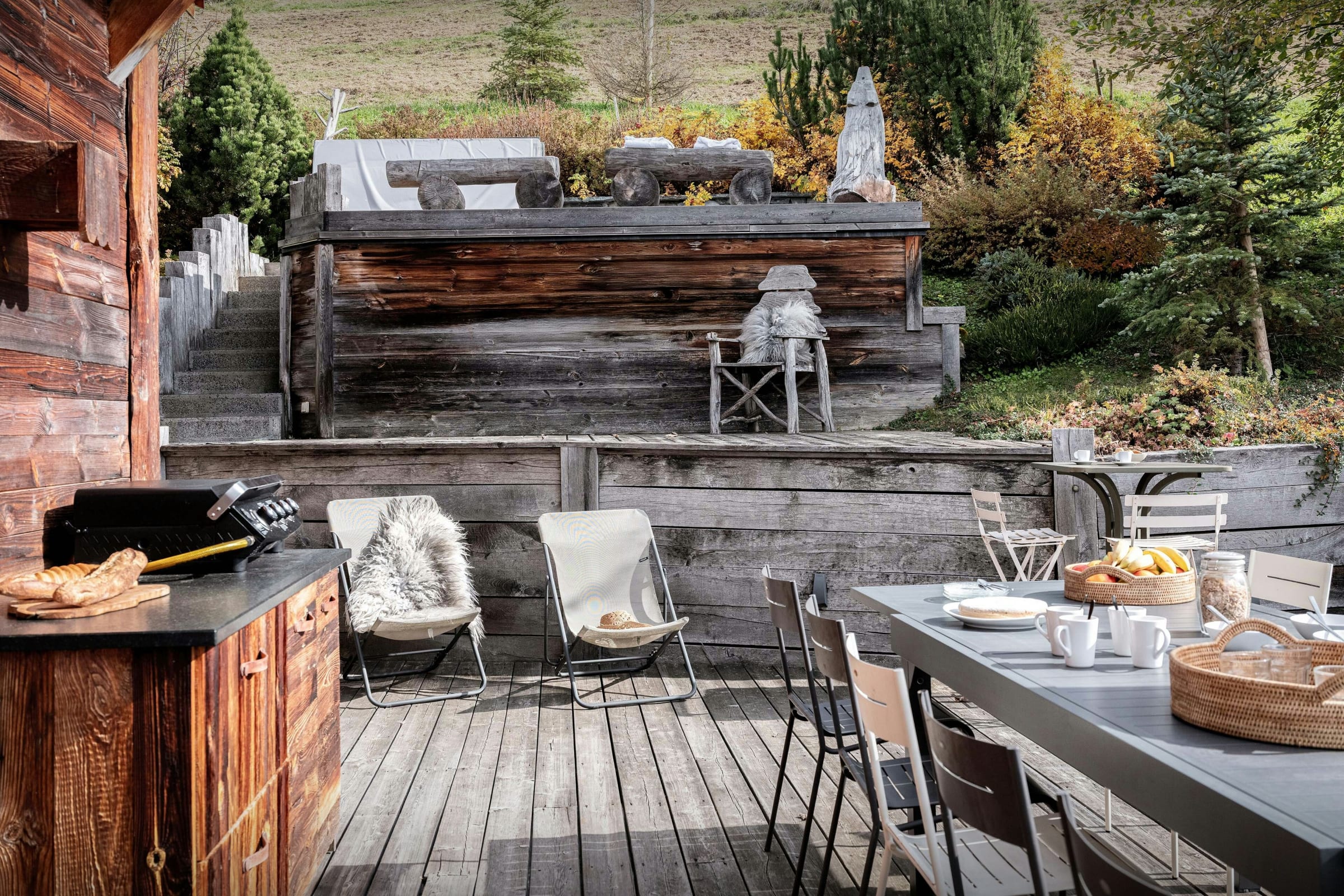 Une terrasse panoramique prolonge l’espace commun. Grande table conviviale, canapé d’extérieur et jacuzzi face aux cimes : tout y inspire la relaxation. Et comme si cela ne suffisait pas, un sauna se trouve également à cet étage.