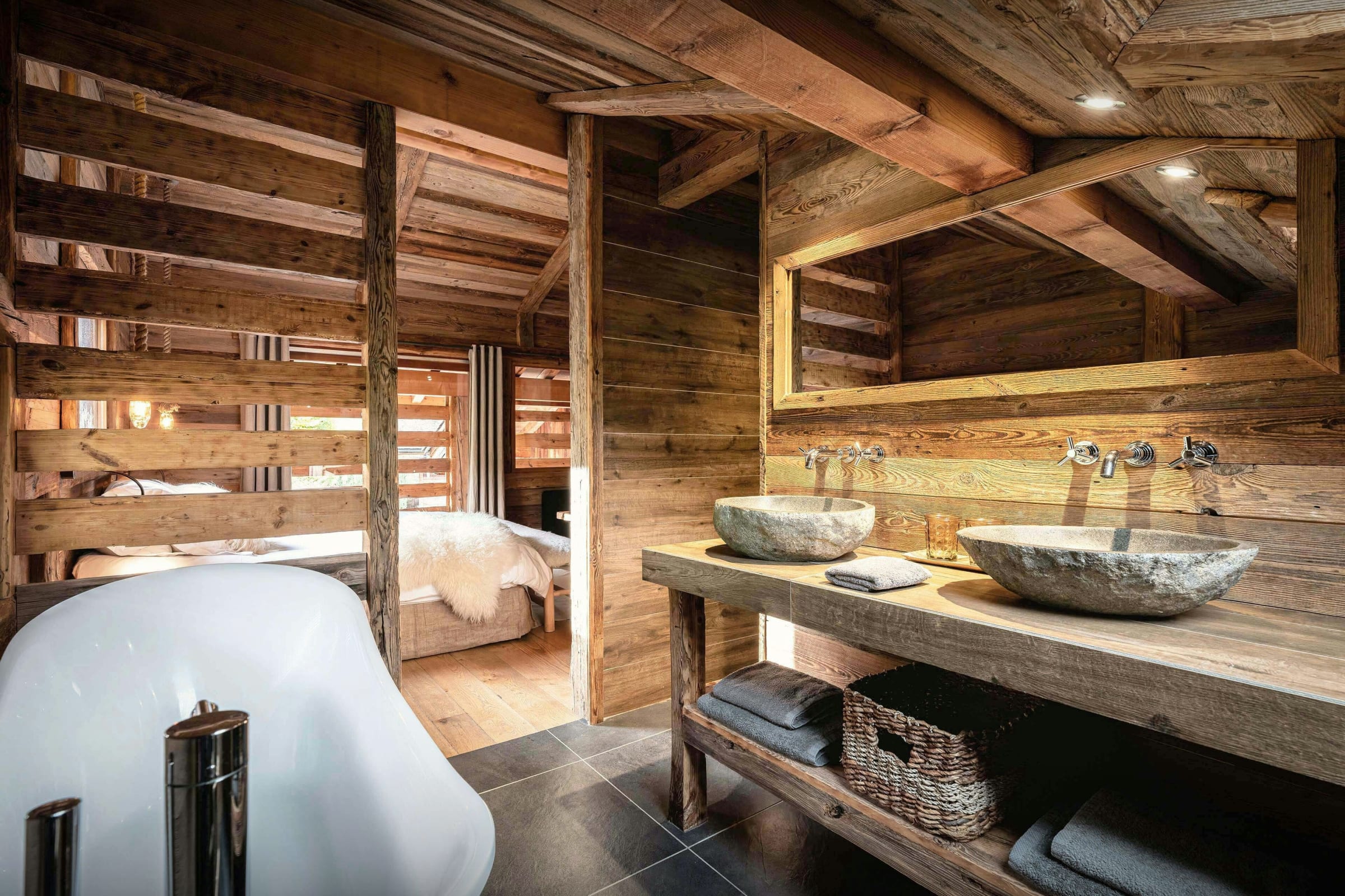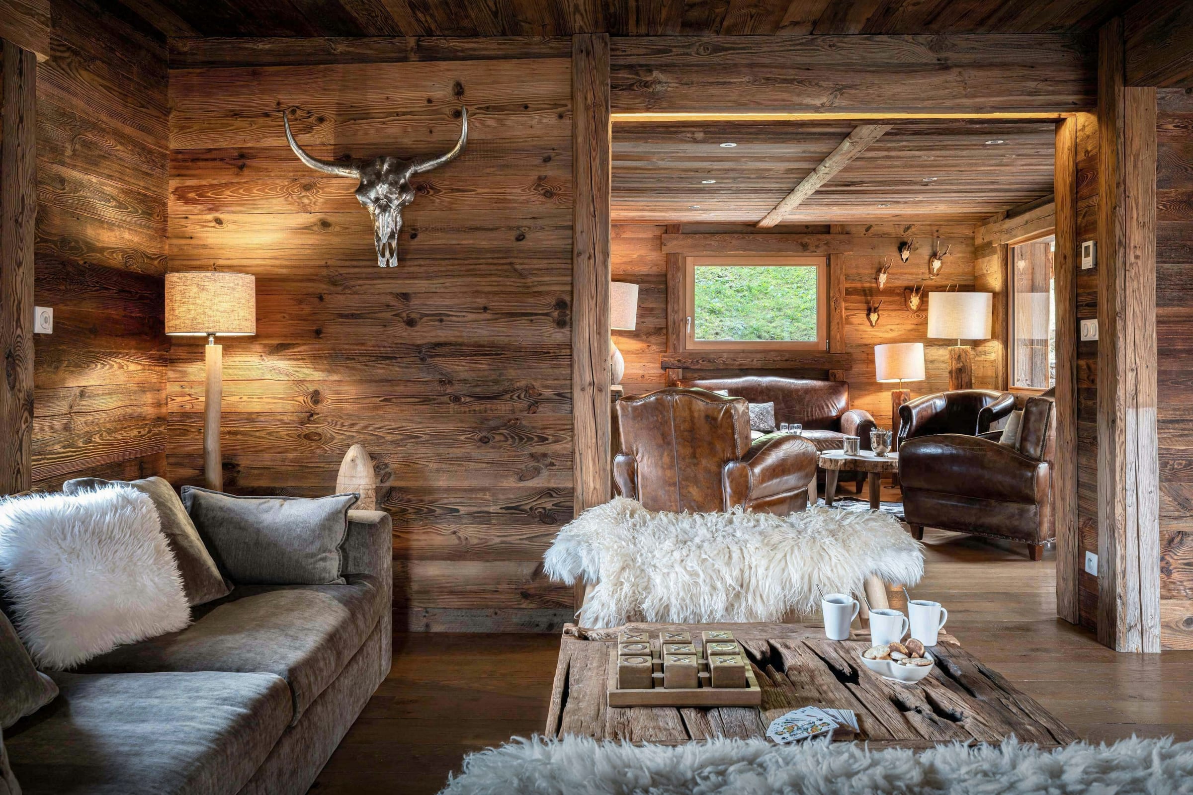 L’étage central est le cœur du chalet. Il est constitué d'une vaste pièce de vie au décor raffiné, divisée en deux salons et réchauffée par une cheminée centrale. Un second salon offre une ambiance plus intime, idéale pour lire ou partager un verre. La cuisine est entièrement équipée et la table à manger est spacieuse.