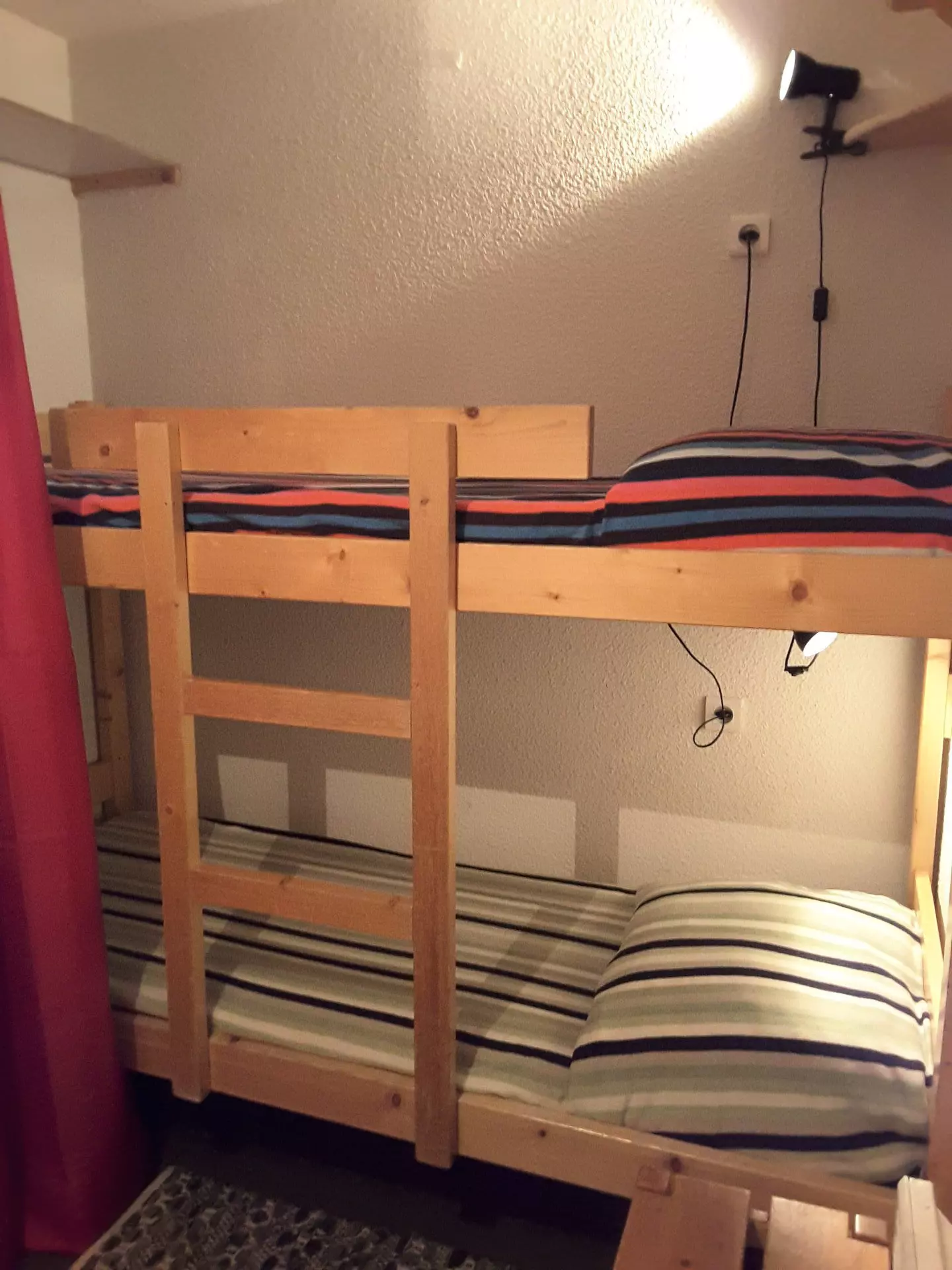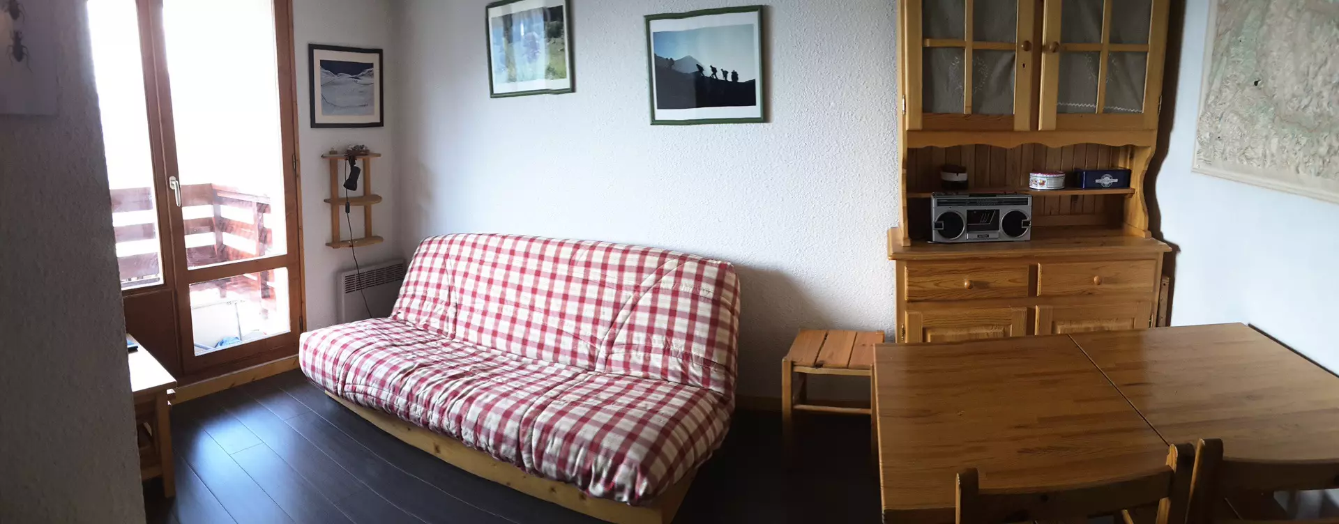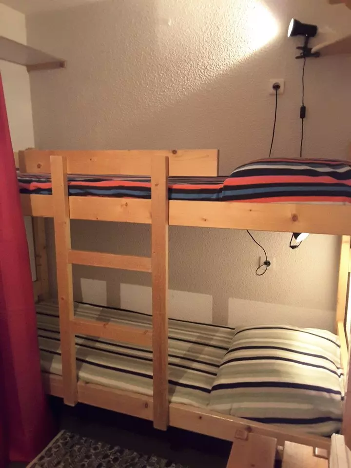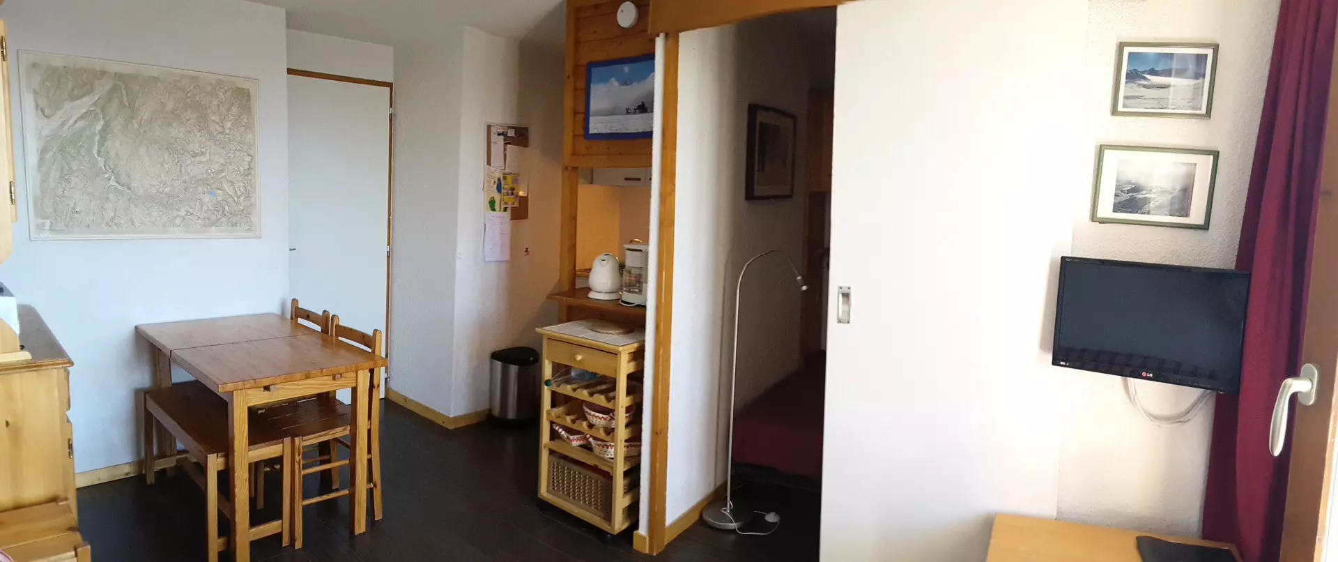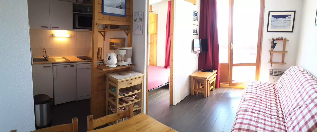 Il est composé d'un séjour avec coin cuisine , un balcon sud/ouest offrant une belle vue dégagée, une salle de bain avec baignoire et WC séparé, une cabine avec lit double (qui touche les murs sur 3 cotés) et un coin nuit dans l'entrée avec lits superposés.