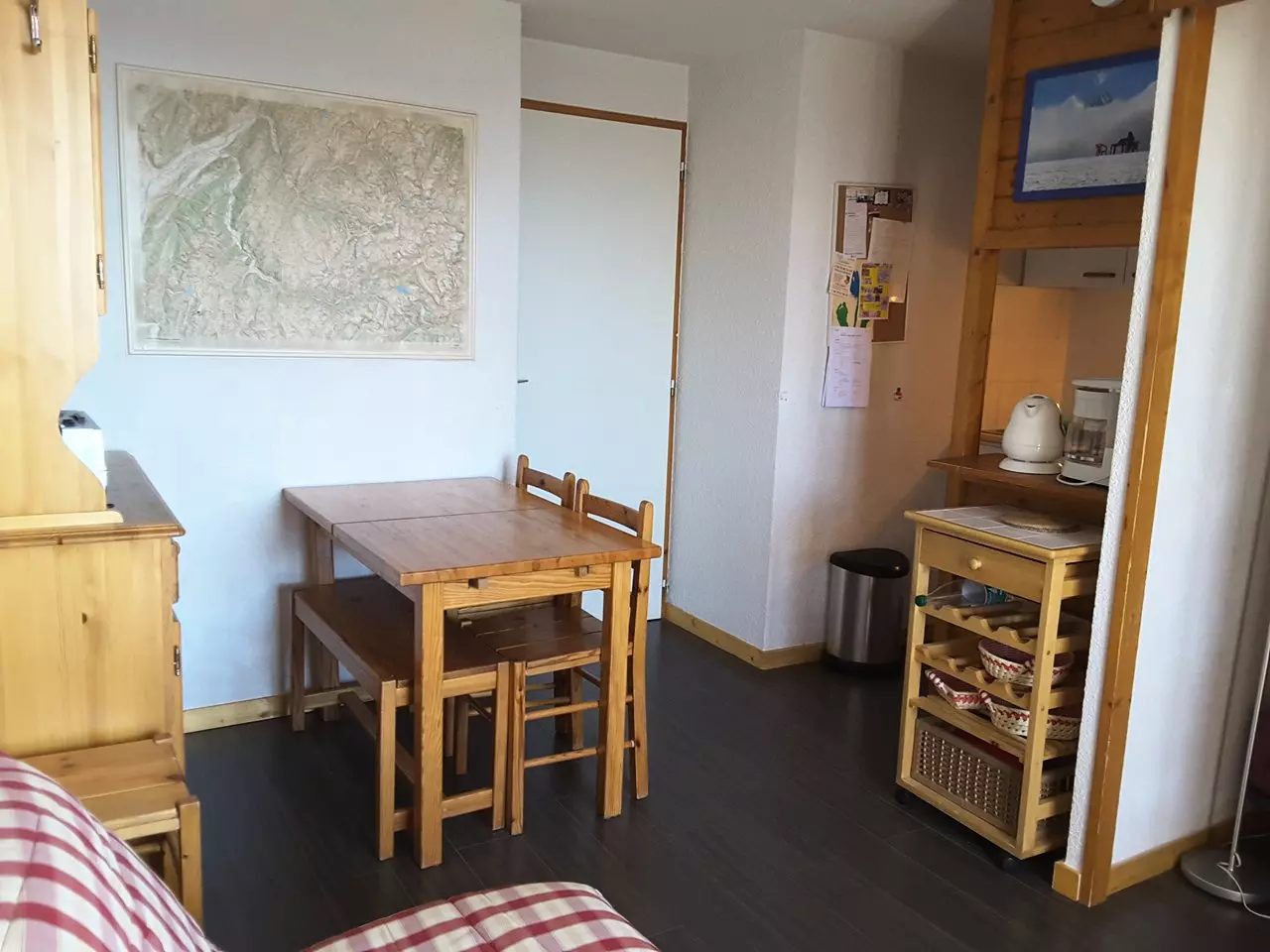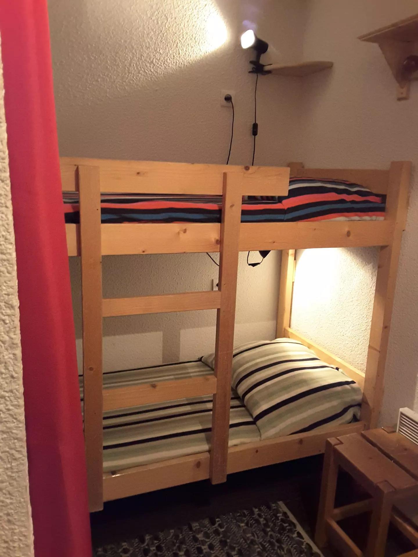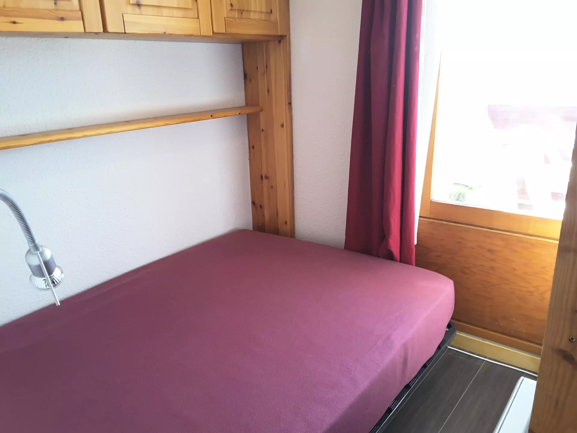 Il est composé d'un séjour avec coin cuisine , un balcon sud/ouest offrant une belle vue dégagée, une salle de bain avec baignoire et WC séparé, une cabine avec lit double (qui touche les murs sur 3 cotés) et un coin nuit dans l'entrée avec lits superposés.
