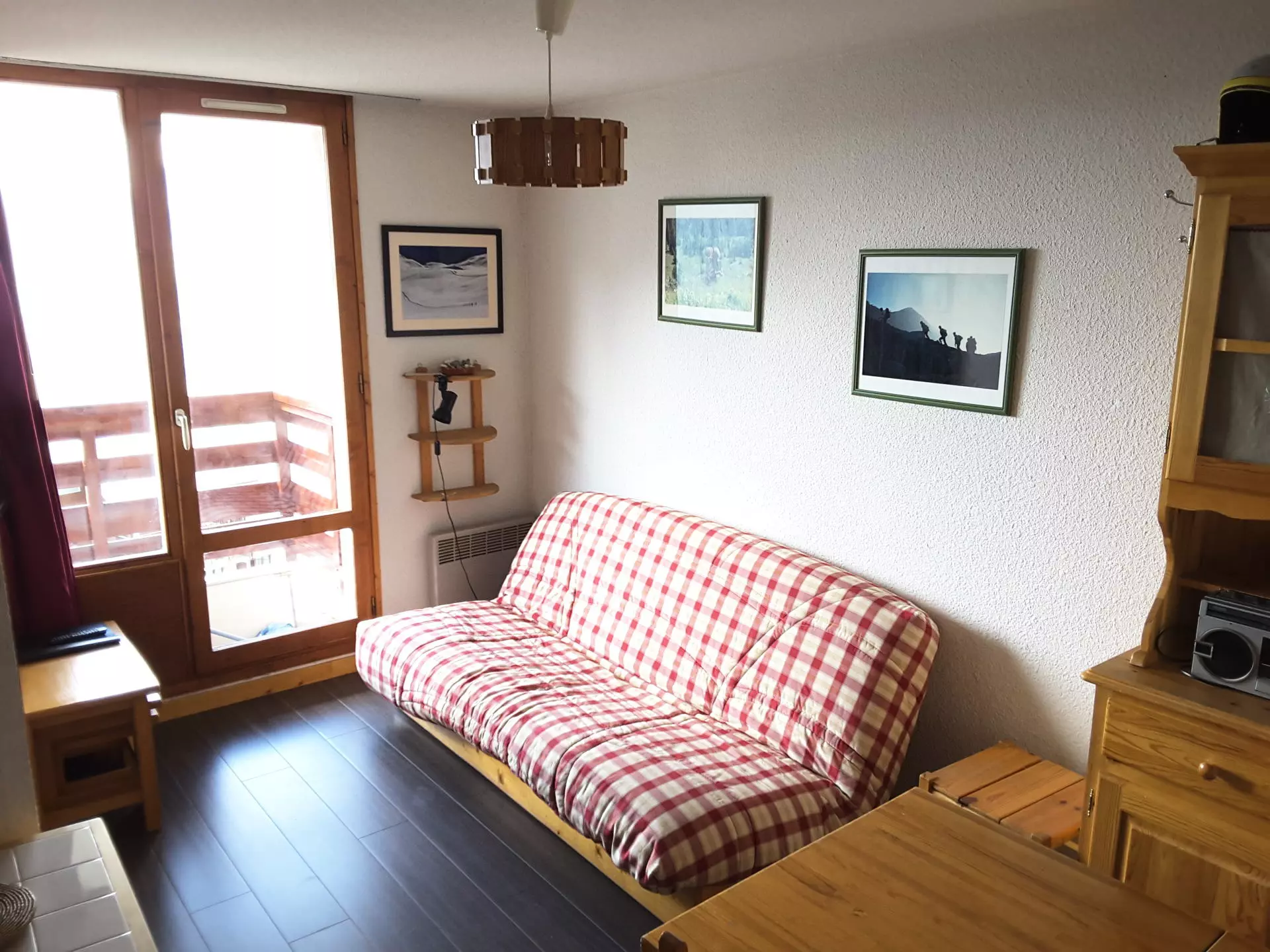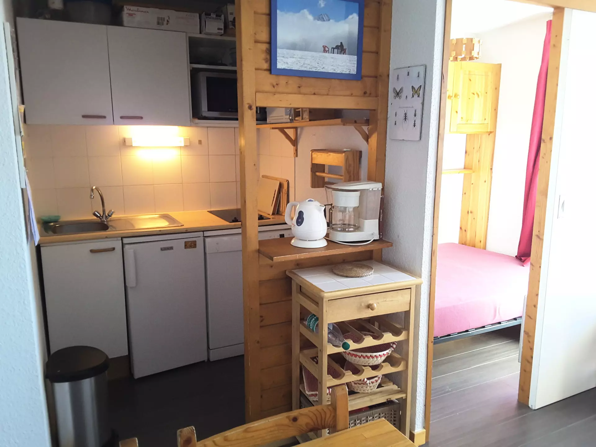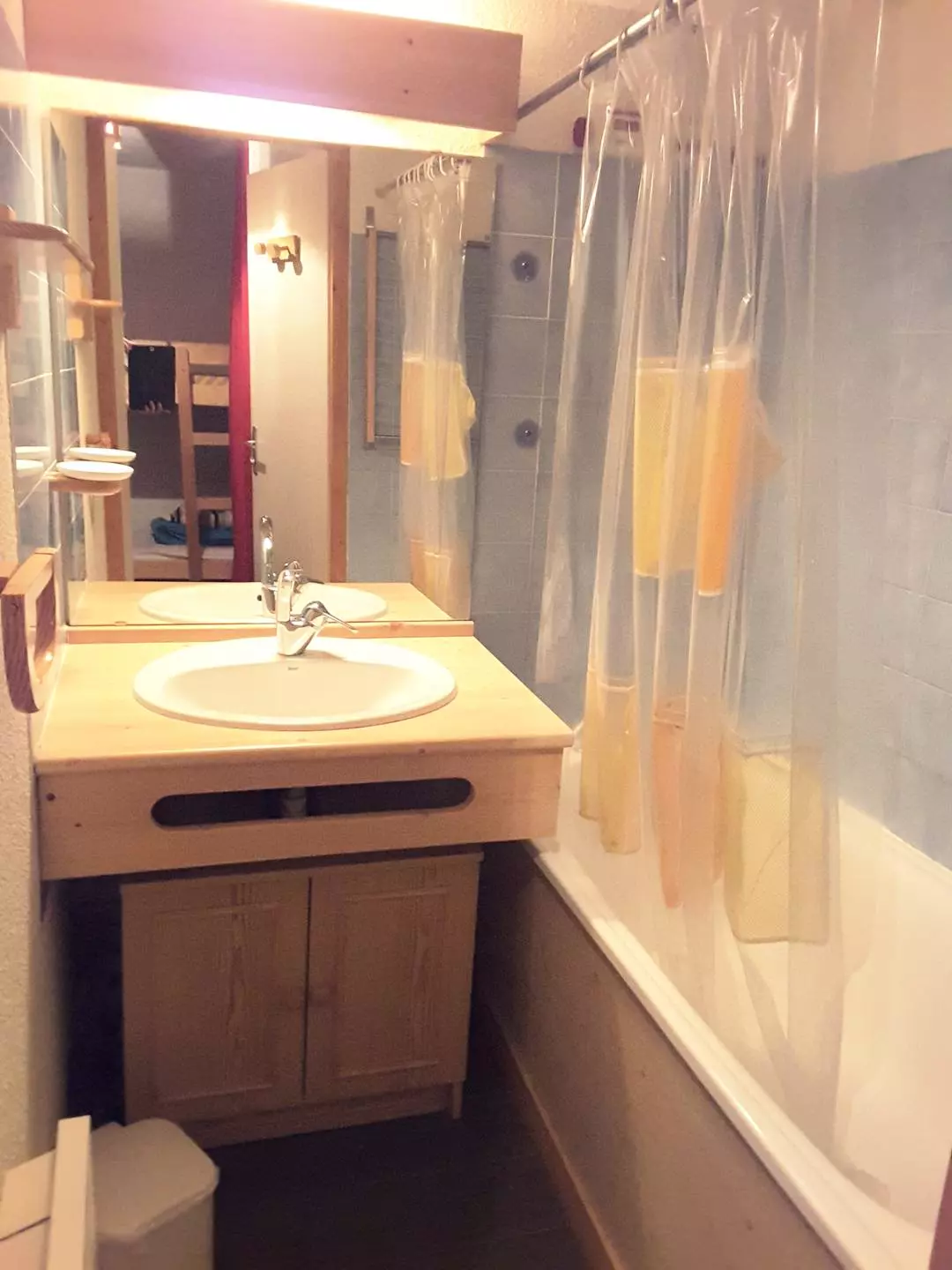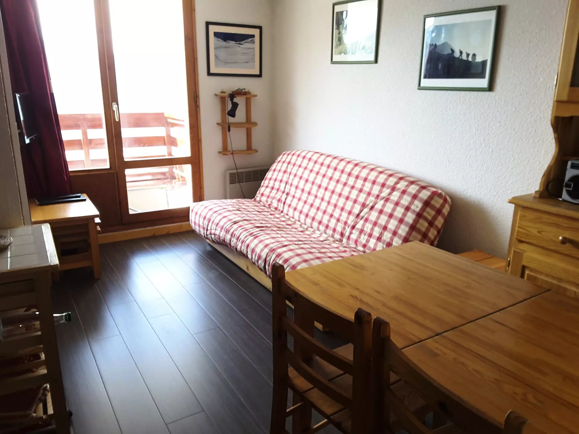 Il est composé d'un séjour avec coin cuisine , un balcon sud/ouest offrant une belle vue dégagée, une salle de bain avec baignoire et WC séparé, une cabine avec lit double (qui touche les murs sur 3 cotés) et un coin nuit dans l'entrée avec lits superposés.