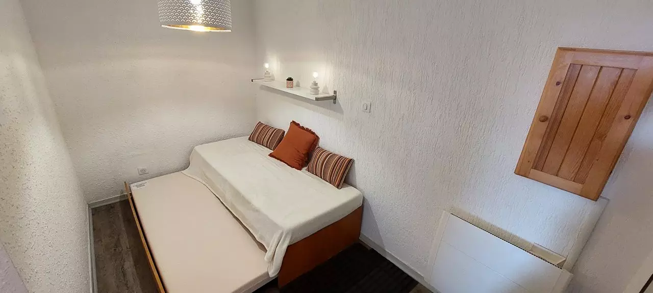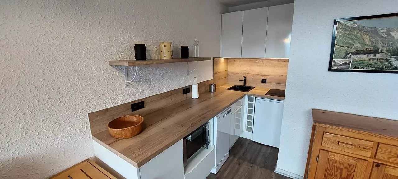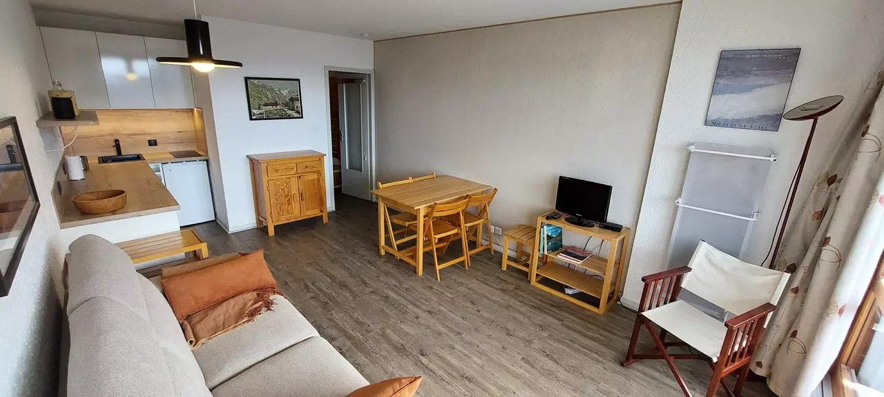 L'appartement est composé d'une entrée avec alcôve comprenant 1 ensemble de lits gigognes, une salle de douche avec wc, un coin cuisine ouvert (entièrement rénové) sur le séjour avec canapé convertible pour 2 personnes et d'un balcon exposé ouest qui vous offrira une vue magnifique sur toute la vallée.