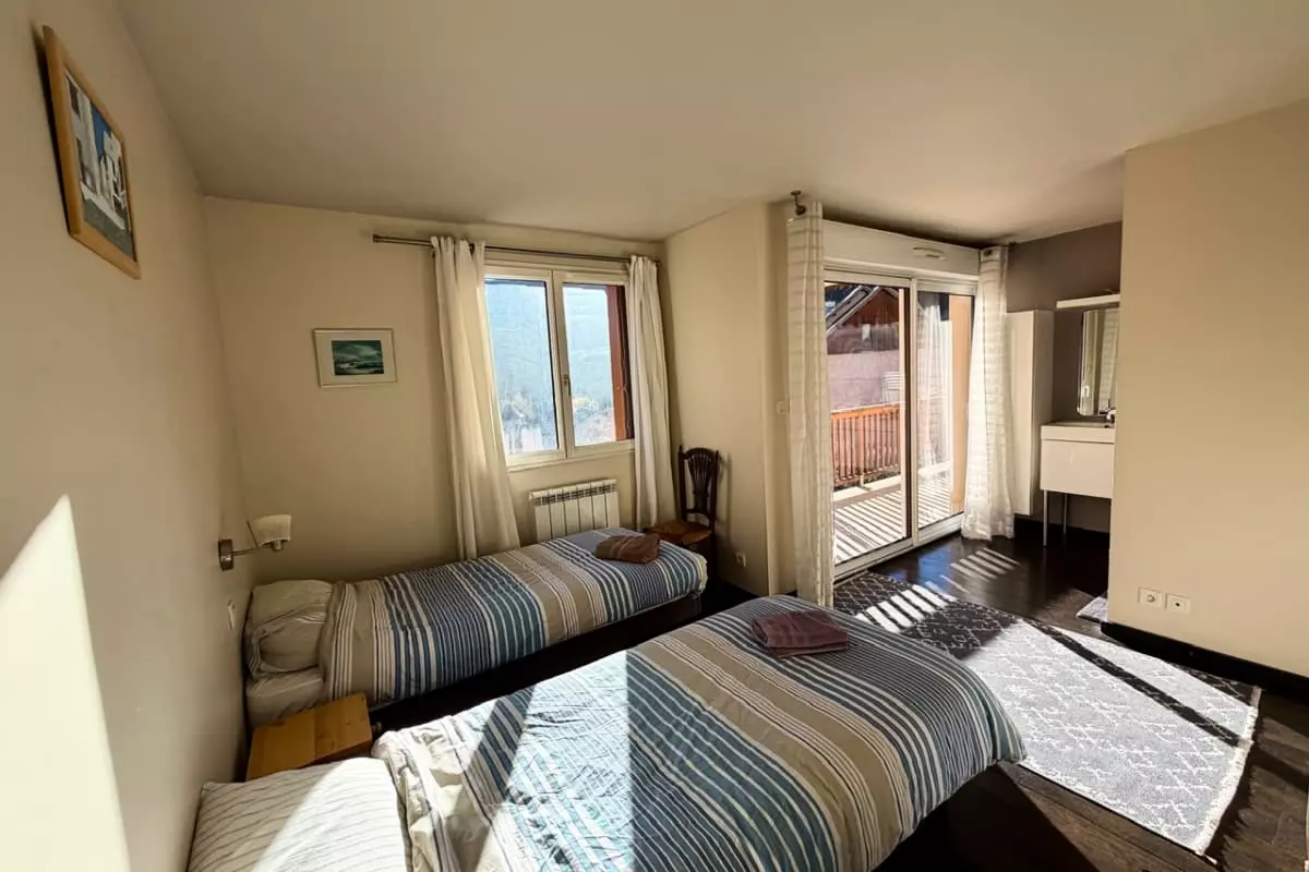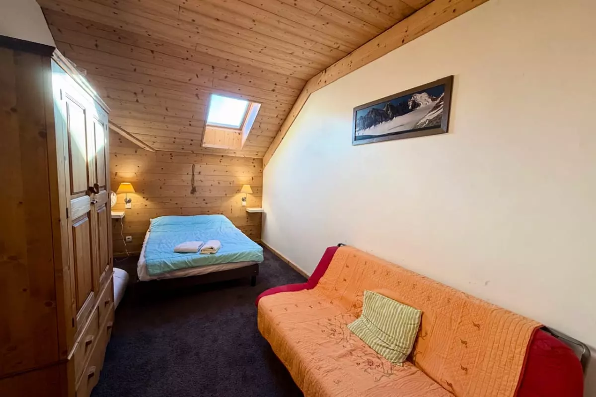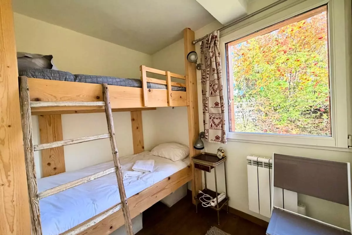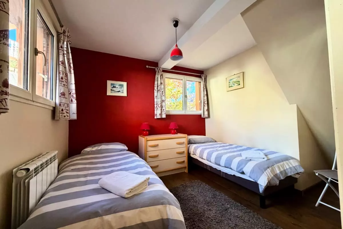 Il comprend une chambre avec un lit double de taille 140 x 190, deux chambres avec chacune deux lits doubles de taille 90 x 190, et une dernière chambre équipée d’un lit superposé de taille 90 x 190.