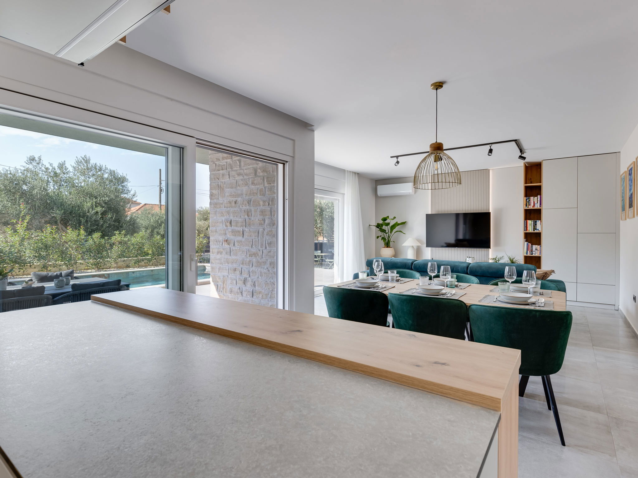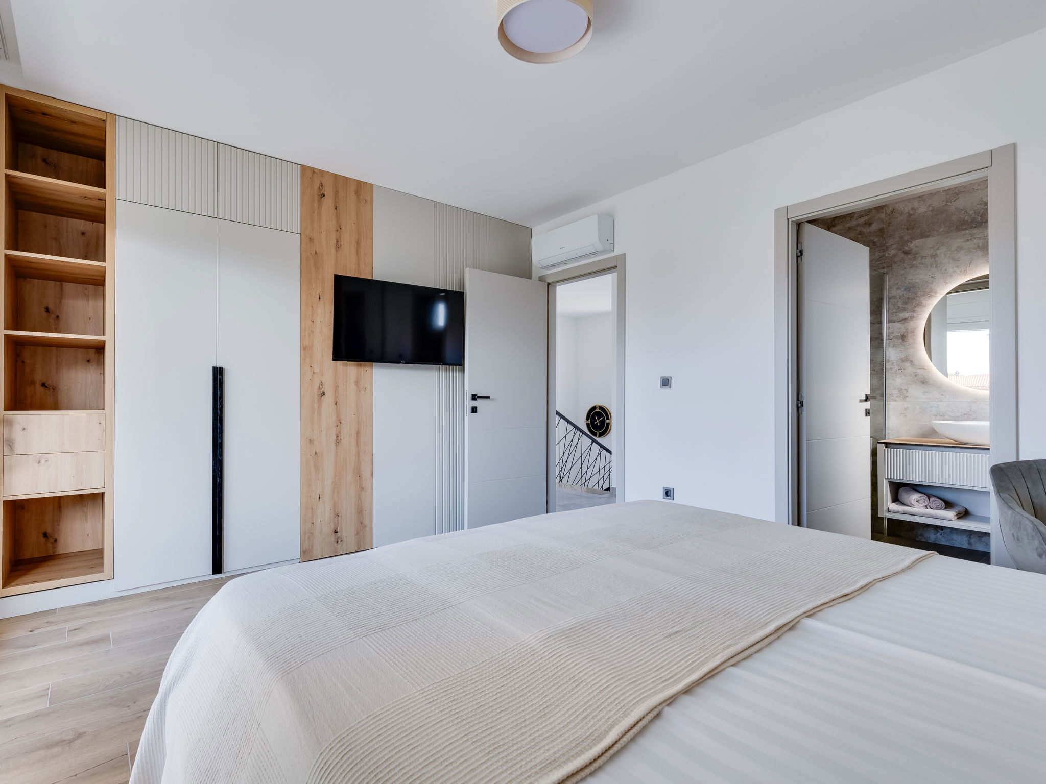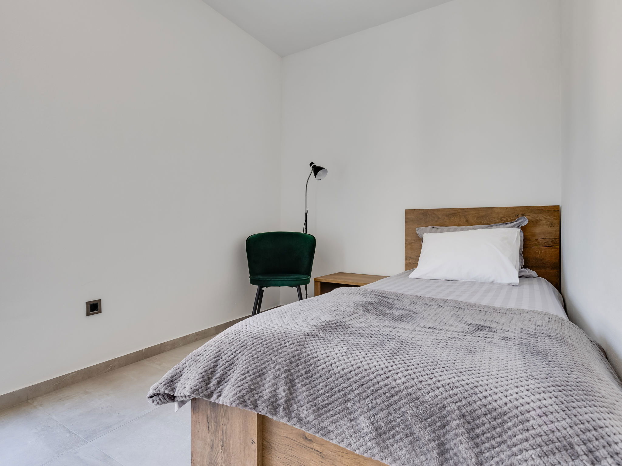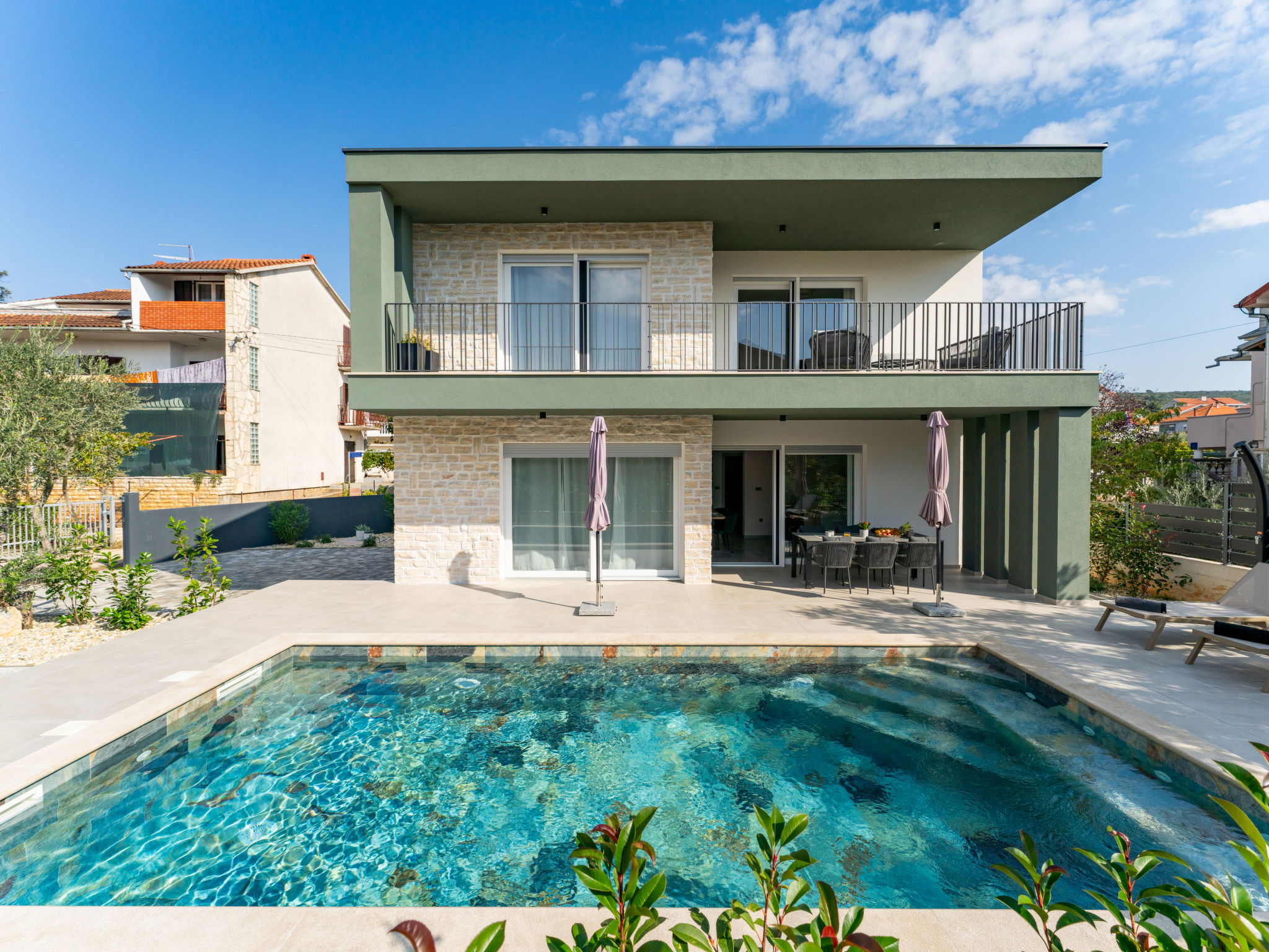 Maison 4 pièces 160 m2 sur 2 niveaux. Aménagement moderne: séjour/salle à manger avec TV (satellite) (écran plat), air-conditionné. Sortie sur la piscine. Cuisine ouverte (four, lave-vaisselle, 4 plaques à induction, congélateur, cafetière électrique). Douche/WC. À l'étage supérieur: 2 chambres, chaque chambre avec: 1 grand-lit (160 cm, longueur 200 cm), douche/WC et TV (satellite) (écran plat), air-conditionné. Sortie sur la terrasse. 1 chambre avec 1 lit (120 cm, longueur 200 cm), TV (satellite) (écran plat), air-conditionné. Chauffage par le sol, chauffage à air chaud. Balcon 15 m2. Chaises longues (5). A disposition: Internet (Connexion WIFI, gratuit). Veuillez noter: maison non-fumeur.