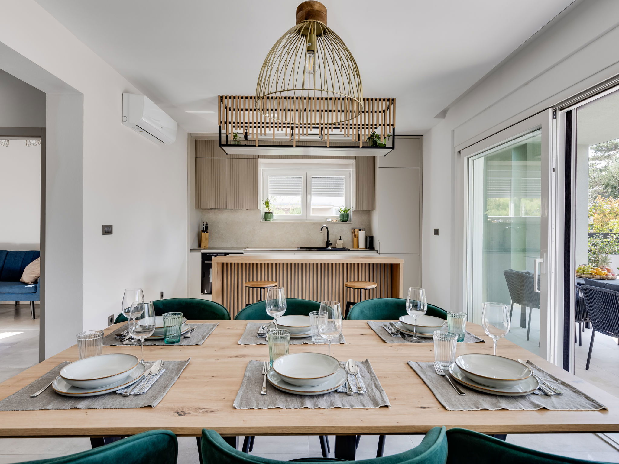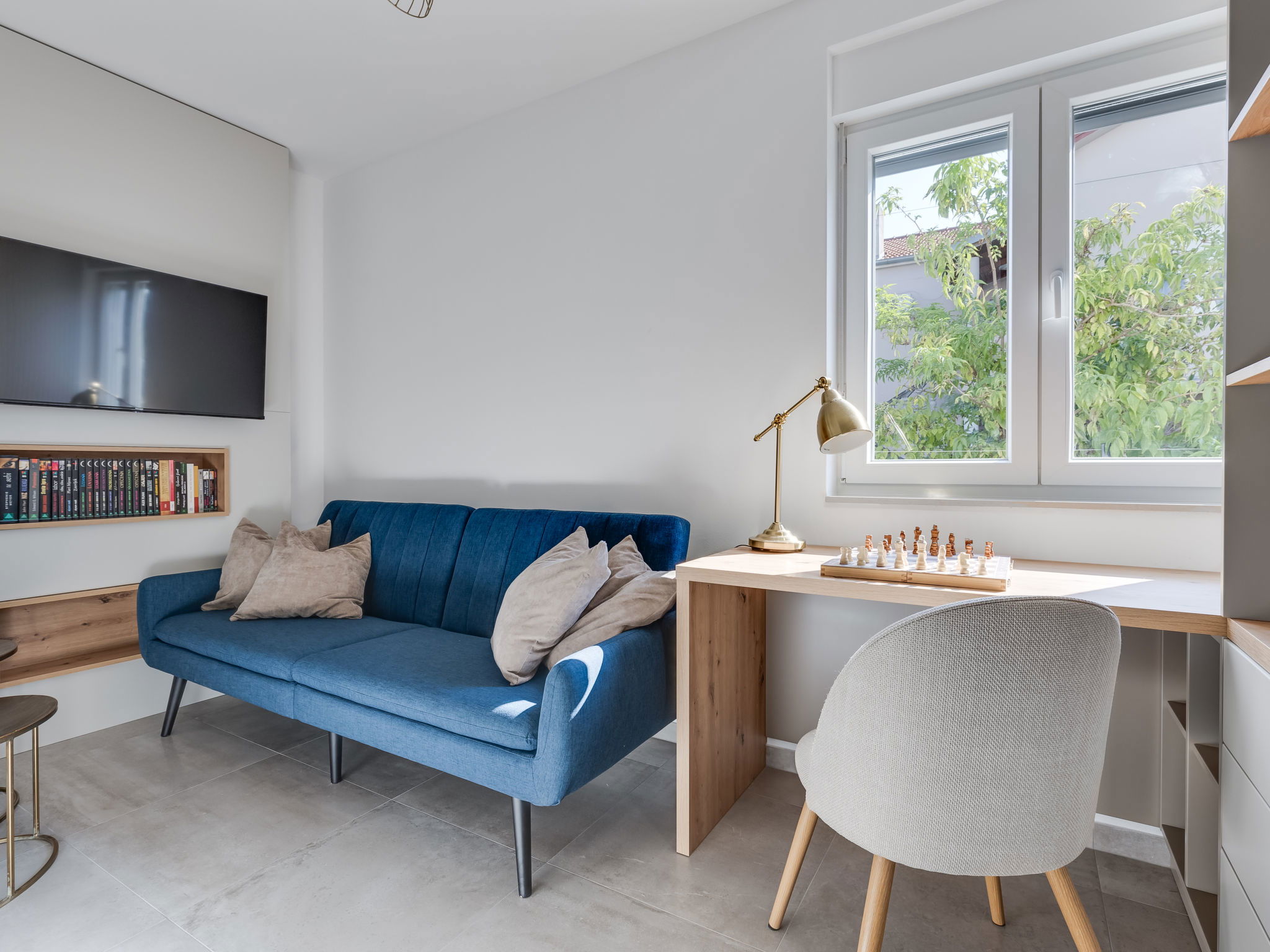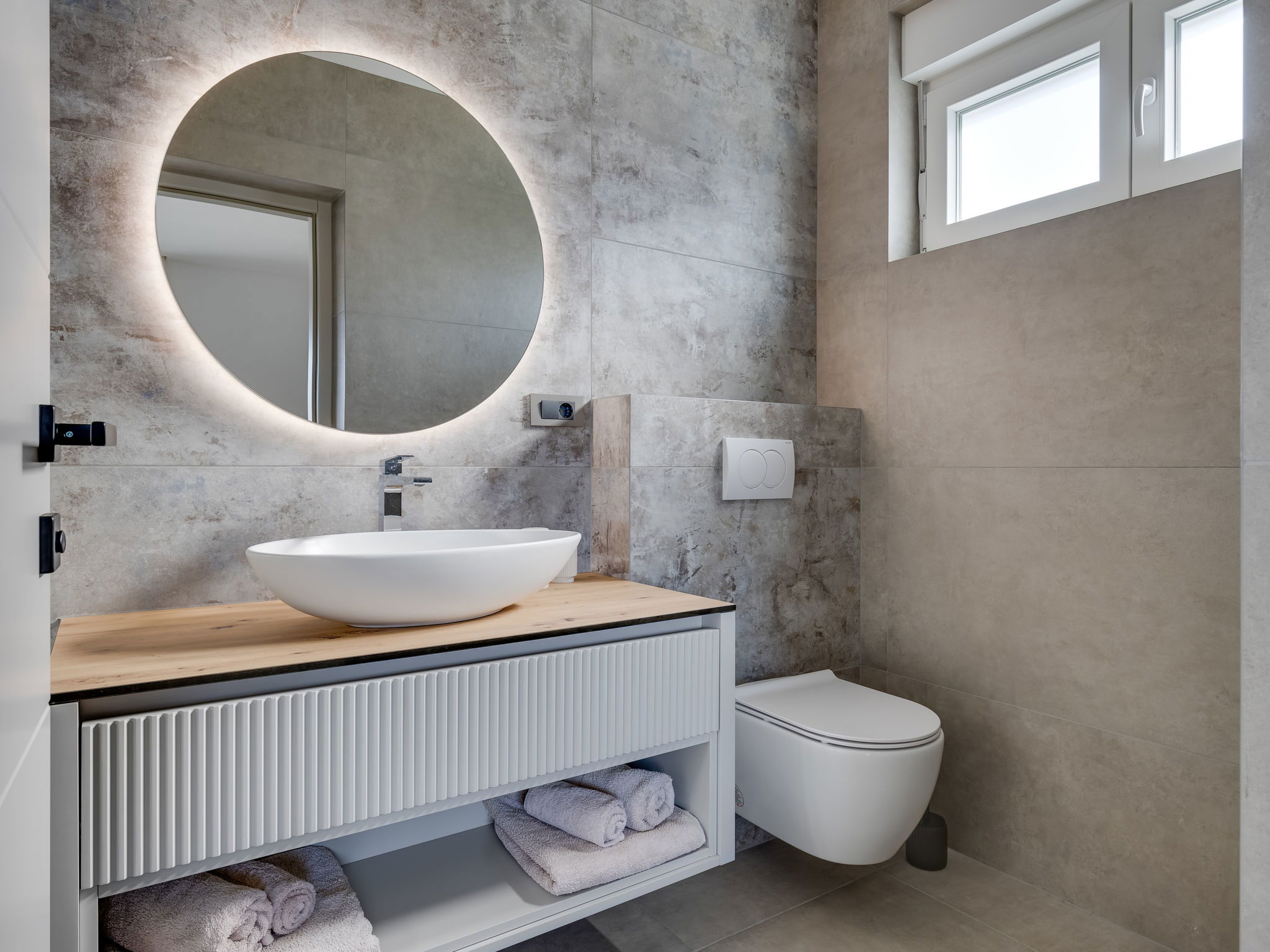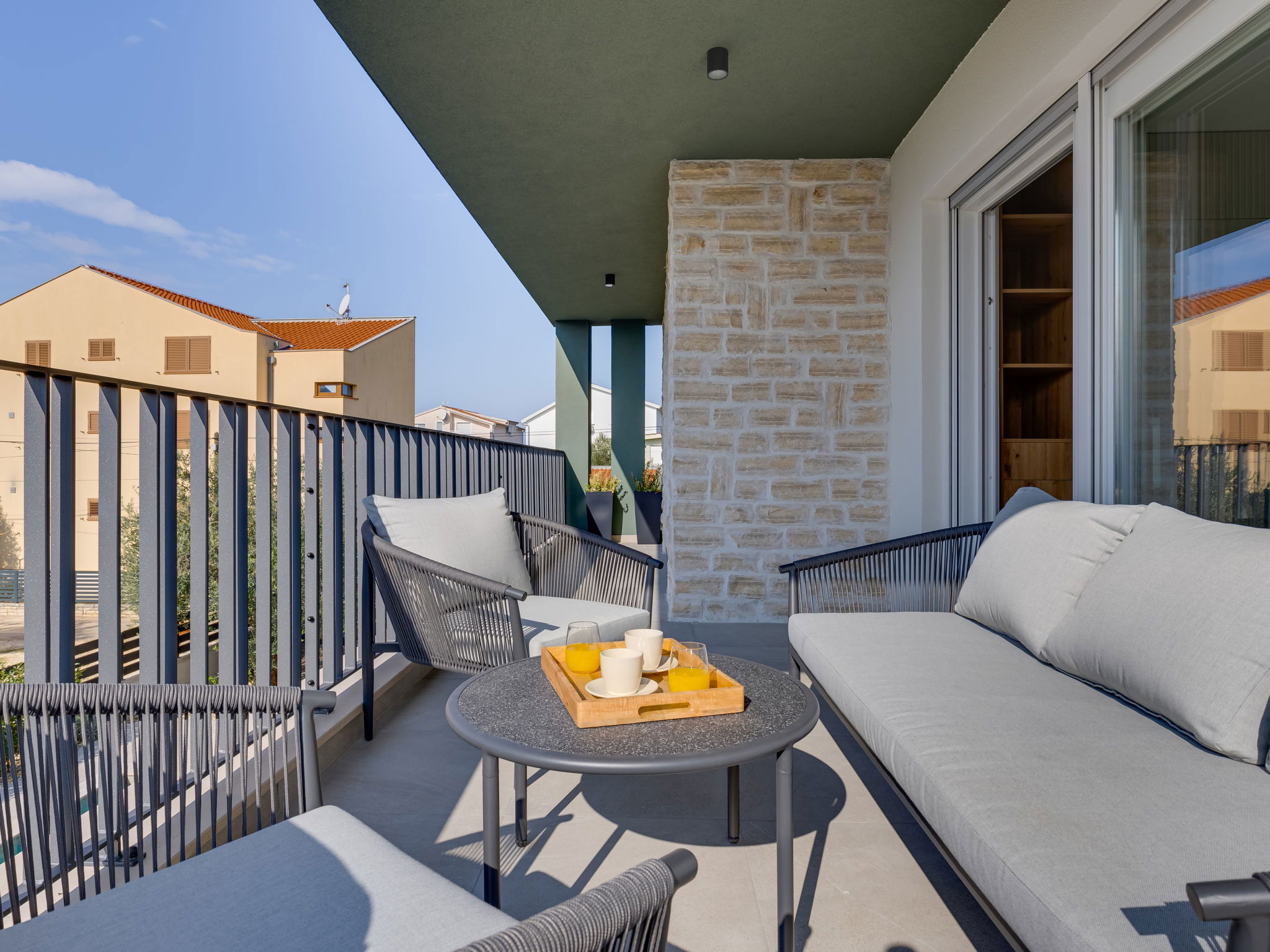 Maison 4 pièces 160 m2 sur 2 niveaux. Aménagement moderne: séjour/salle à manger avec TV (satellite) (écran plat), air-conditionné. Sortie sur la piscine. Cuisine ouverte (four, lave-vaisselle, 4 plaques à induction, congélateur, cafetière électrique). Douche/WC. À l'étage supérieur: 2 chambres, chaque chambre avec: 1 grand-lit (160 cm, longueur 200 cm), douche/WC et TV (satellite) (écran plat), air-conditionné. Sortie sur la terrasse. 1 chambre avec 1 lit (120 cm, longueur 200 cm), TV (satellite) (écran plat), air-conditionné. Chauffage par le sol, chauffage à air chaud. Balcon 15 m2. Chaises longues (5). A disposition: Internet (Connexion WIFI, gratuit). Veuillez noter: maison non-fumeur.