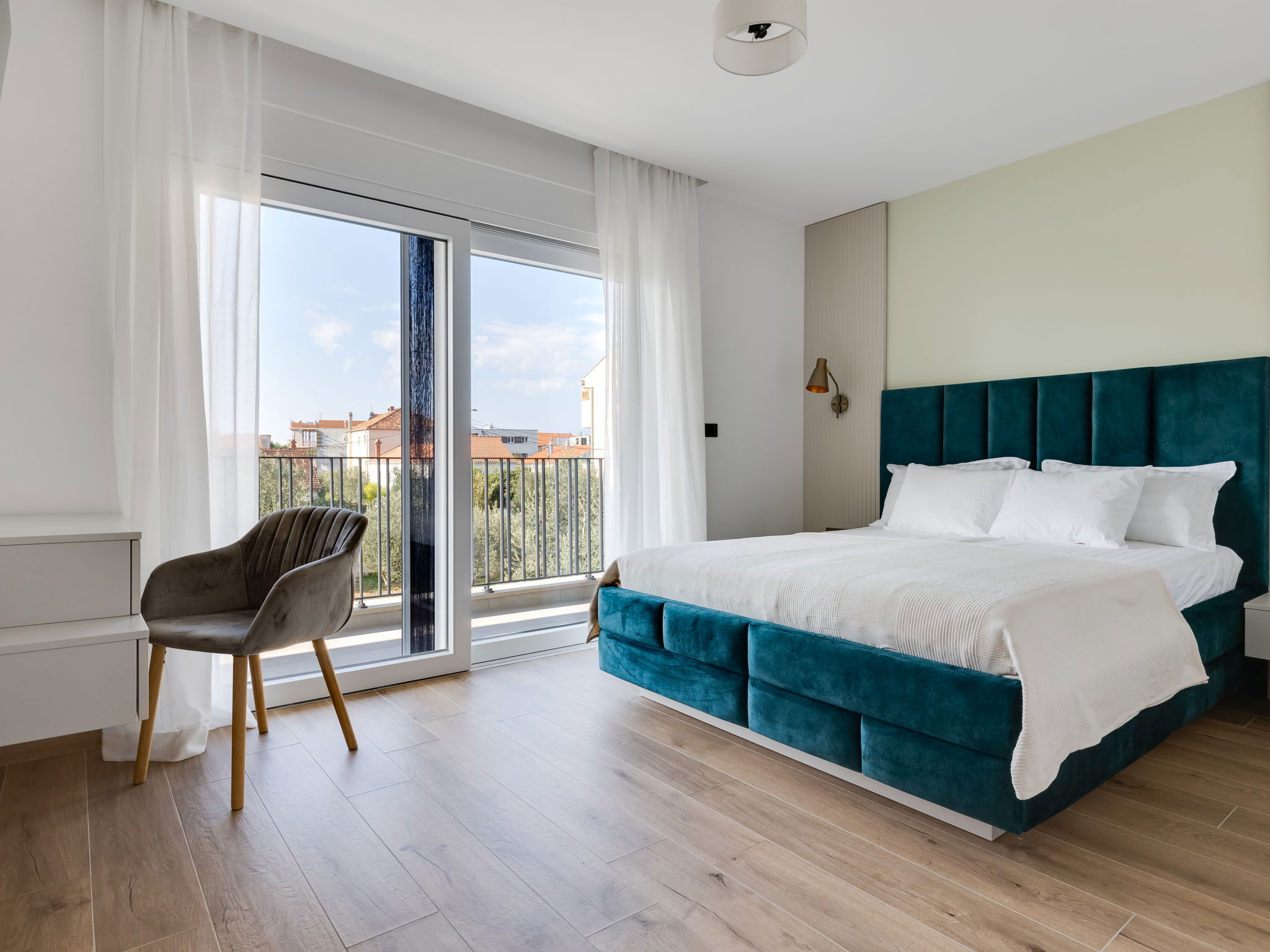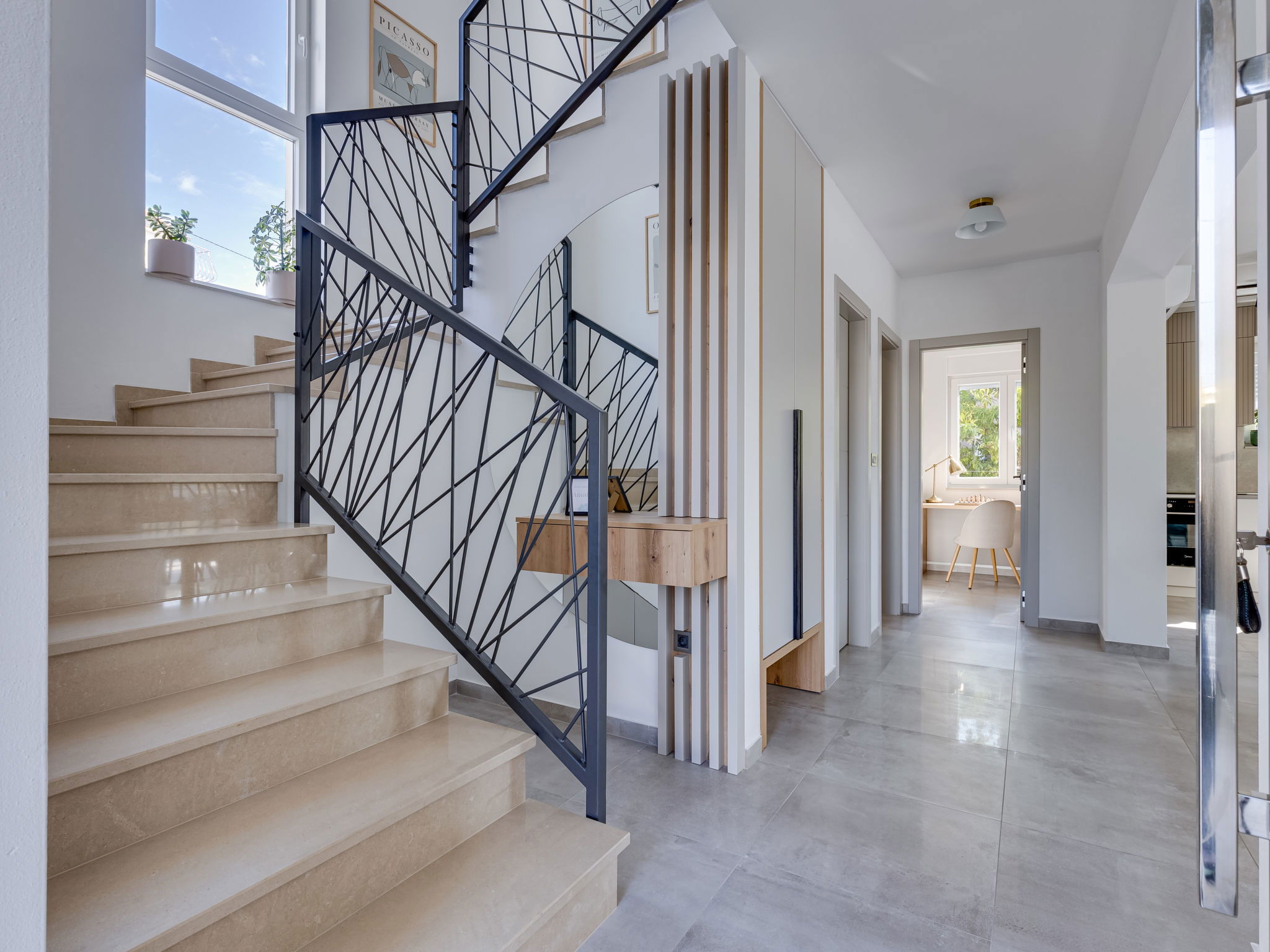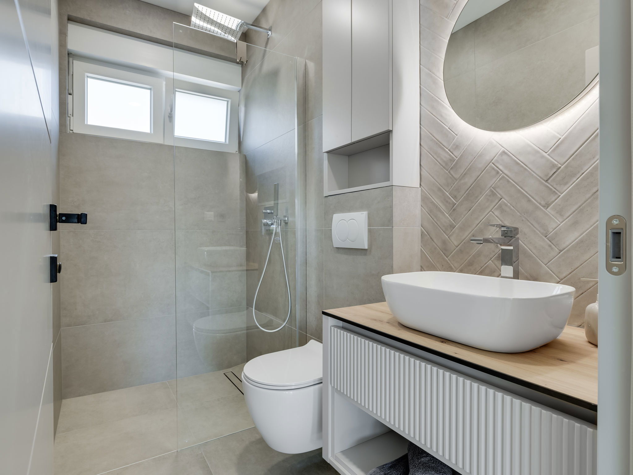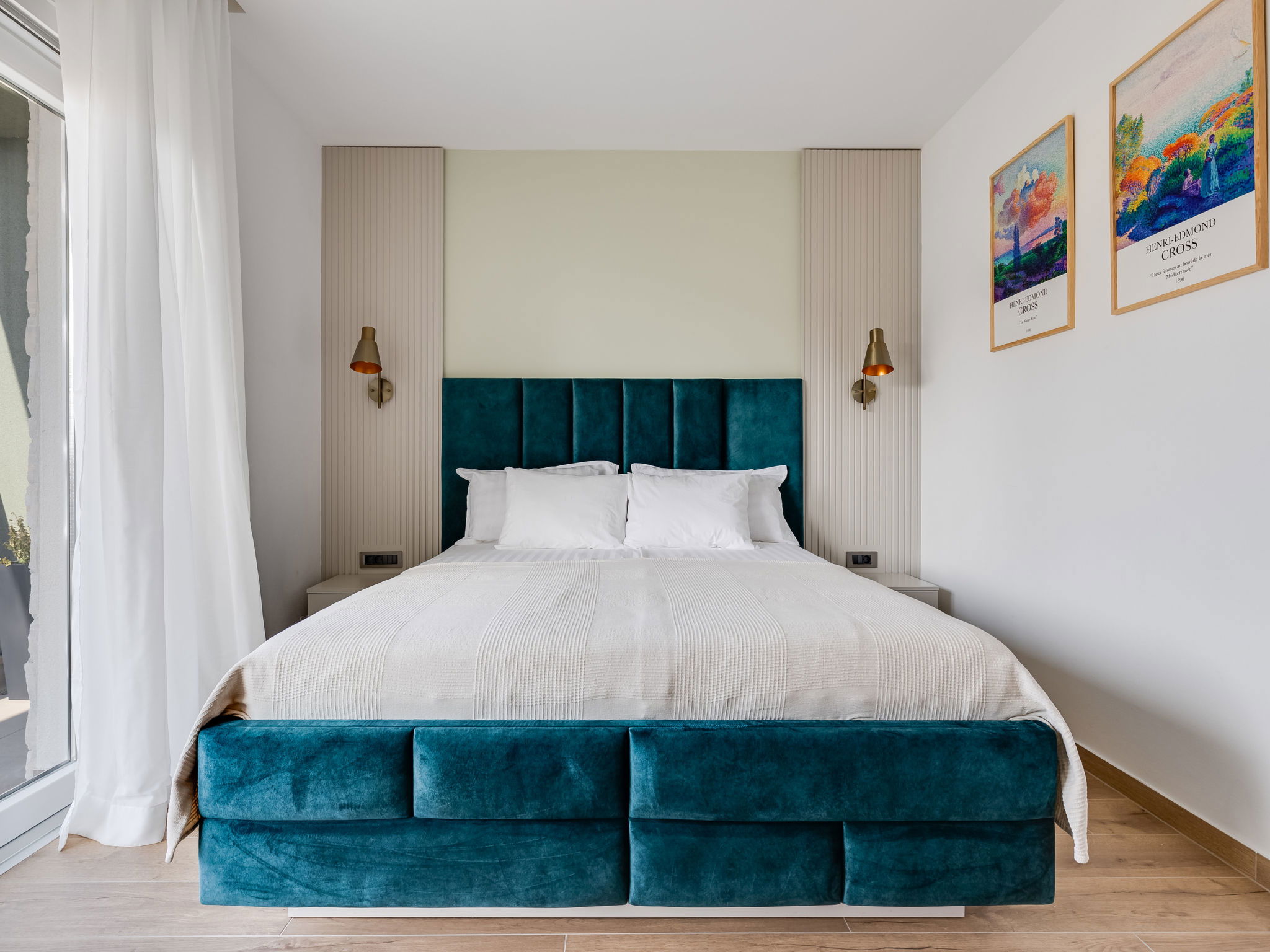 Maison 4 pièces 160 m2 sur 2 niveaux. Aménagement moderne: séjour/salle à manger avec TV (satellite) (écran plat), air-conditionné. Sortie sur la piscine. Cuisine ouverte (four, lave-vaisselle, 4 plaques à induction, congélateur, cafetière électrique). Douche/WC. À l'étage supérieur: 2 chambres, chaque chambre avec: 1 grand-lit (160 cm, longueur 200 cm), douche/WC et TV (satellite) (écran plat), air-conditionné. Sortie sur la terrasse. 1 chambre avec 1 lit (120 cm, longueur 200 cm), TV (satellite) (écran plat), air-conditionné. Chauffage par le sol, chauffage à air chaud. Balcon 15 m2. Chaises longues (5). A disposition: Internet (Connexion WIFI, gratuit). Veuillez noter: maison non-fumeur.