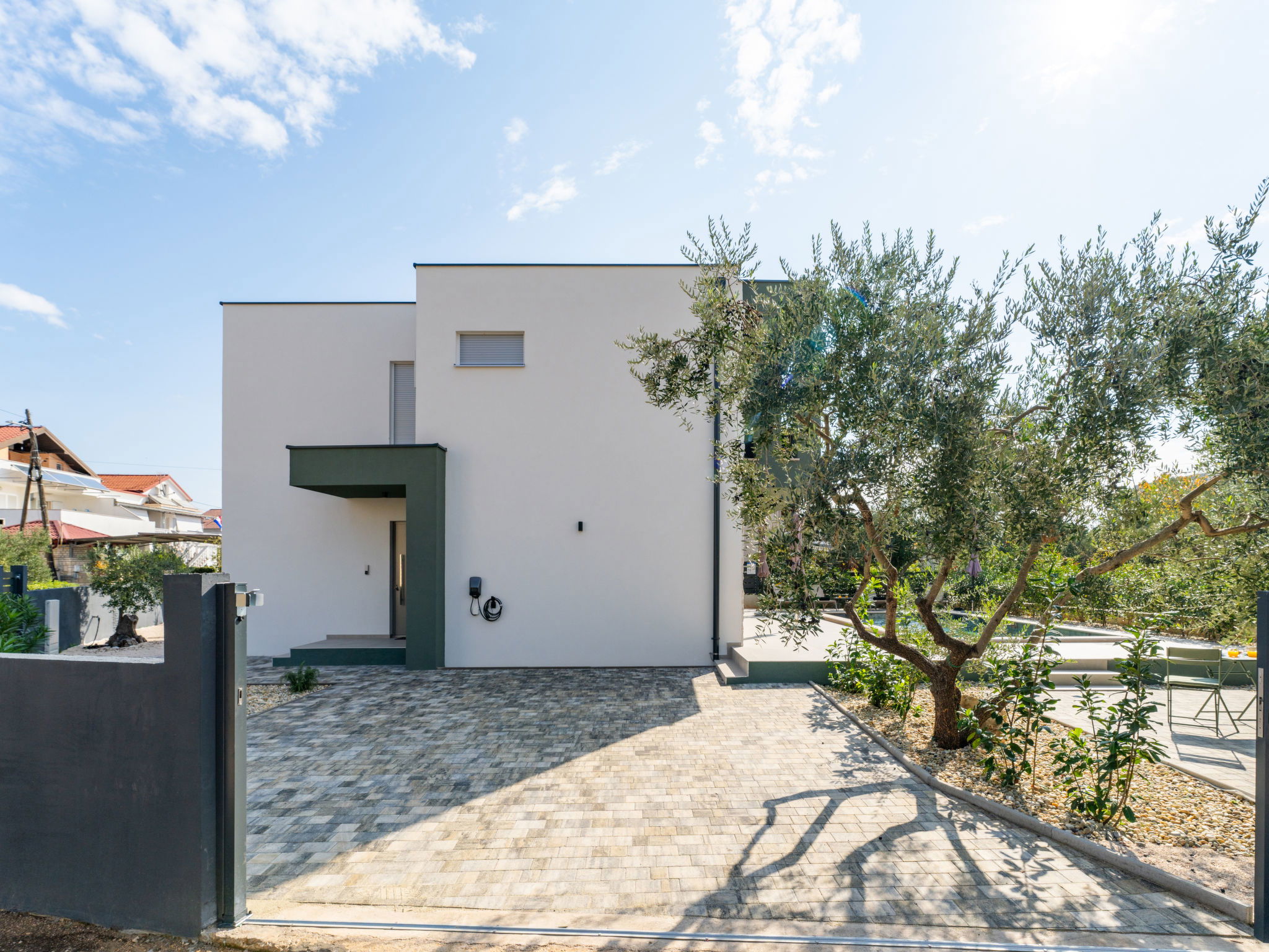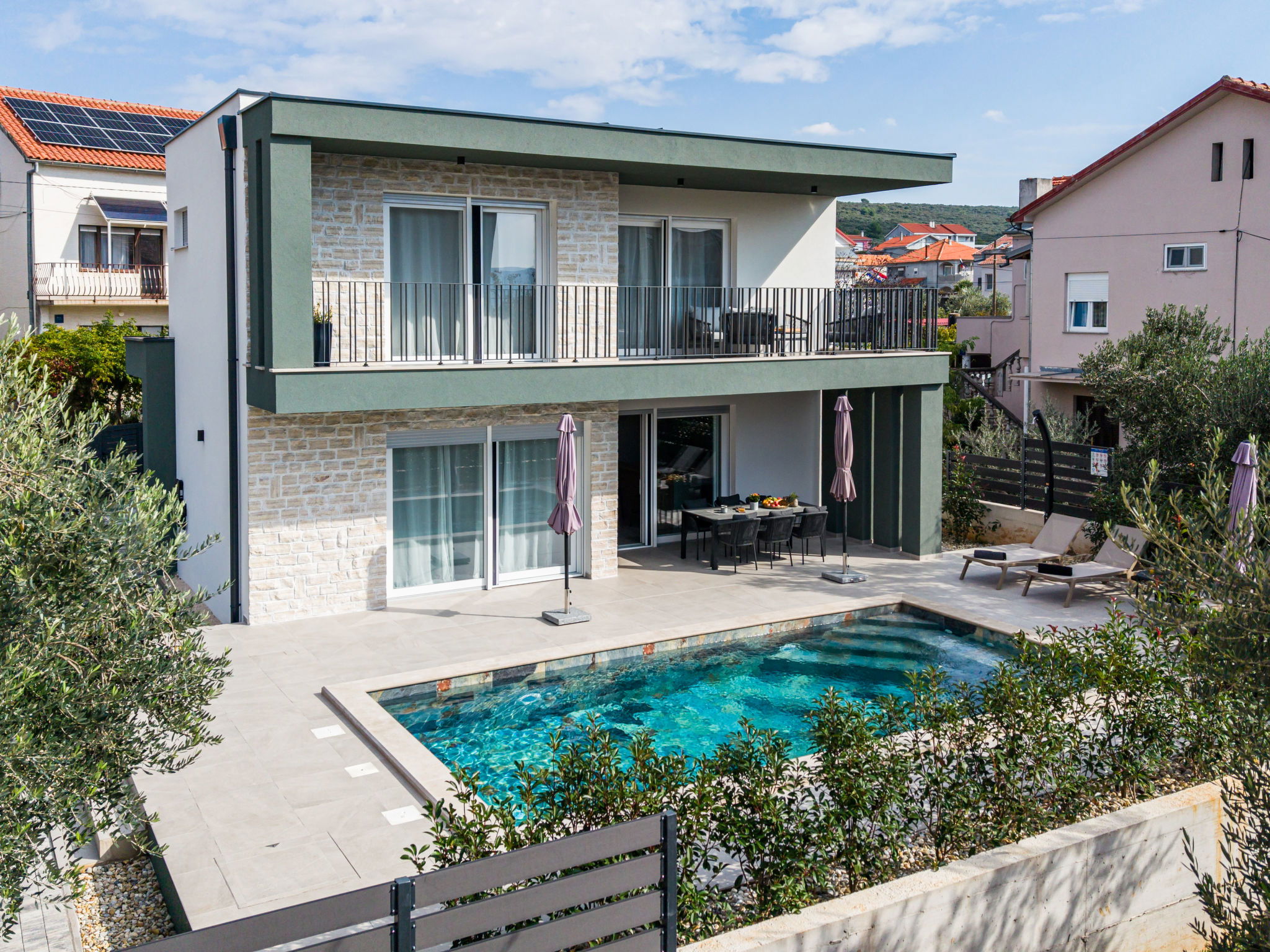 Maison individuelle moderne "Amala", de 2 étages. À 2.5 km du centre de Sukošan, situation tranquille, ensoleillée, à 100 m de la mer, à 100 m de la plage. A usage privé: terrain 600 m2 (clôturé), piscine rectangulaire, chauffée (8 x 4 m, profondeur 145 cm, disponibilité saisonnière: 01.Mai. - 30.Sep.) avec marches intérieures. Douche extérieure, meubles de jardin, barbecue. Infrastructures de la Maison: accès internet, lave-linge. Place de parking (pour 2 voitures) près de la maison sur le terrain. Magasins 50 m, restaurant 300 m, arrêt de bus 250 m, plage de graviers 100 m. Groupes de jeunes sur demande seulement.