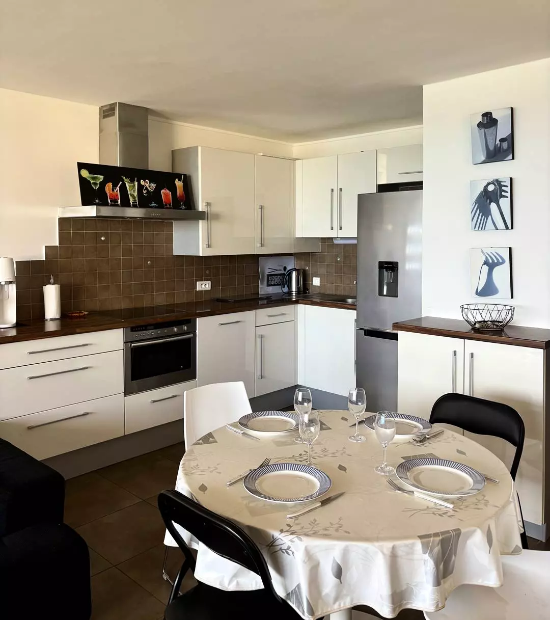Cuisine entièrement équipée : four, plaque électrique, grand réfrigérateur avec compartiment congélateur, lave-vaisselle, SodaStream, cafetières (Nespresso)