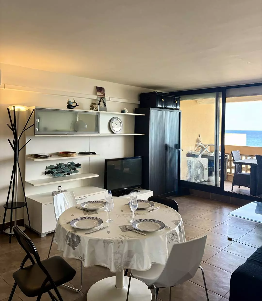 Pièce principale / salon-séjour avec canapé d’angle, télévision et belle ouverture sur la terrasse offrant une vue panoramique sur la mer