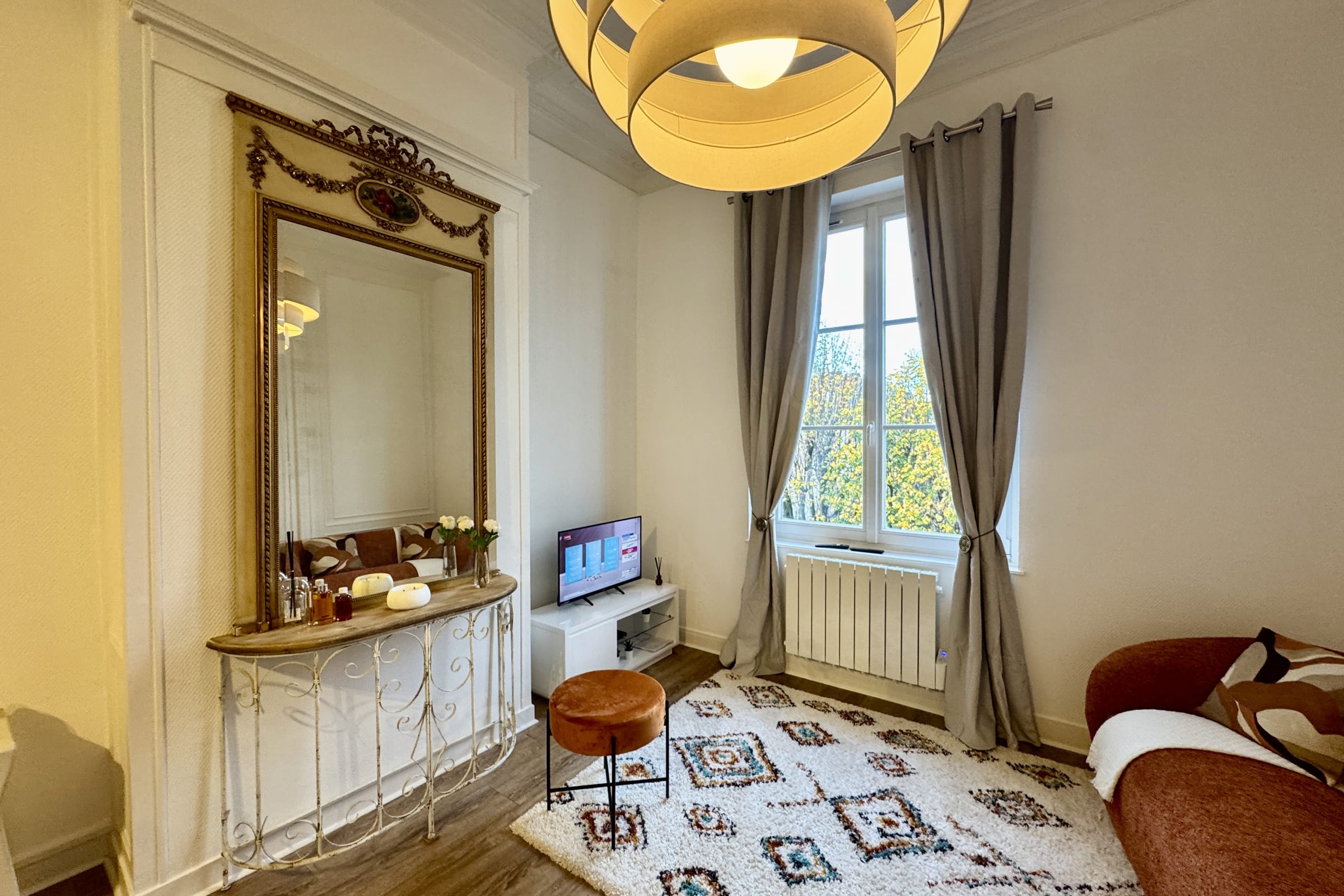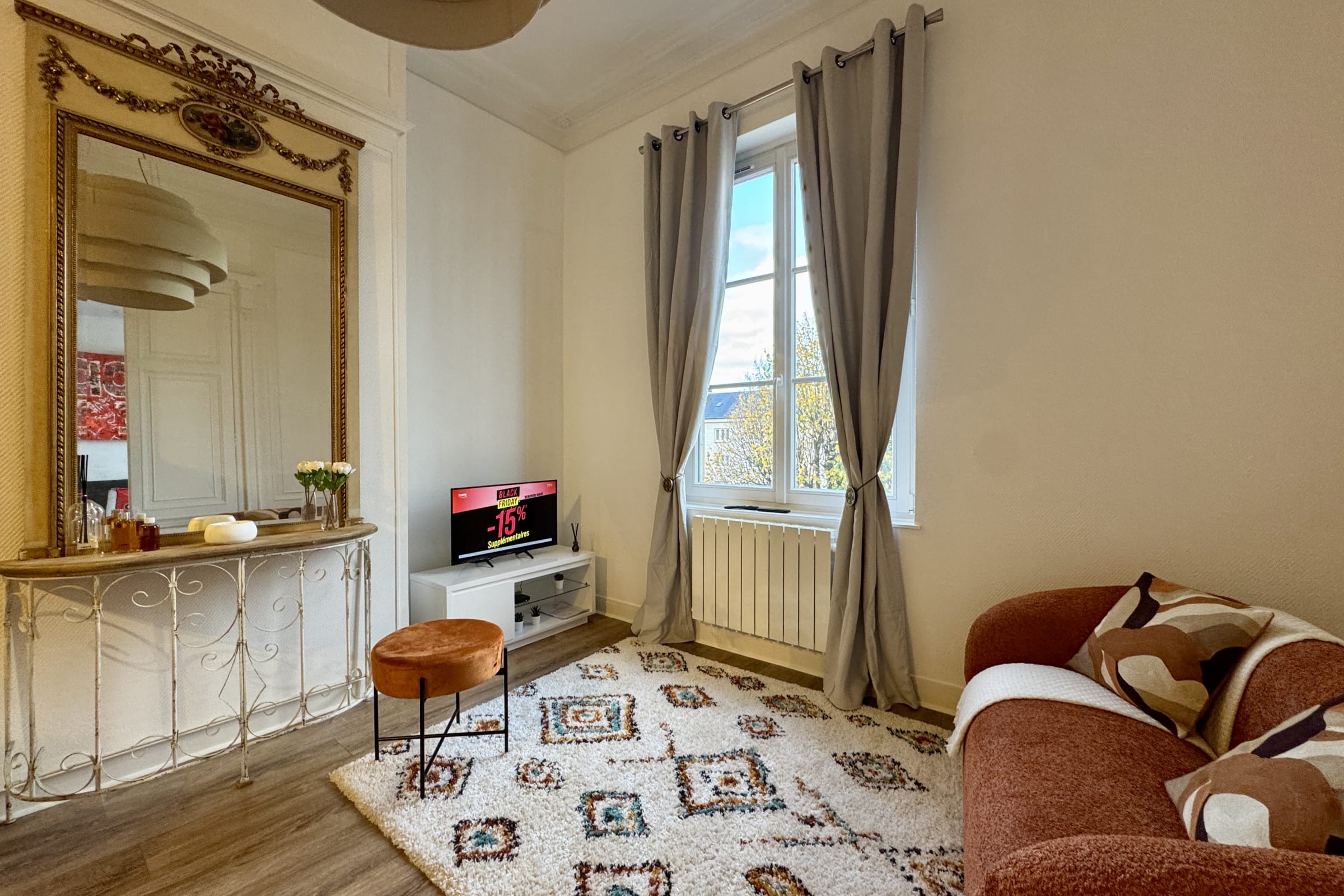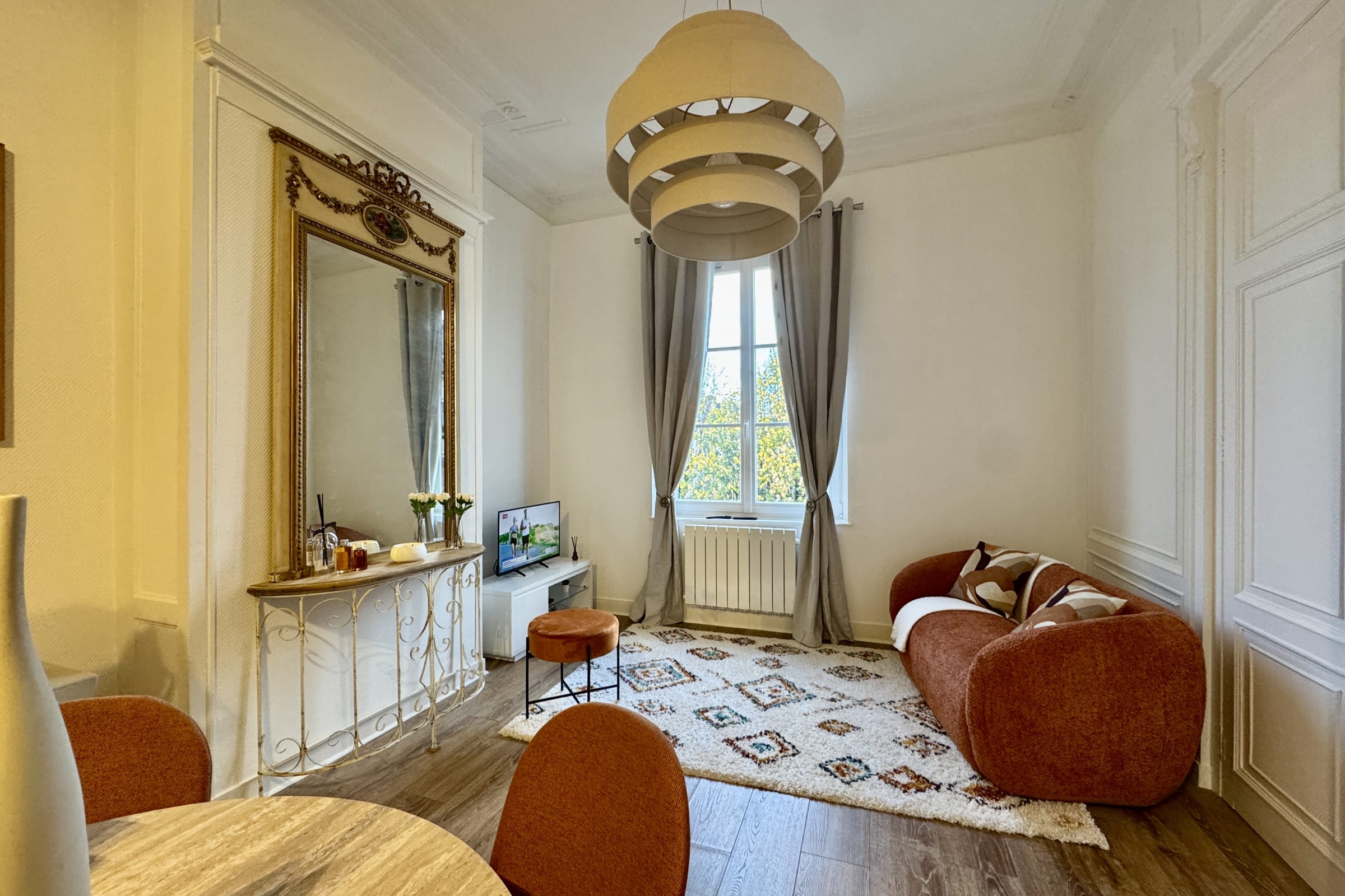 Bienvenue dans ce magnifique appartement niché directement sur la célèbre Place des Carmes, en hyper centre de Rouen. Installé au 3ᵉ étage d’un ancien hôtel particulier, ce cocon de 36 m² à l’ambiance soignée et contemporaine est parfaitement conçu pour accueillir deux voyageurs en quête de charme, de douceur et de tranquillité. Dès que vous franchissez la porte, la lumière vous accueille : la belle hauteur sous plafond et l’exposition sud-ouest inondent l’espace d’une clarté chaleureuse, du matin jusqu’aux derniers rayons du soleil. Depuis le séjour, il vous suffit de vous approcher de la fenêtre pour sentir la ville vivre sous vos yeux : la Place des Carmes s’anime au rythme des passants et, en levant les yeux, le sommet de la Cathédrale de Rouen se découpe fièrement dans le ciel rouennais.