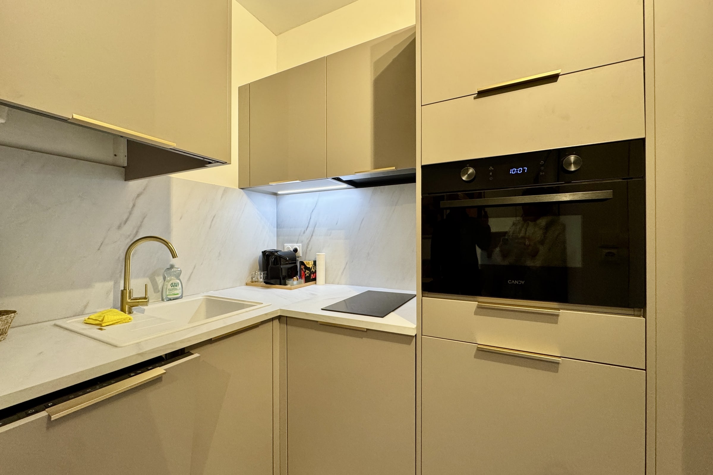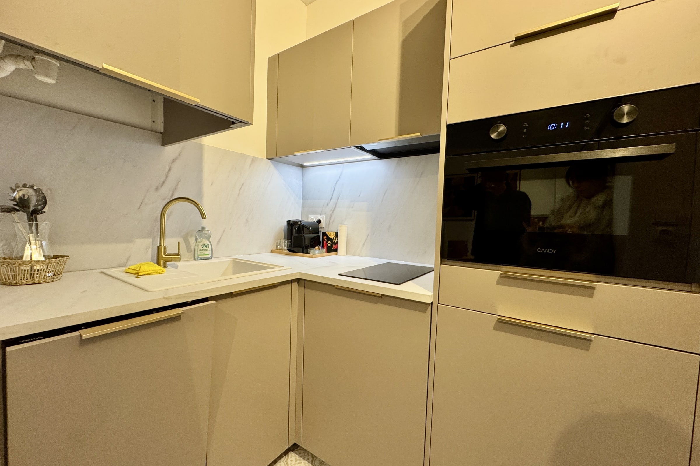 Le séjour, très lumineux, est un véritable havre de détente, où l’on se sent immédiatement chez soi. Laissez-vous tomber dans le canapé pour regarder vos programmes préférés à la télévision, partager un verre ou savourer un bon repas sur la table à manger du salon, tout en profitant de la vue et de l’ambiance de la place. Attenante au salon, la chambre offre un cocon intime avec un lit double en 140x190 cm, idéal pour se reposer après une journée de visite et se réveiller en douceur, au calme, au-dessus de la ville. Juste à côté, la salle de bain dispose d’une baignoire et de WC, pour un moment de confort et de relaxation bienvenu en fin de journée. Dès l’entrée, la cuisine semi-ouverte vous invite à prendre vos marques comme à la maison : entièrement aménagée et équipée (machine à laver le linge, lave-vaisselle, four combiné et micro-ondes, réfrigérateur, cafetière Nespresso, grille-pain, bouilloire), elle vous permet de préparer facilement un petit-déjeuner gourmand, un dîner en tête-à-tête ou un simple café à déguster devant la fenêtre. Du matériel de repassage est également à votre disposition dans les grands placards de l’entrée pour que tout reste impeccable durant votre séjour.