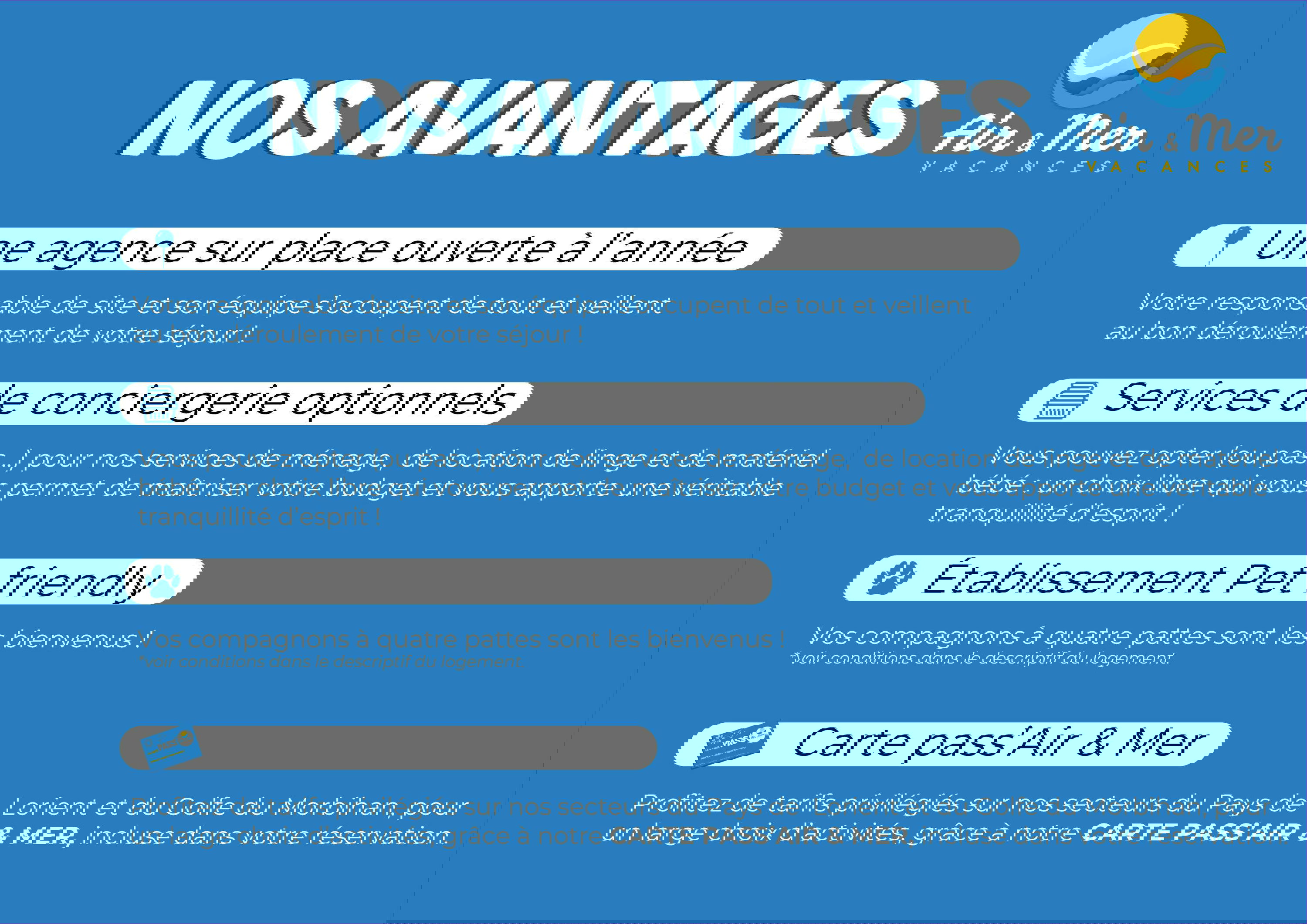 - Animaux acceptés avec un supplément de 30 € / animal / semaine y compris court séjour.