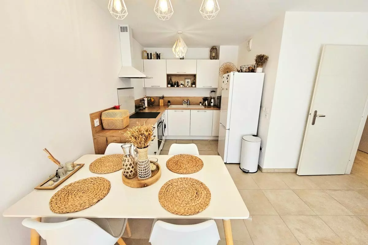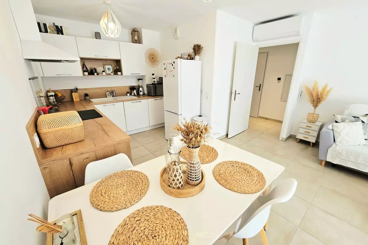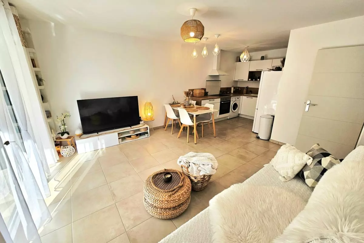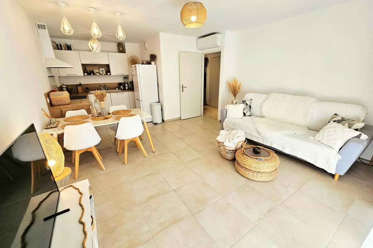 L’appartement se situe dans une résidence neuve, sécurisée et soigneusement entretenue, offrant un cadre de vie calme et agréable. Vous profiterez d’une grande pièce à vivre lumineuse donnant sur une terrasse, parfaite pour savourer un café au soleil. La cuisine moderne est dotée de plaques à induction, d’un four, d’un micro-ondes et d’un réfrigérateur-congélateur, ainsi que de tout le nécessaire pour préparer vos repas. La chambre climatisée est conçue pour offrir un repos optimal, et l’ensemble du logement est décoré avec soin pour créer une ambiance chaleureuse et harmonieuse.