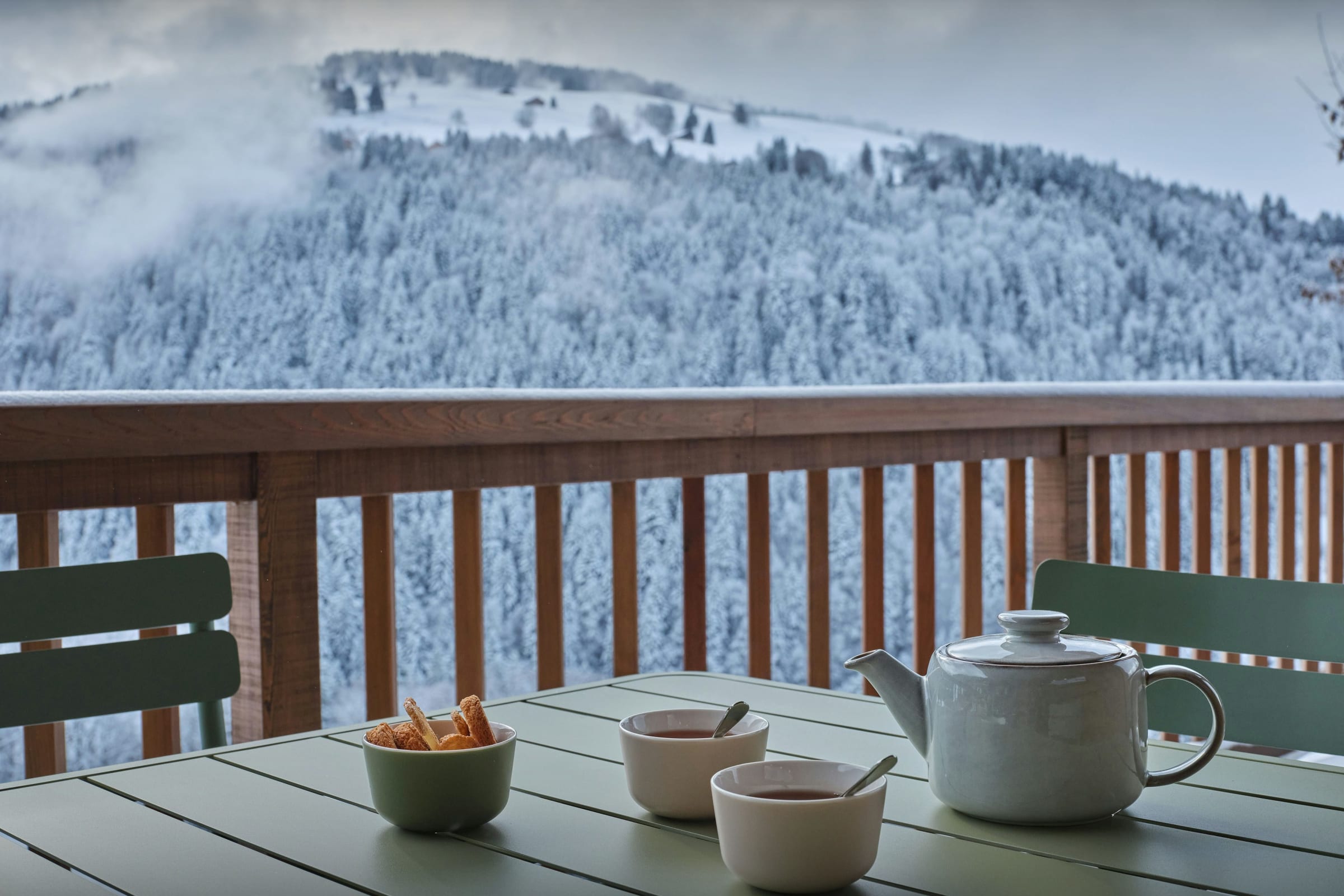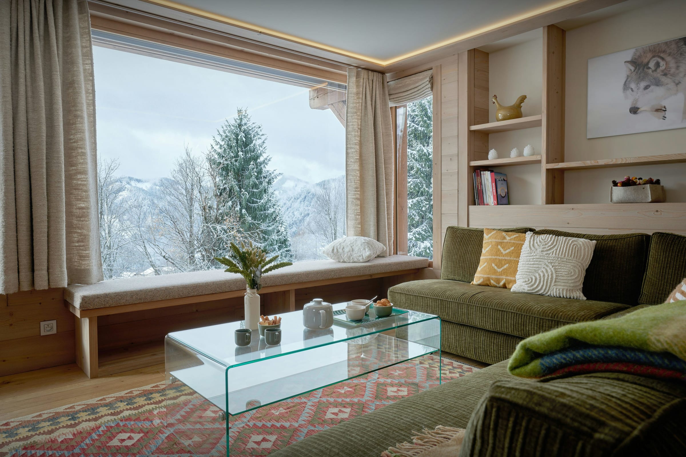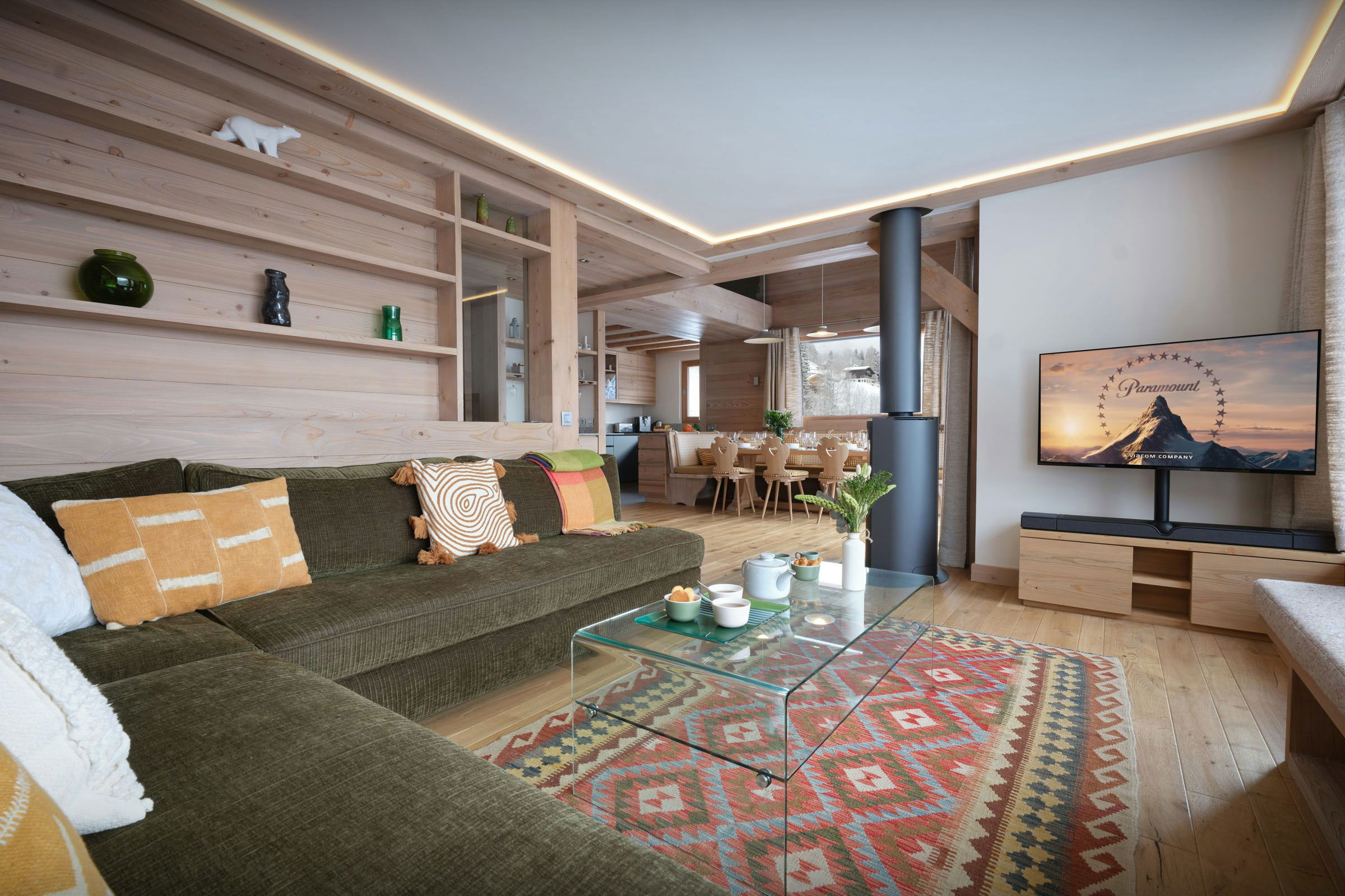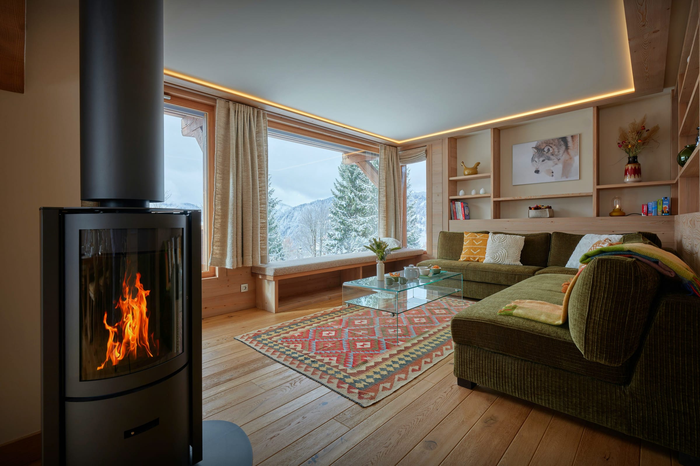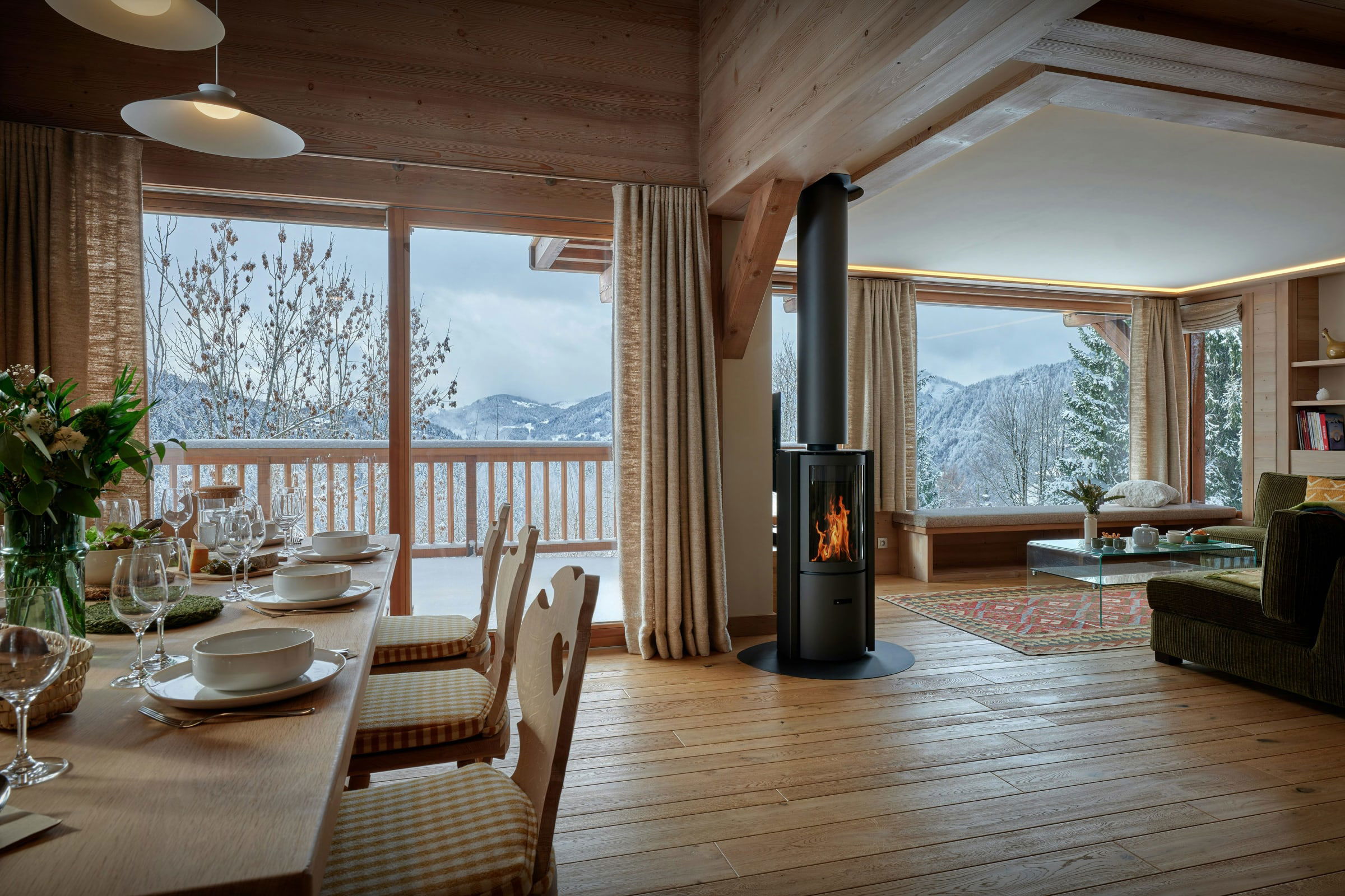 Vous pénétrez ensuite dans une agréable pièce de vie, composée de teintes douces et réchauffée par un poêle à bois central. Le salon et le balcon offrent une vue absolument spectaculaire sur la chaîne des Aravis.