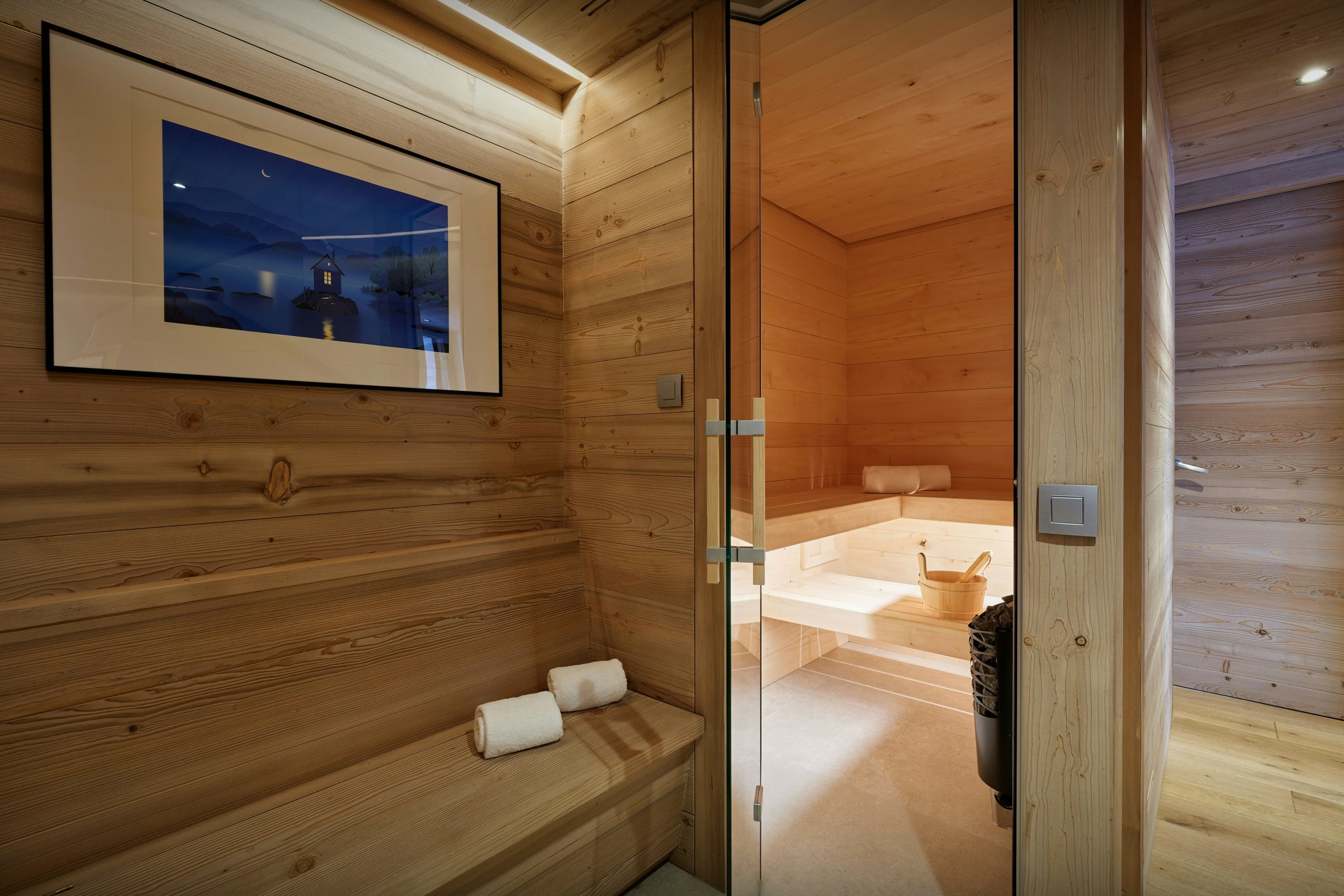 Parmi les pièces communes, vous trouverez une salle de télévision et une salle de jeux sous la charpente, ainsi qu’un agréable sauna pour vous ressourcer et éliminer les toxines.