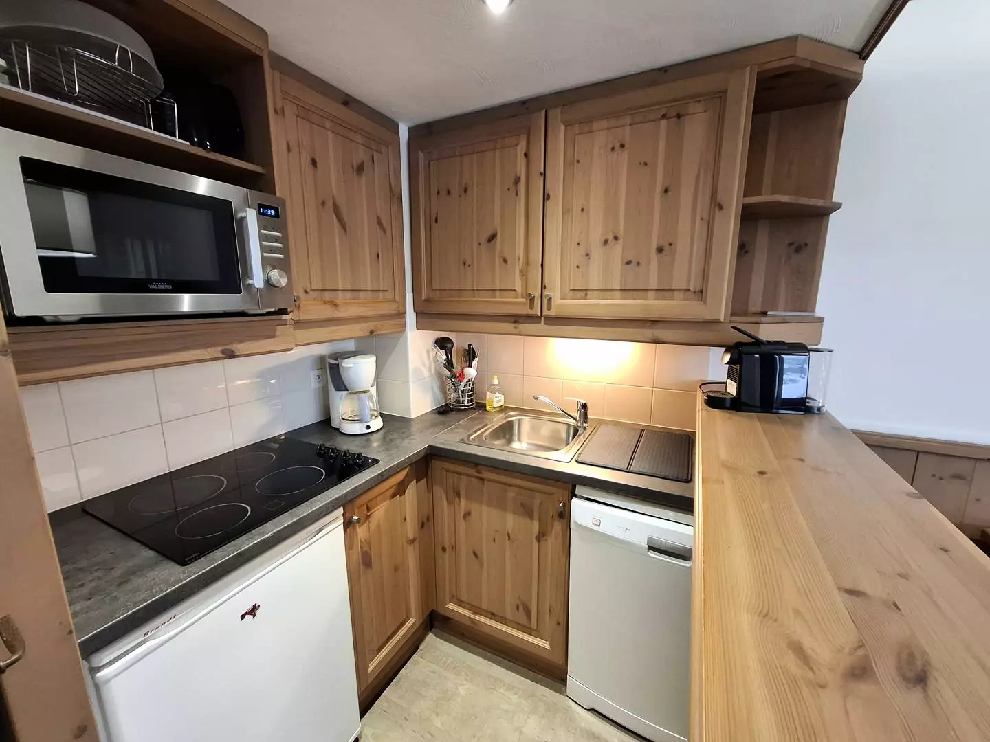 - Cuisine ouverte équipée avec lave-vaisselle, 4 plaques électriques, four combiné, réfrigérateur avec freezer, cafetière, bouilloire, grille-pain, appareil raclette.