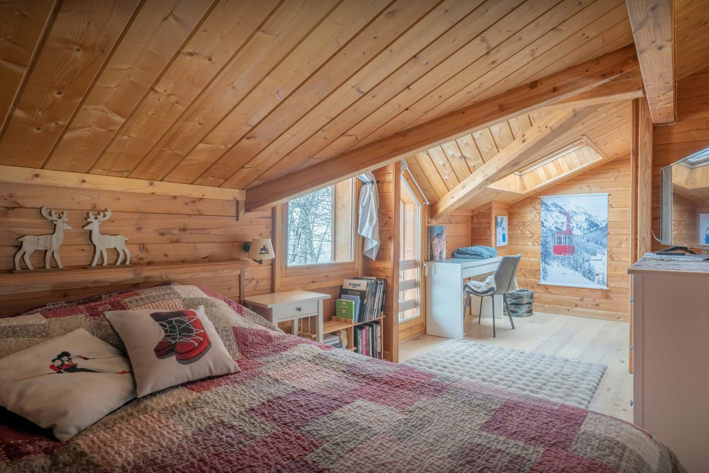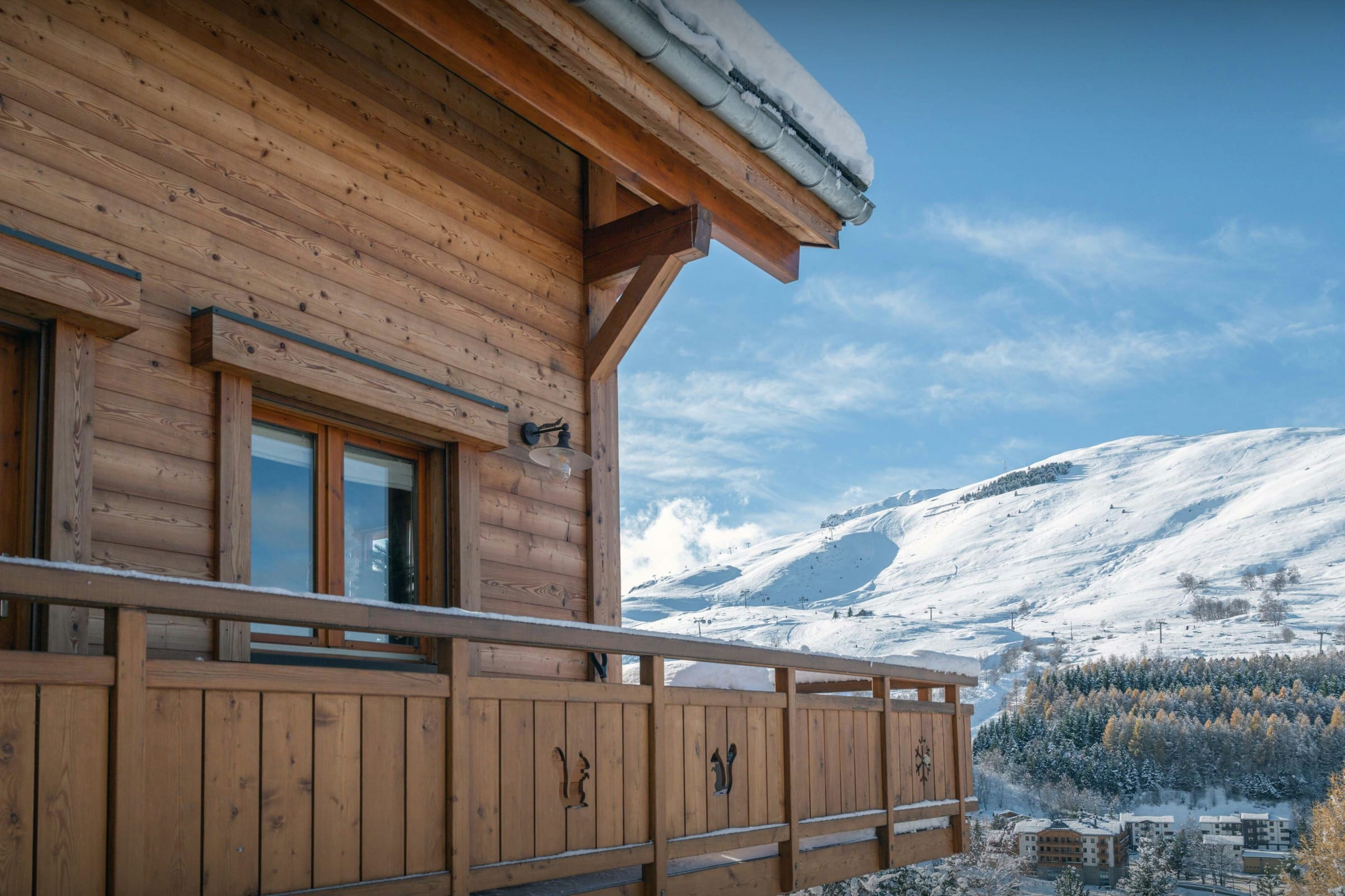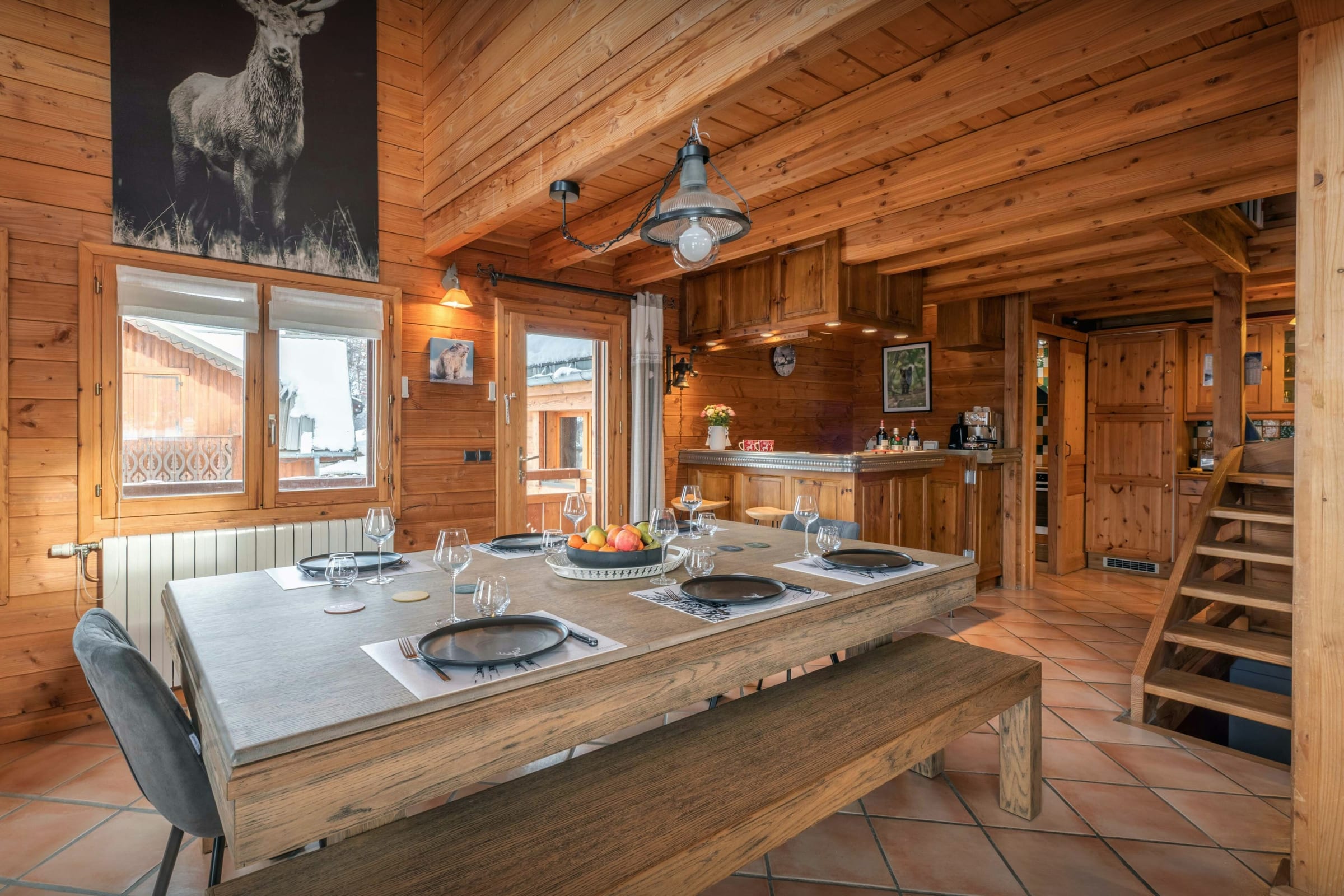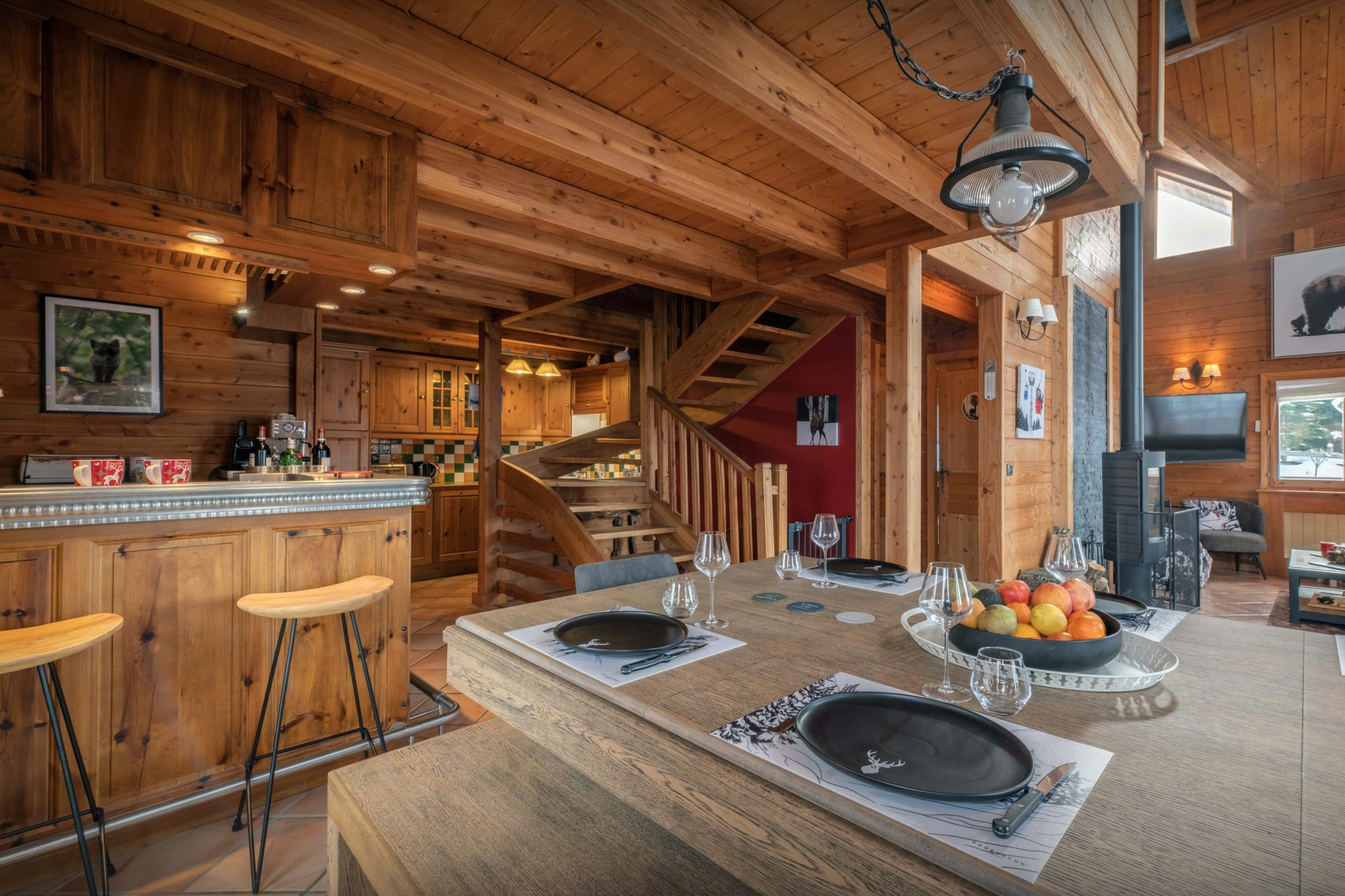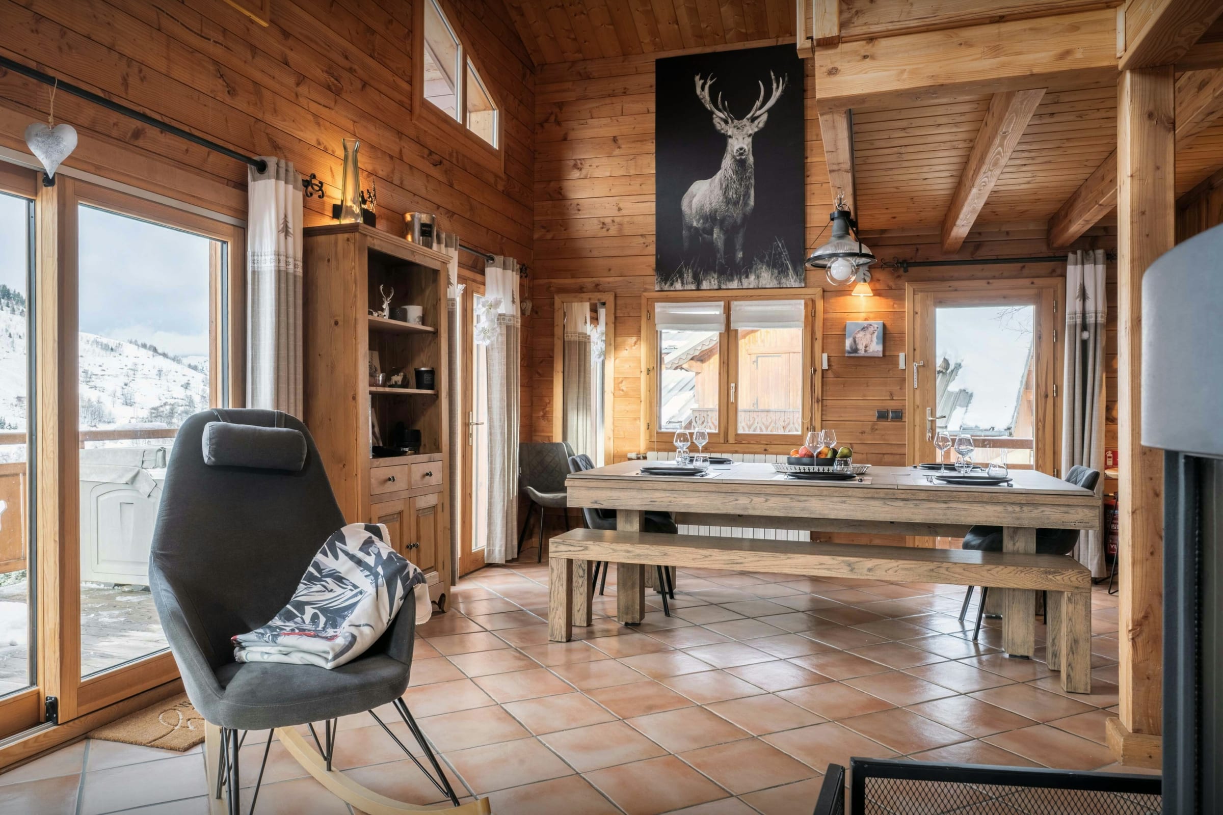 La pièce de vie est l’un des grands atouts du chalet. Son salon, tourné vers un poêle à bois, et son comptoir boisé créent une atmosphère chaleureuse dès le retour des pistes. La terrasse panoramique qui l’enveloppe sur trois côtés permet de se détendre en admirant la vue.