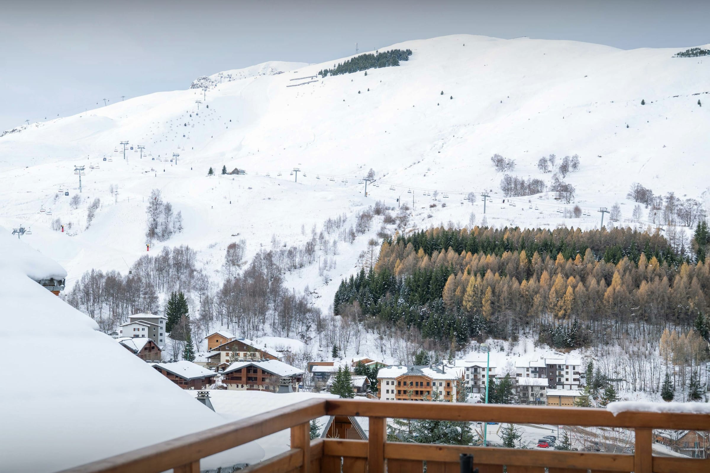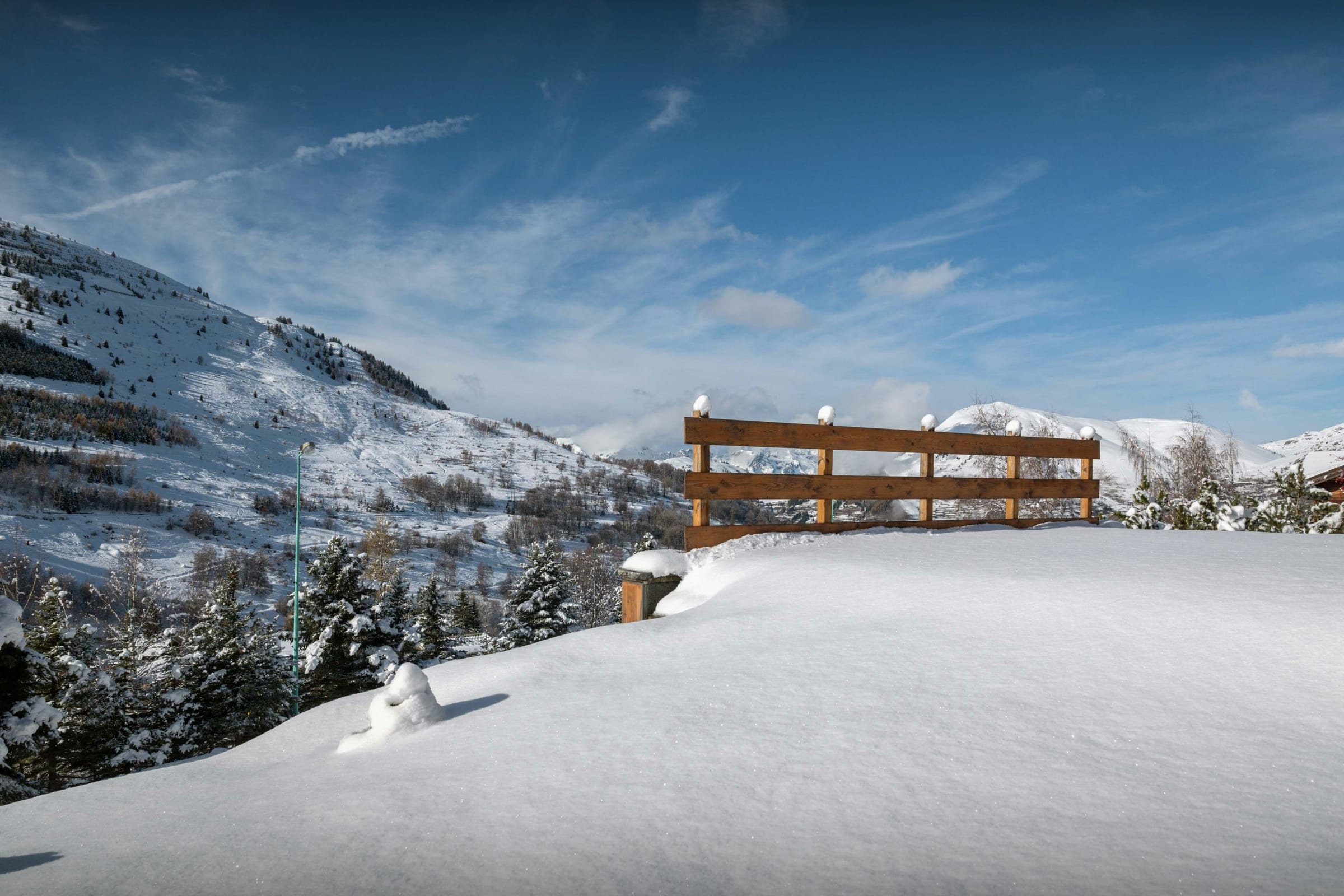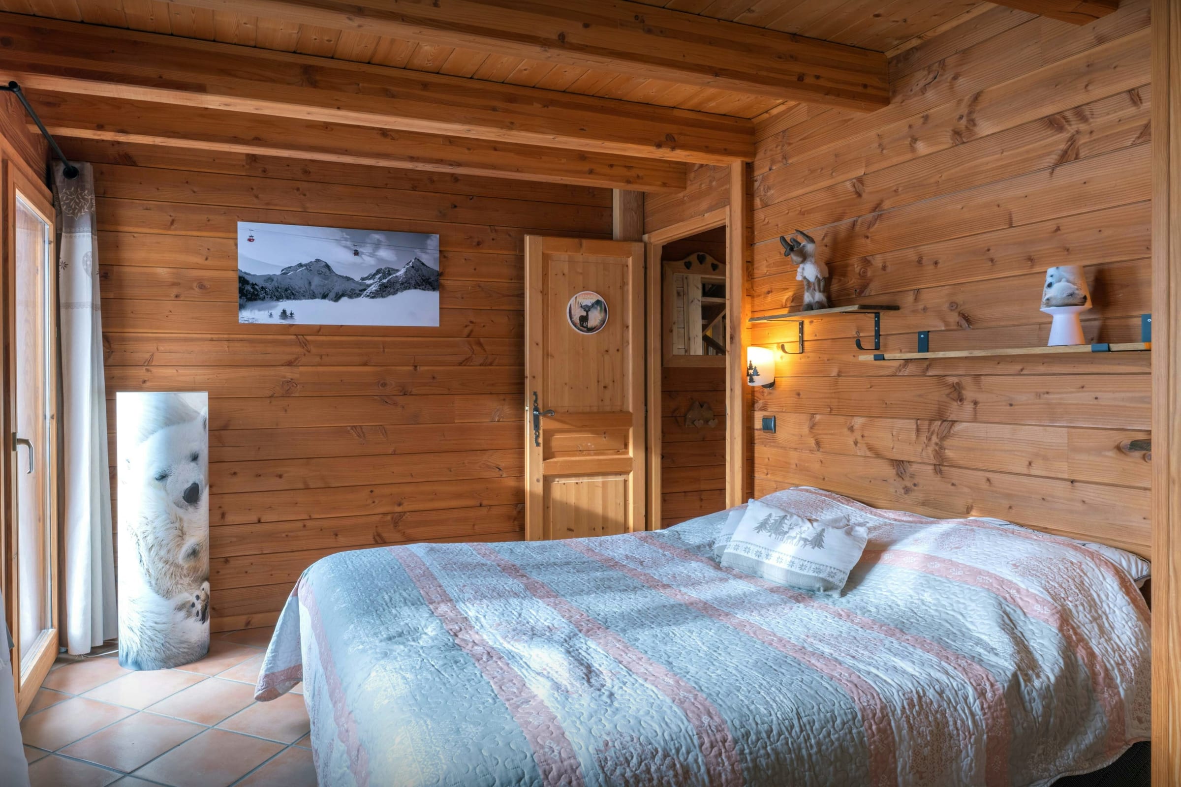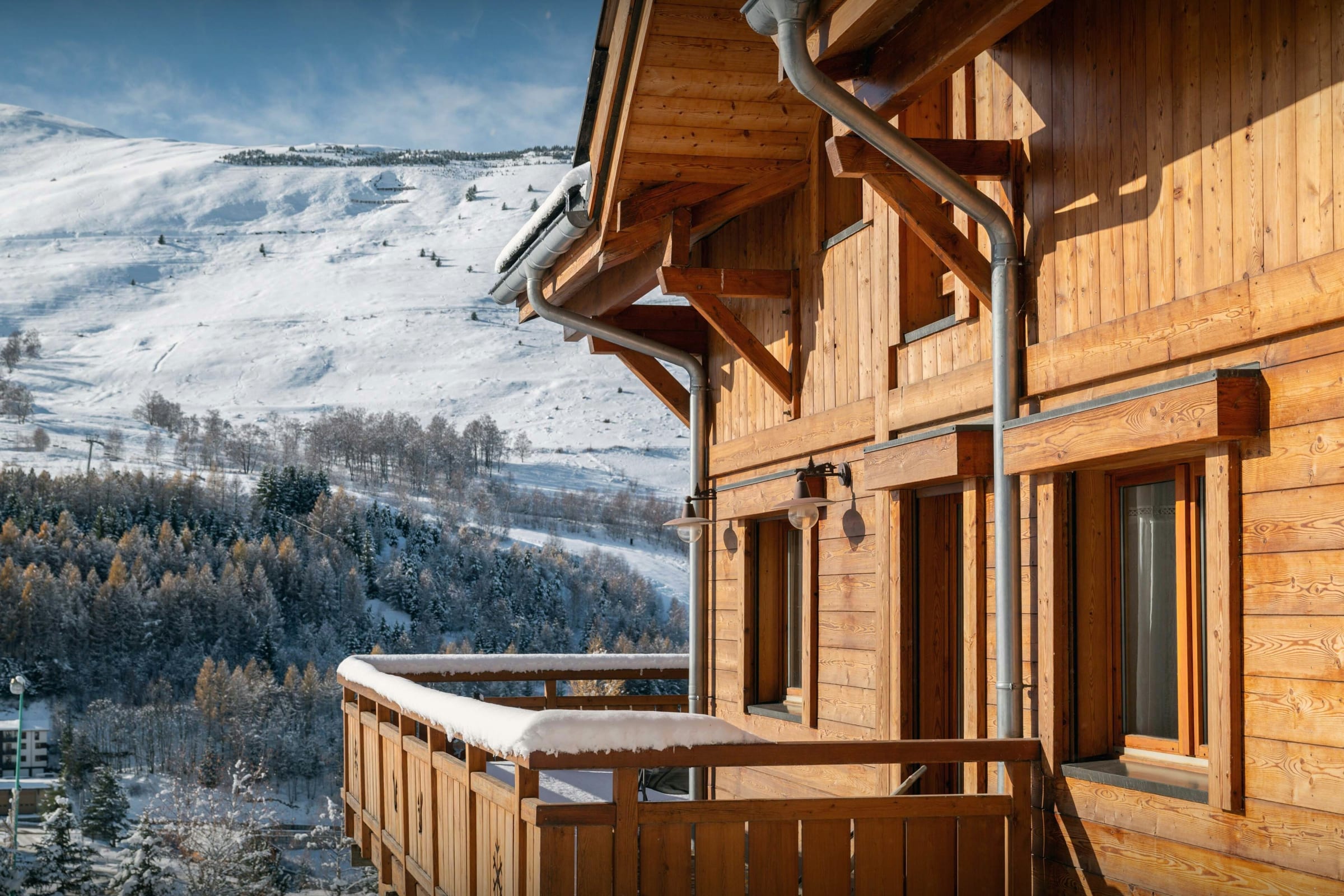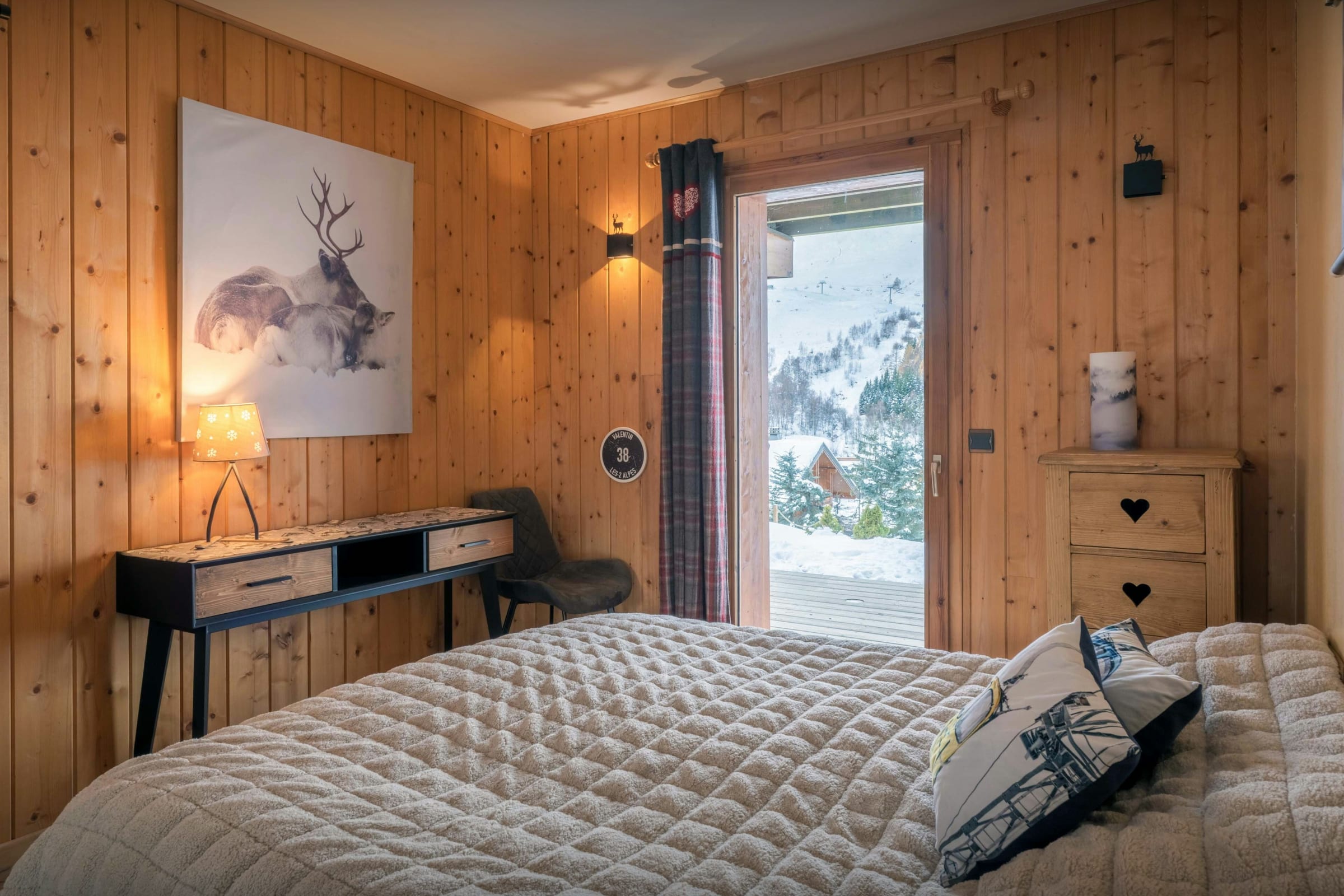 La pièce de vie est l’un des grands atouts du chalet. Son salon, tourné vers un poêle à bois, et son comptoir boisé créent une atmosphère chaleureuse dès le retour des pistes. La terrasse panoramique qui l’enveloppe sur trois côtés permet de se détendre en admirant la vue.