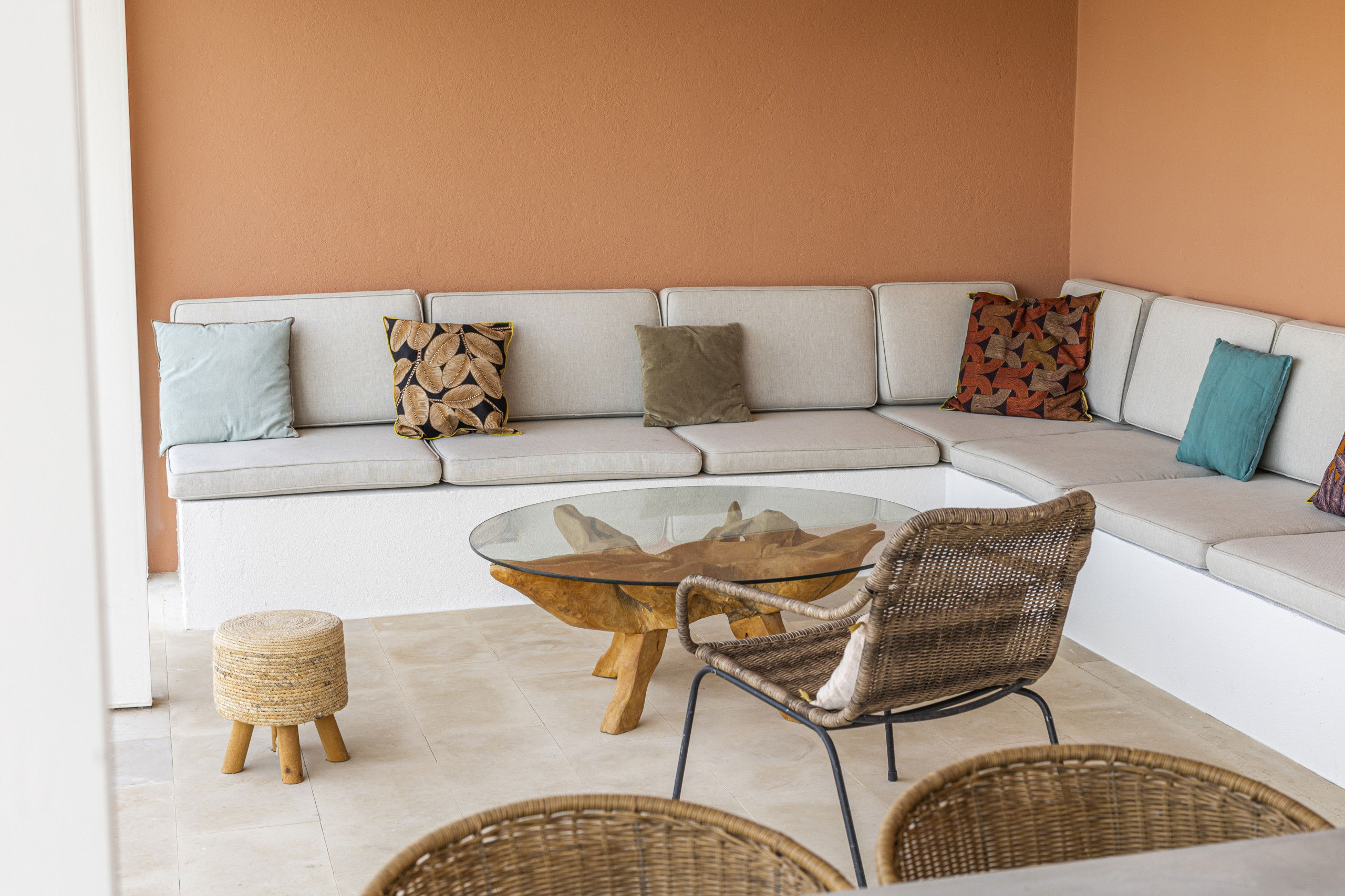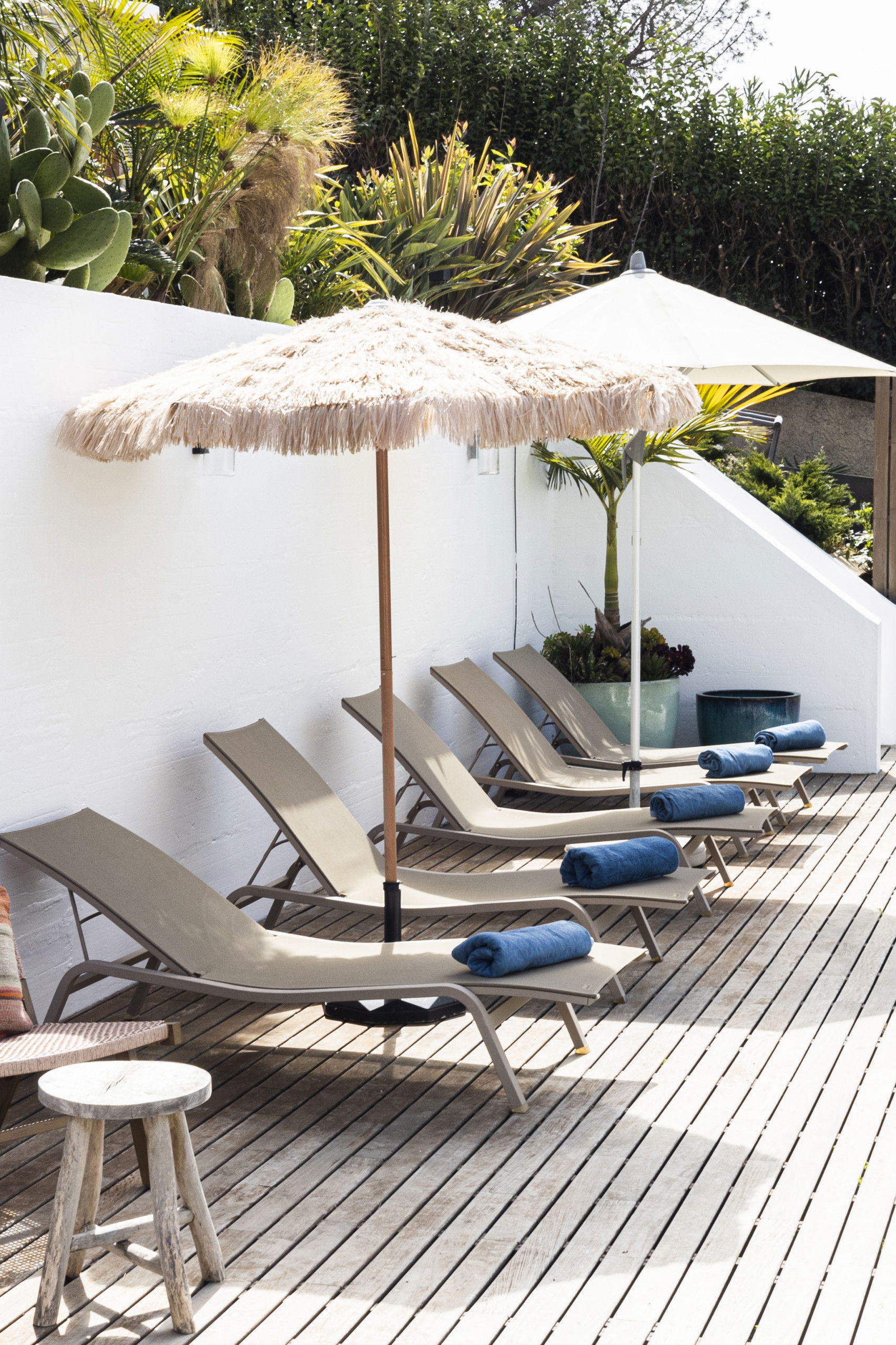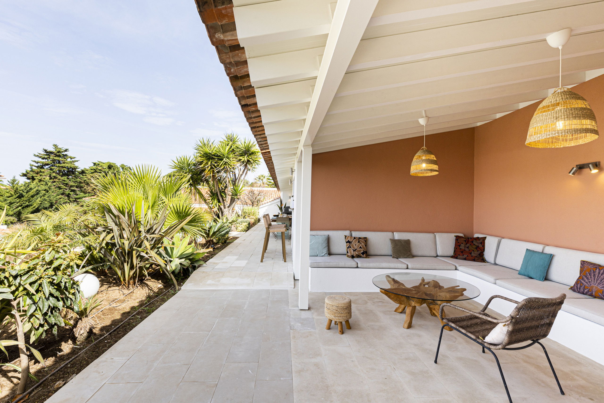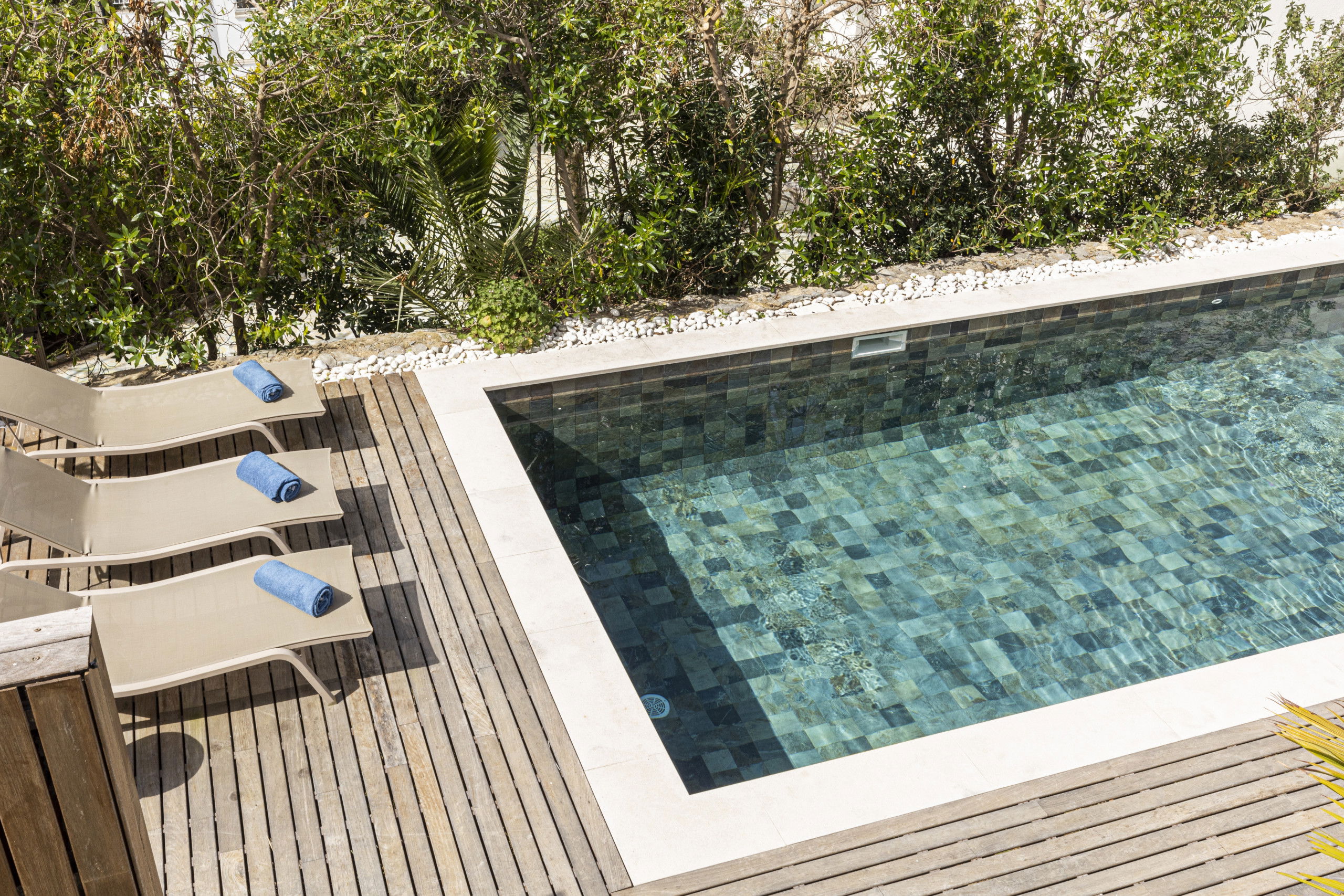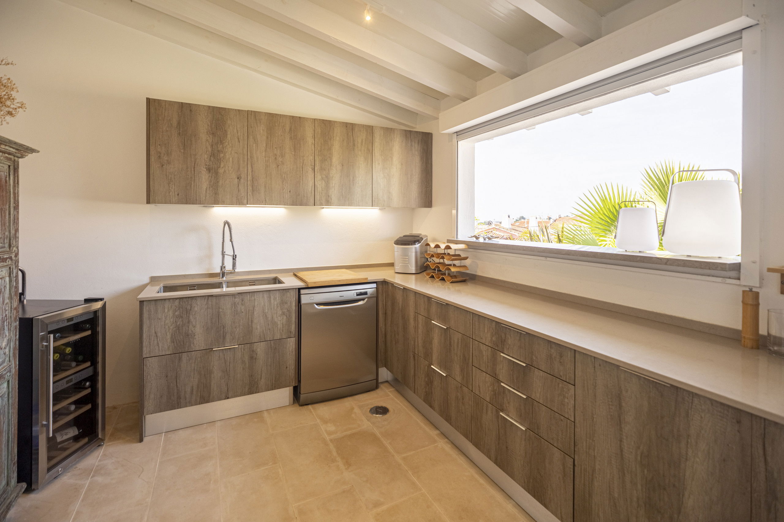 À l'extérieur, une terrasse couverte offre un prolongement harmonieux des intérieurs, avec une grande aire de repas et un canapé extérieur à l'ombre de la ligne de toiture en terre cuite de la villa. La cuisine extérieure entièrement équipée et la fenêtre de bar adjacente créent un rythme facile pour des repas décontractés et des heures de cocktails. Chaque rassemblement semble naturel et détendu dans cet espace extérieur magnifiquement conçu. Et à quelques pas de là, la piscine invite à la détente toute la journée et à la sérénité baignée de soleil. La longue piscine couleur aquamarine se trouve au cœur d'un jardin privé entouré d'arbres délicats et de plantations douces. Une terrasse en bois encadre l'eau, avec des transats et une petite table de repas en plein air offrant un espace pour le calme et la connexion. Que vous fassiez des longueurs ou que vous partagiez un déjeuner à l'ombre, l'énergie ici est calme et revigorante.