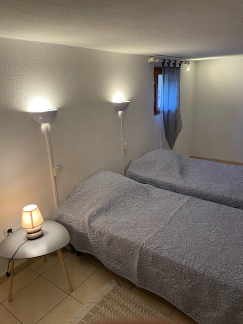 La chambre équipé d'un lit 2 place, au rez de chaussée, cosy et reposante, permet de profiter d'un sommeil réparateur, une salle d'eau, tandis que la mezzanine abrite un espace nuit supplémentaire pour 2 personnes avec un lit d'une place chacun, chaleureux et intimiste, idéal pour les enfants ou un second couple.