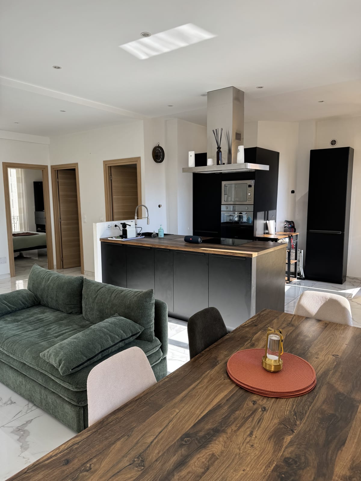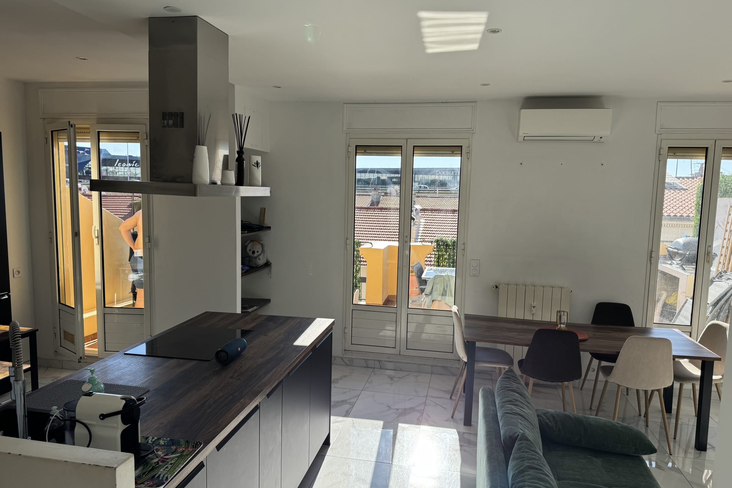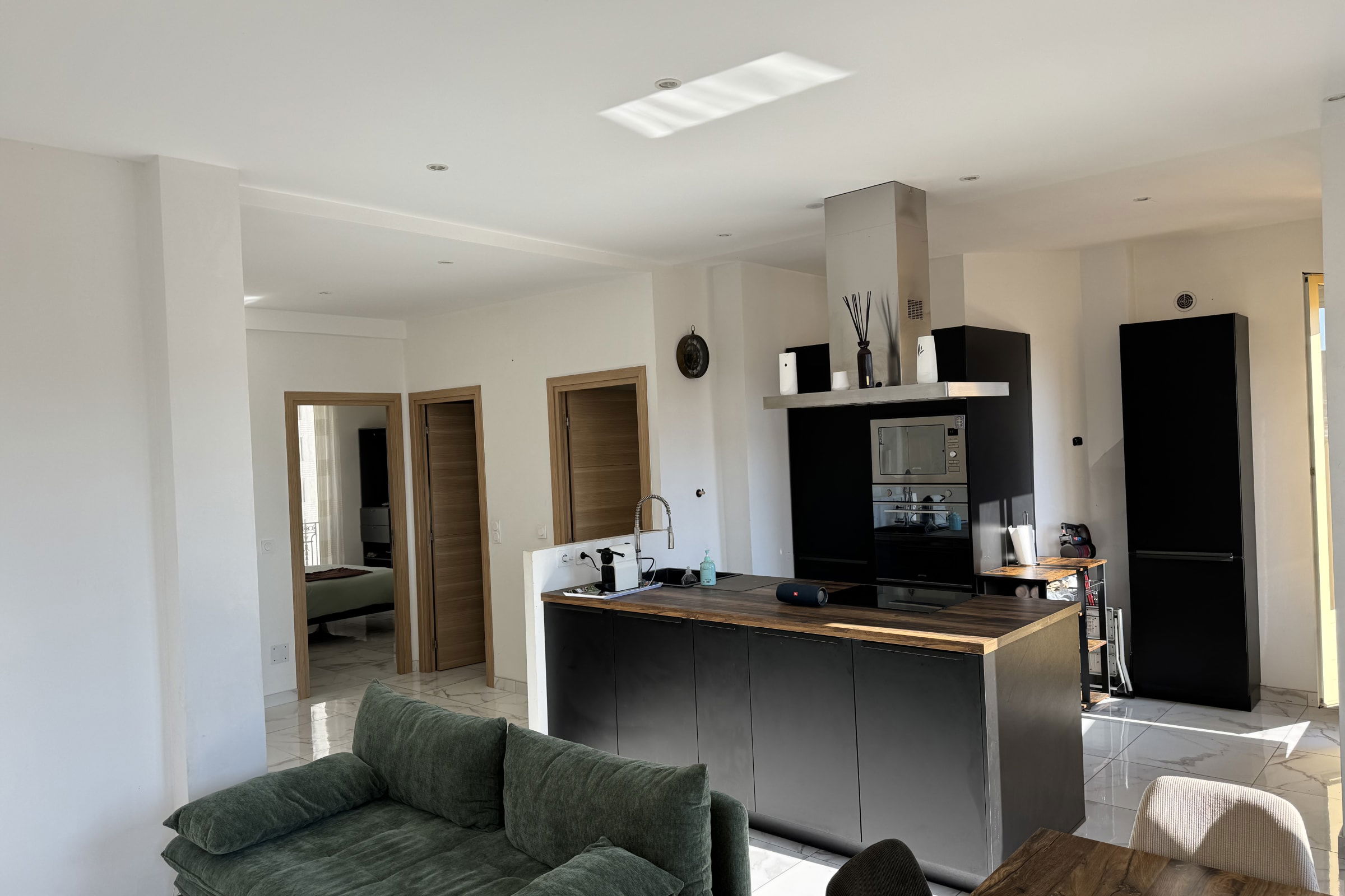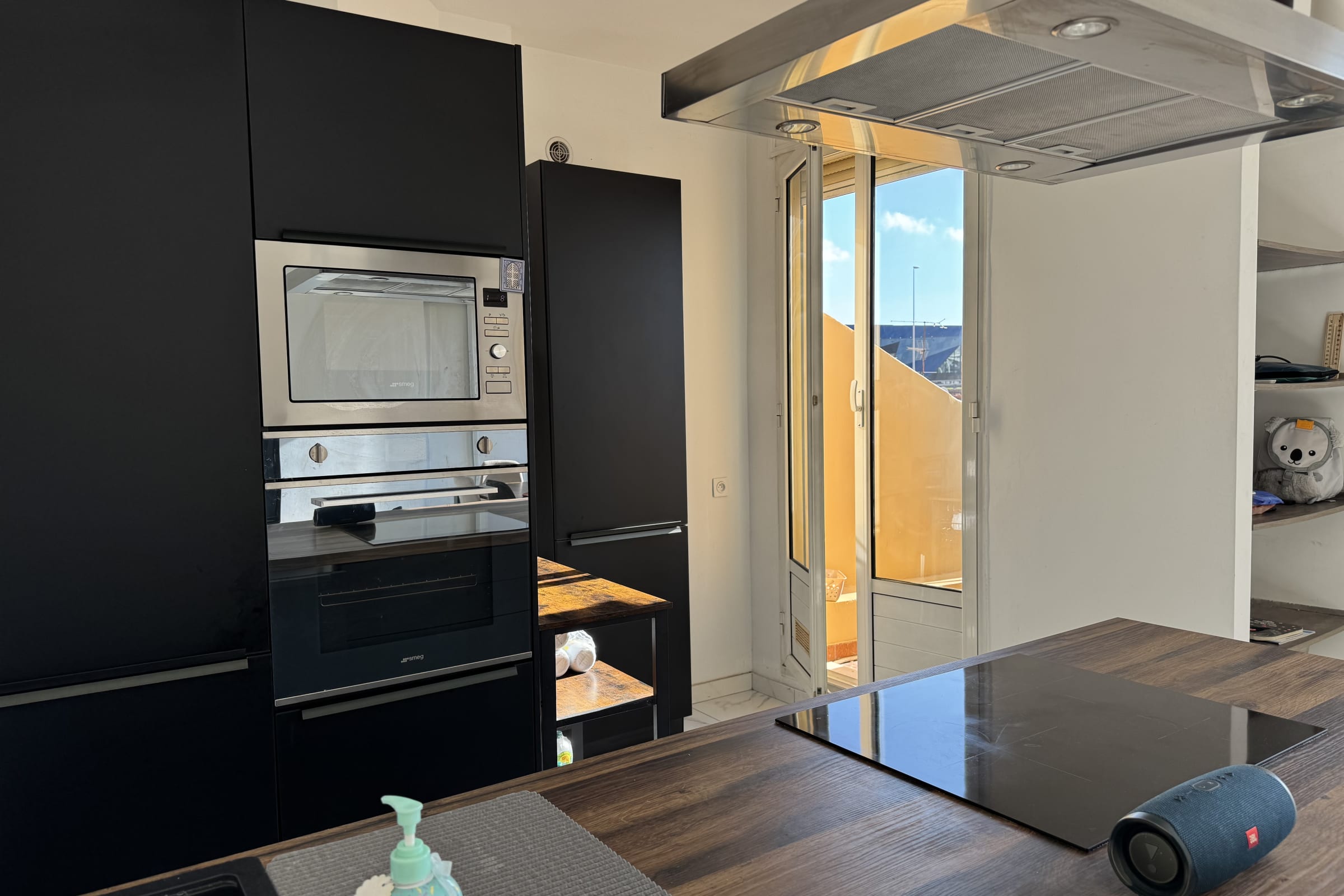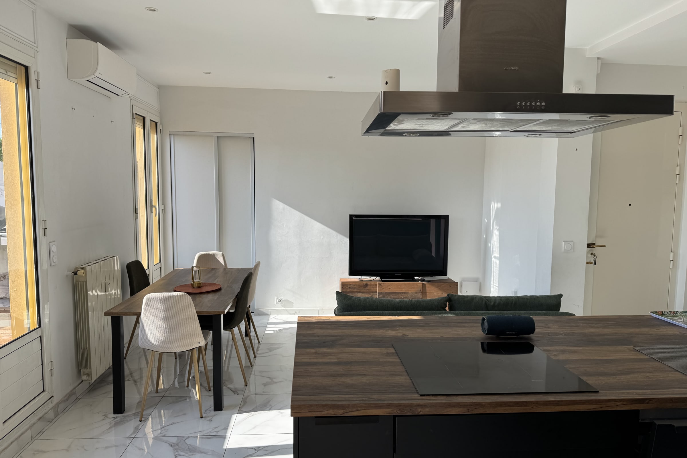 La cuisine ouverte sur le salon, entièrement équipée, dispose d’un îlot central, parfait pour cuisiner, partager un repas ou travailler. La pièce de vie, baignée de lumière grâce à ses ouvertures, crée une atmosphère agréable et contemporaine.