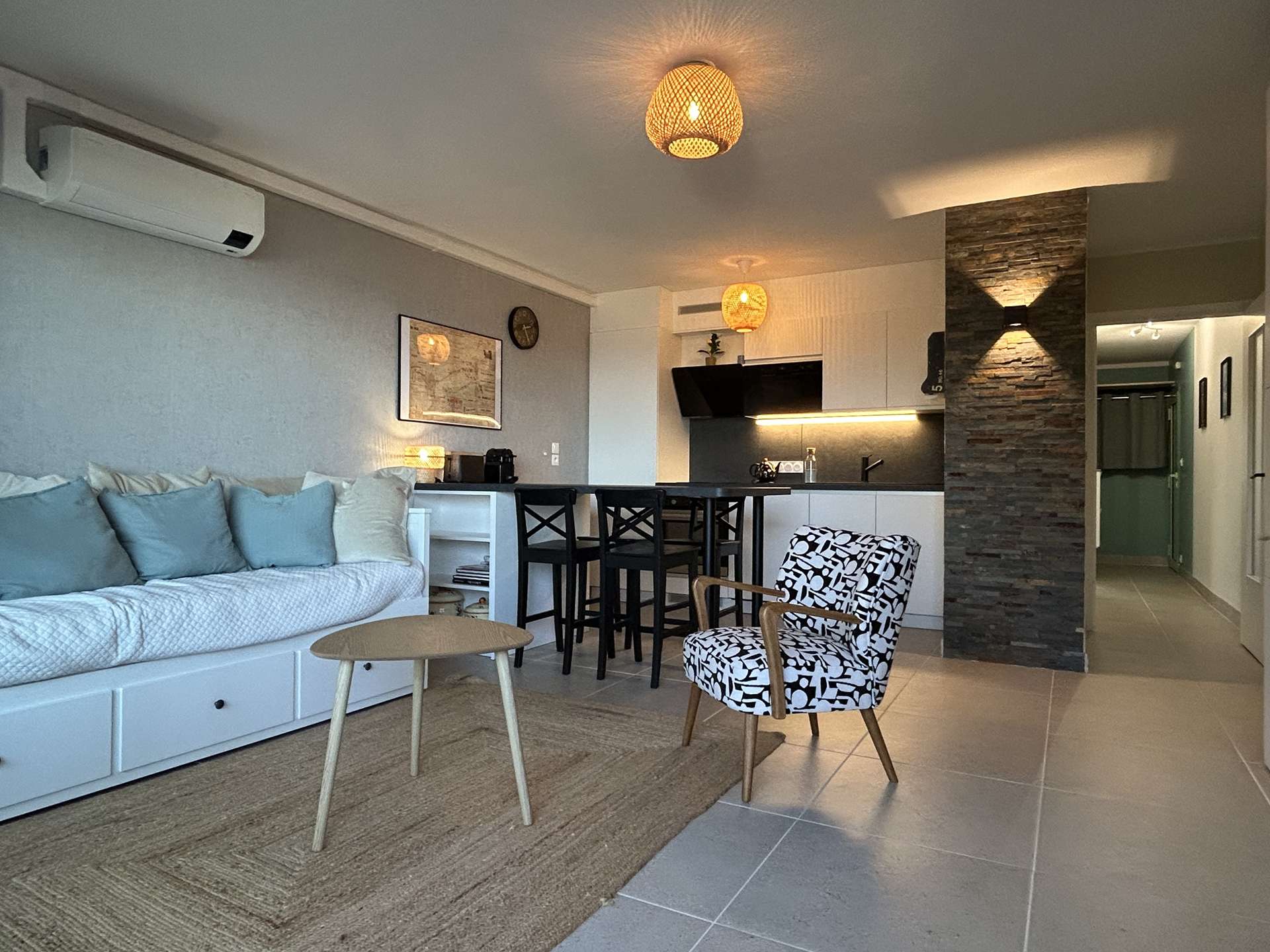 Située à seulement 300 mètres de la plage centrale, du cœur de la station et du port de Banyuls-sur-Mer, la Résidence Le Miramar bénéficie d’un emplacement privilégié où mer et montagnes se dévoilent depuis des appartements confortables. Entièrement rénové en 2025, celui-ci se trouve au premier étage avec ascenseur. Il offre une agréable pièce de vie avec une cuisine équipée ouverte sur un séjour lumineux, doté d’un canapé convertible offrant un couchage en 160 × 200 cm. La chambre dispose de deux lits simples pouvant être rapprochés selon vos besoins. Vous y trouverez également une salle d’eau moderne et des WC indépendants. L’ensemble s’ouvre sur une vaste terrasse permettant de profiter d’un superbe panorama sur la mer et le port.