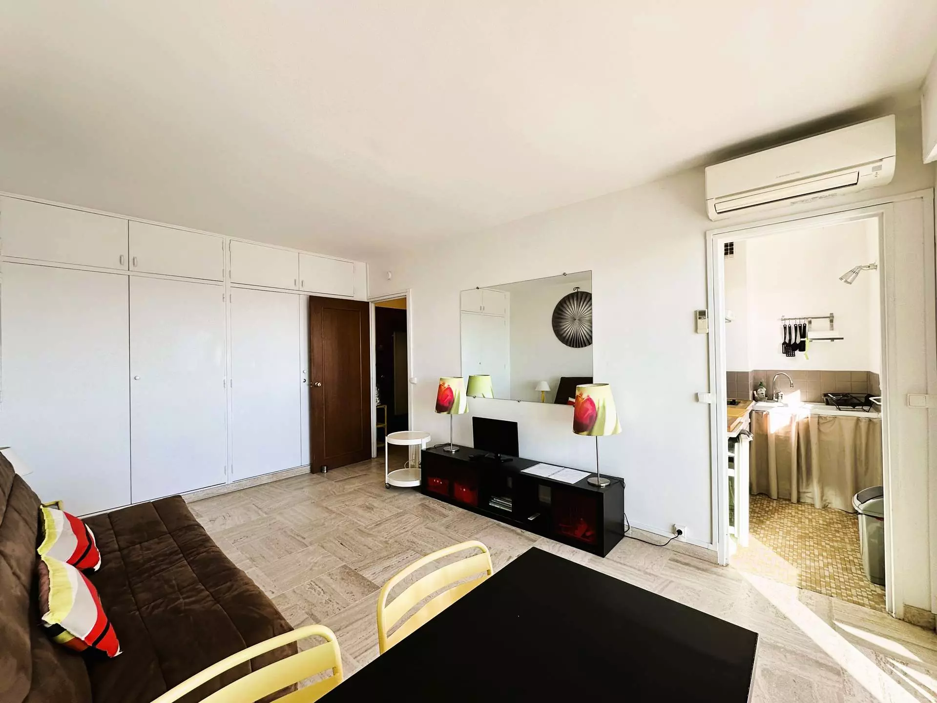 Dans la pièce principale, un canapé lit, un grand placard, un coin repas. Kitchenette équipée, salle de bain avec wc. Terrasse. Parking.