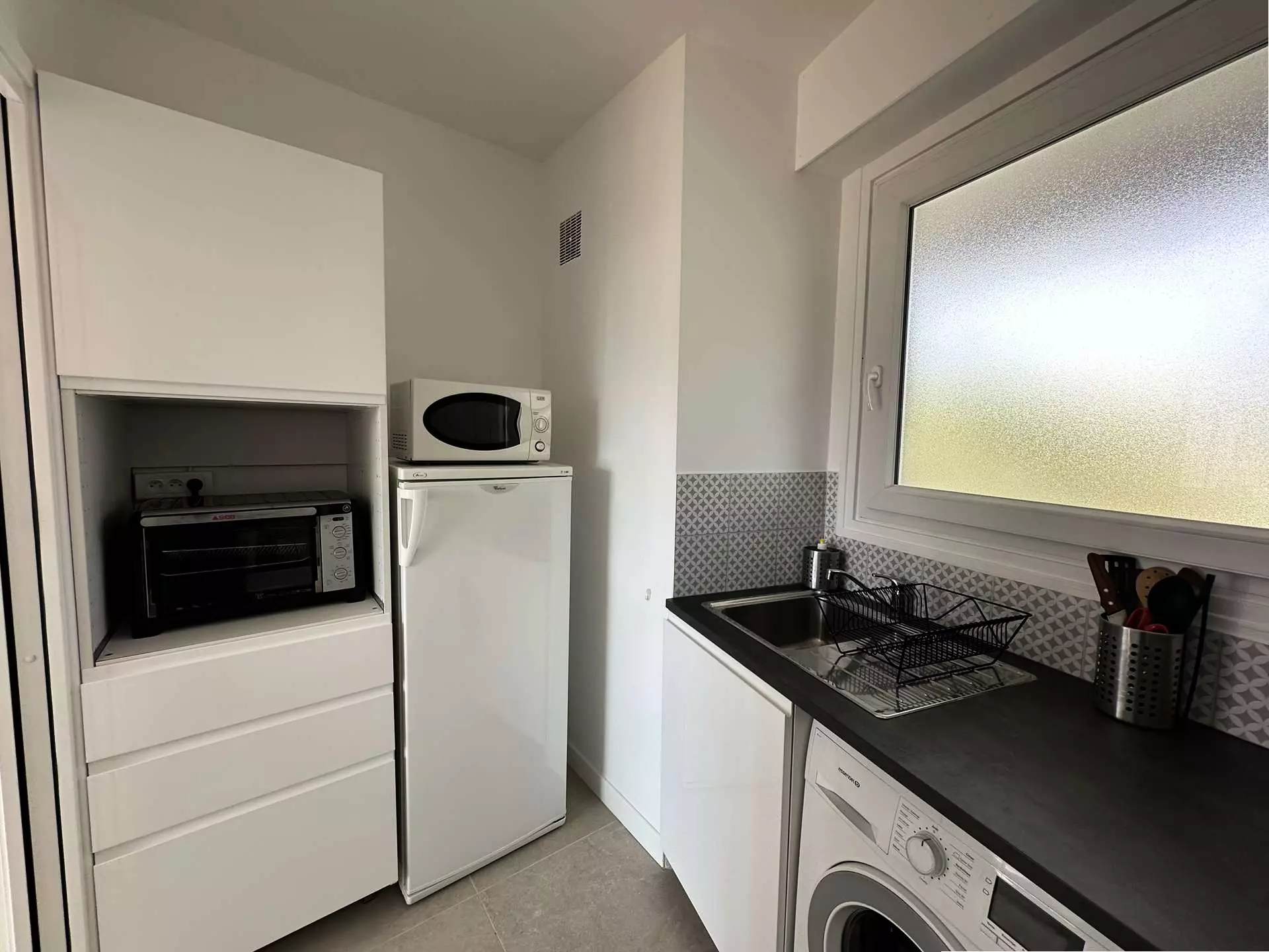 Équipements de l'appartement : lave-linge, climatisation, mini-four, micro ondes, réfrigérateur avec partie congélateur, mobilier de jardin.