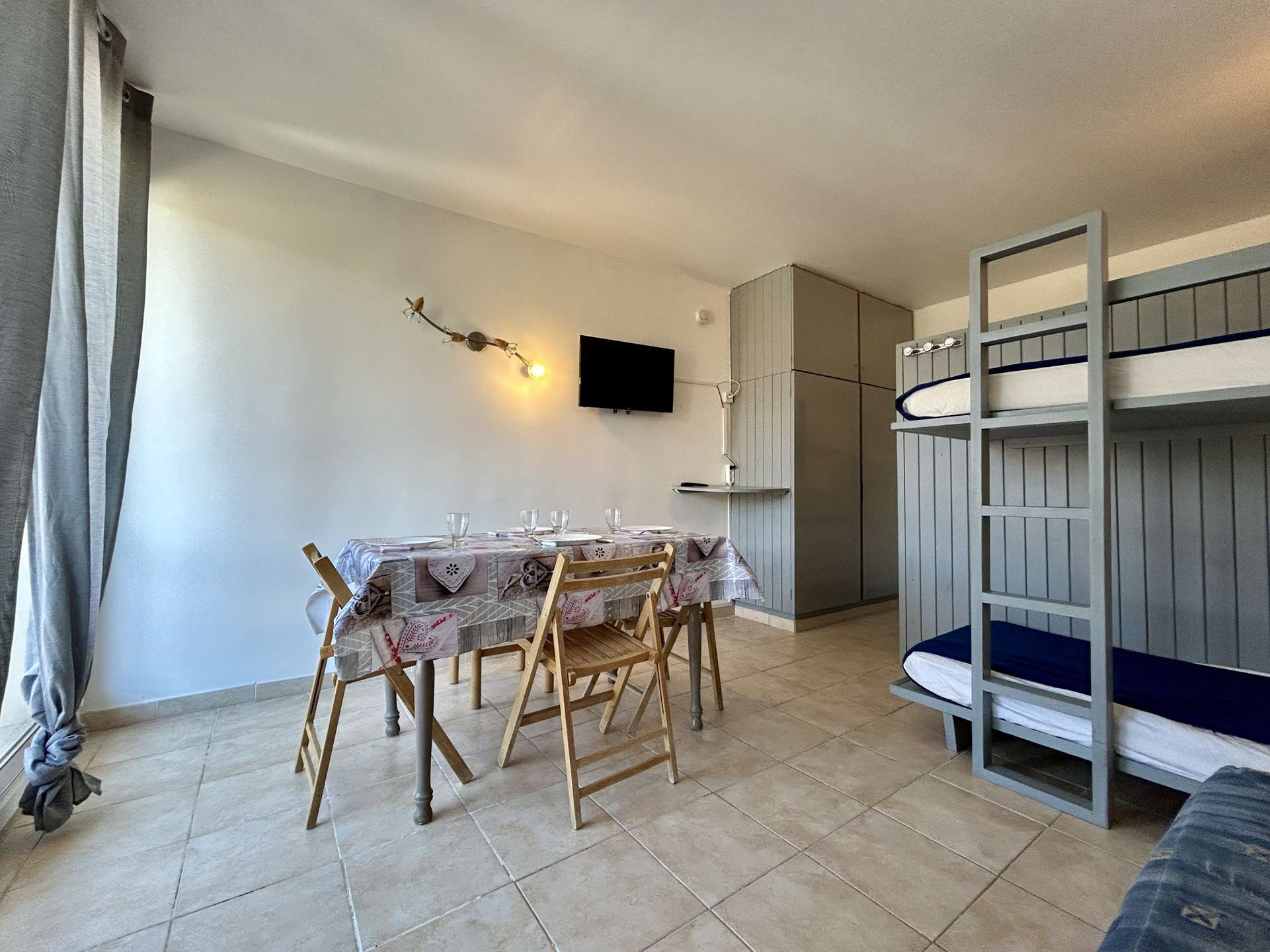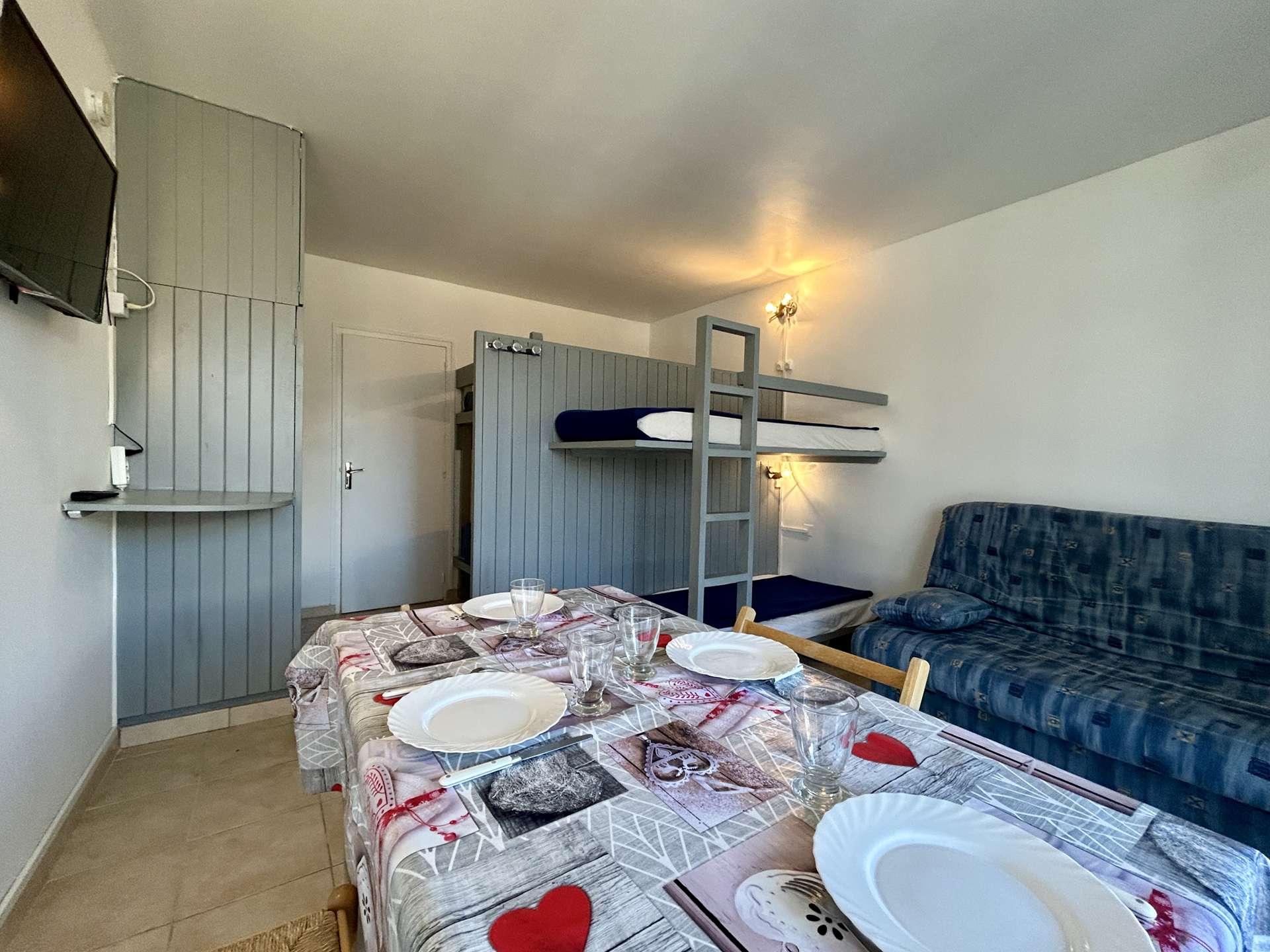 La pièce à vivre dispose d'un coin nuit avec lit superposés en 160x200 et un canapé BZ en 140x190 avec TV.