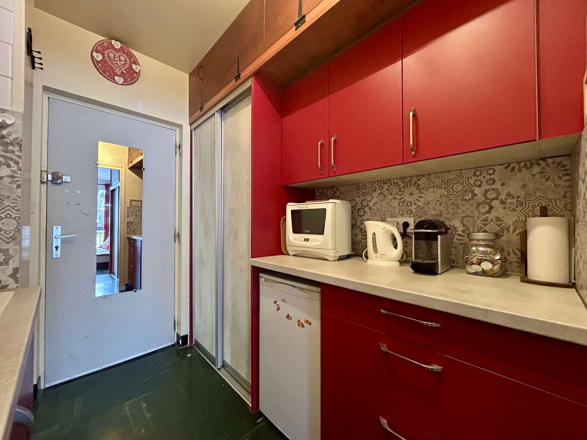 Il comprend une entrée desservant la salle d'eau / WC, une cuisine séparée équipée, de plaques électriques, d'une cafetière Nespresso, d'un appareil à raclette et fondue et d'un four et d'un micro-onde...