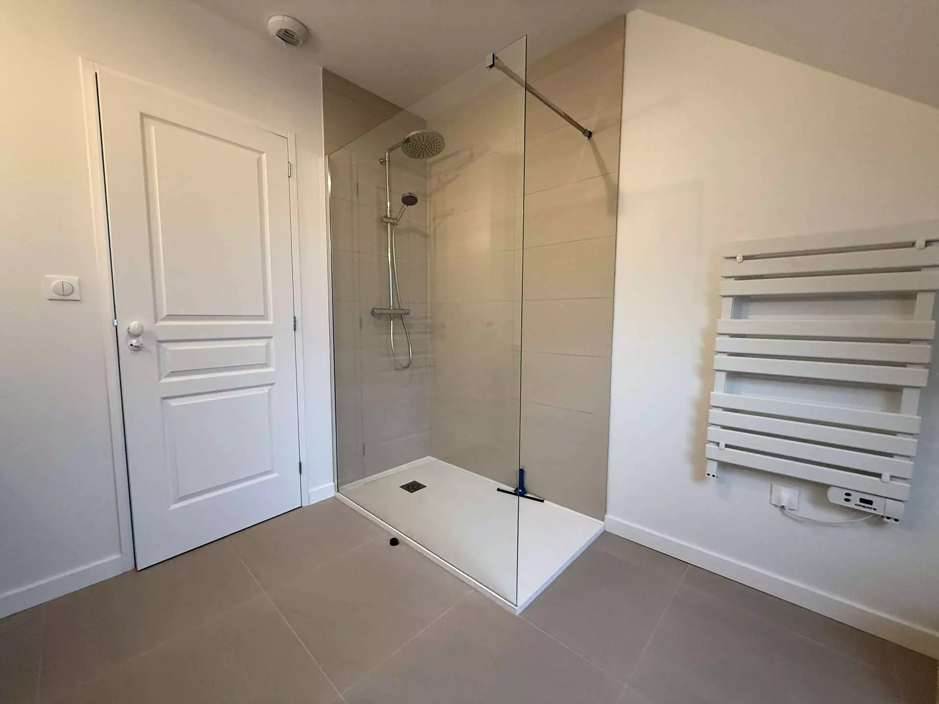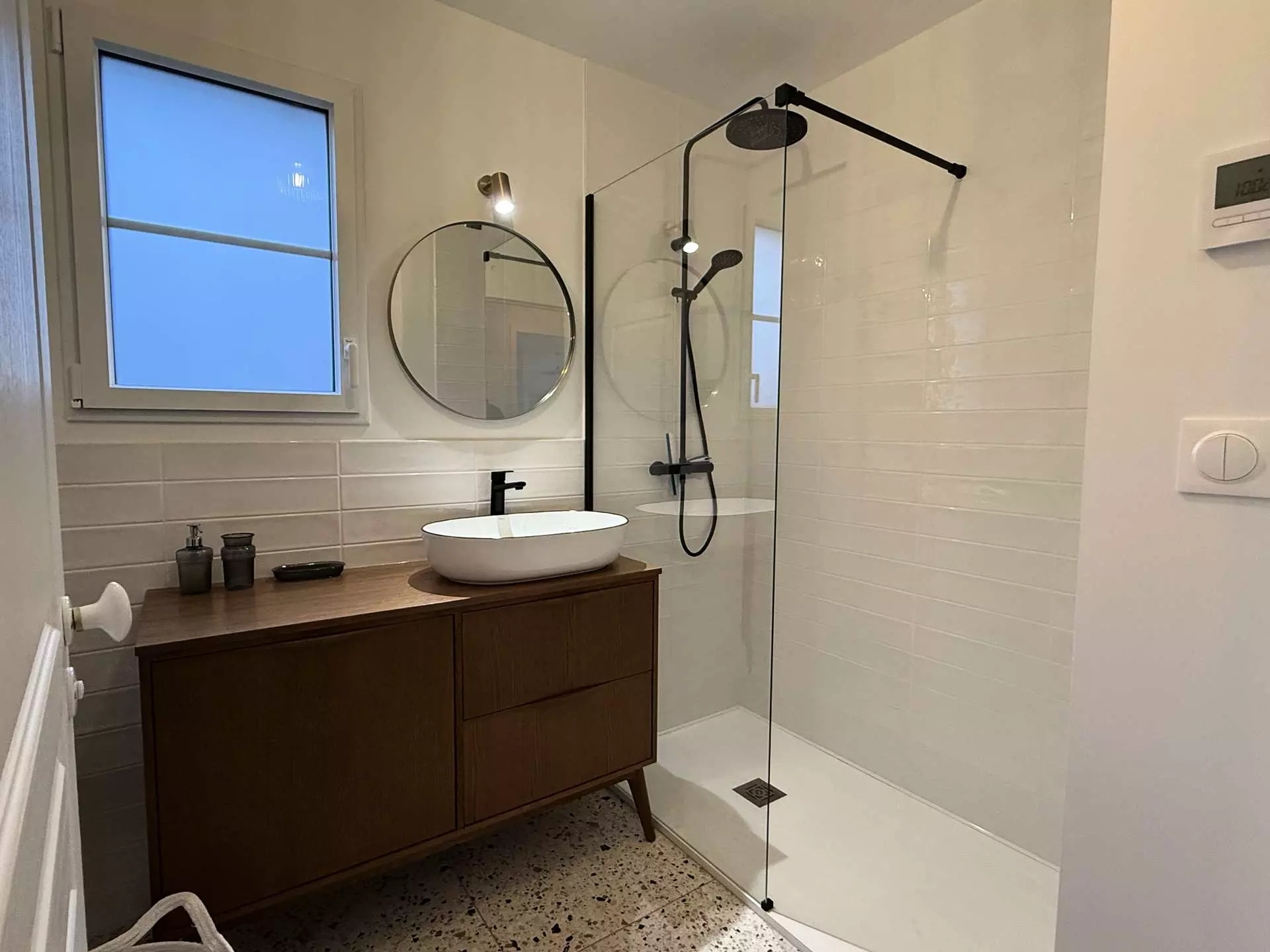 Salle d’eau avec meuble vasque et douche spacieuse.