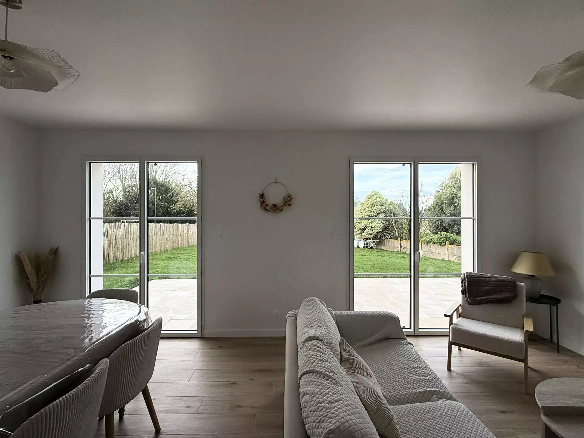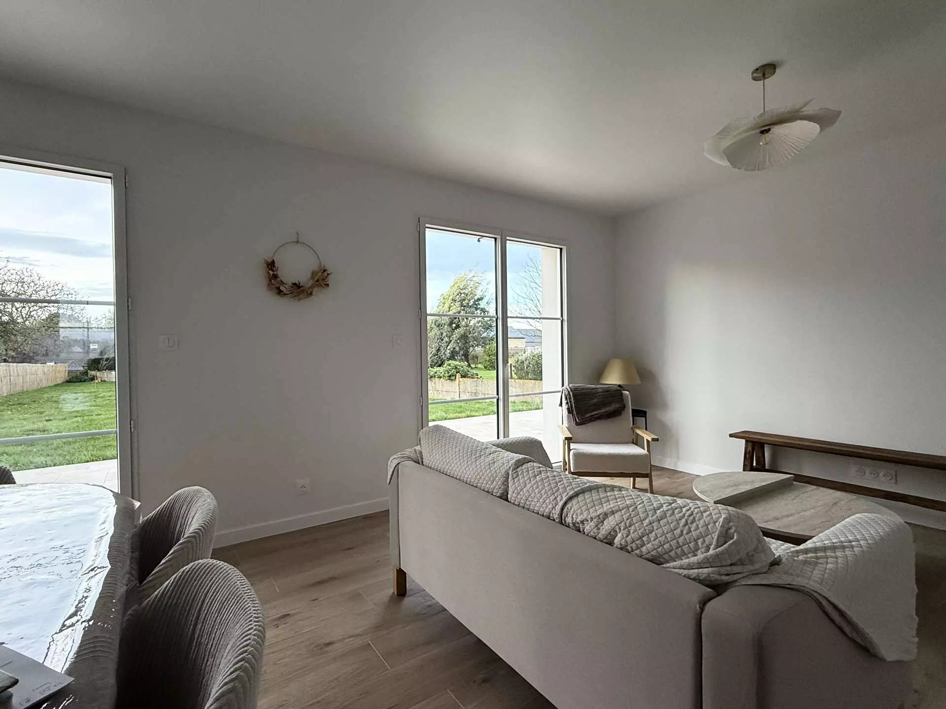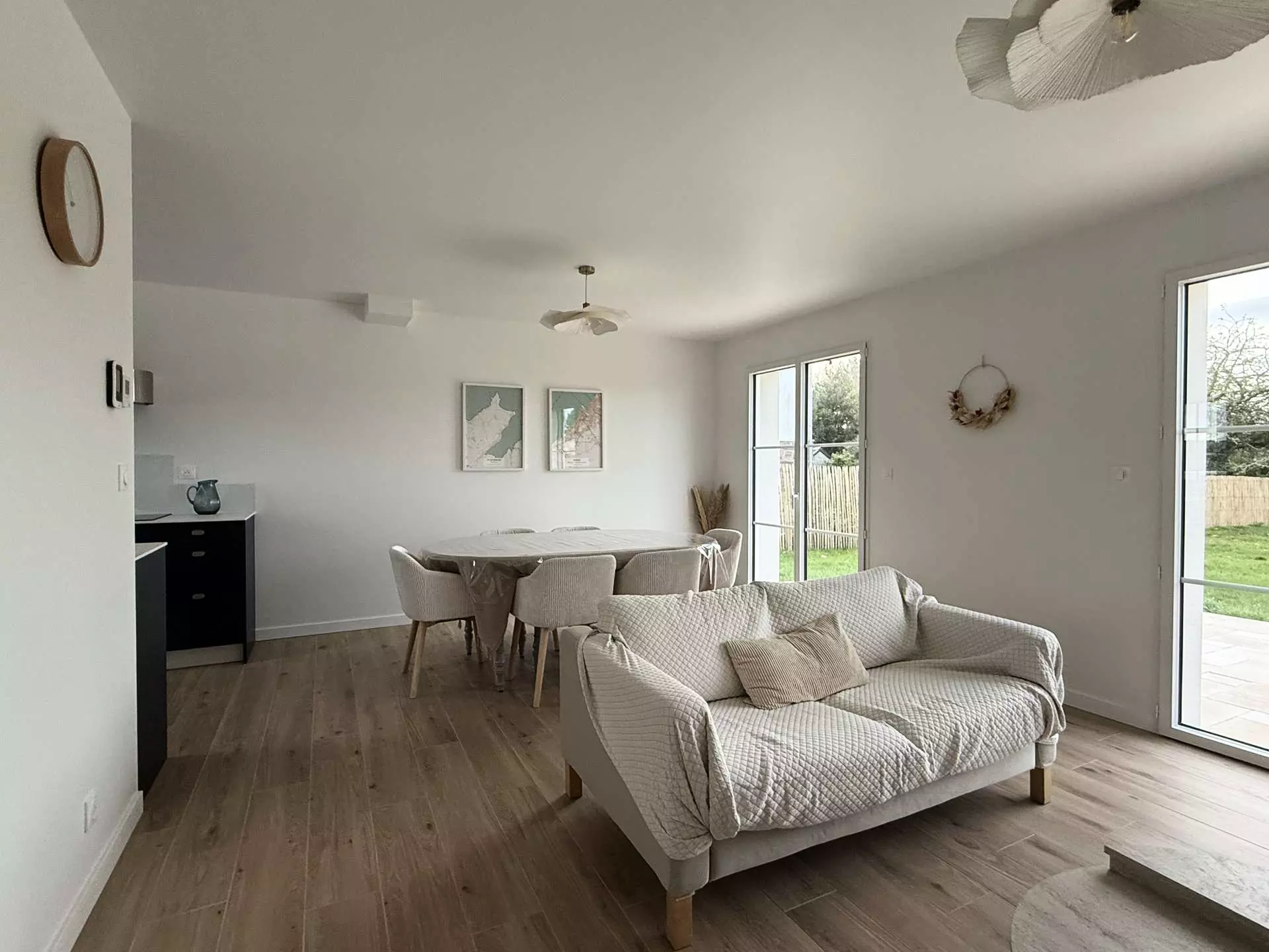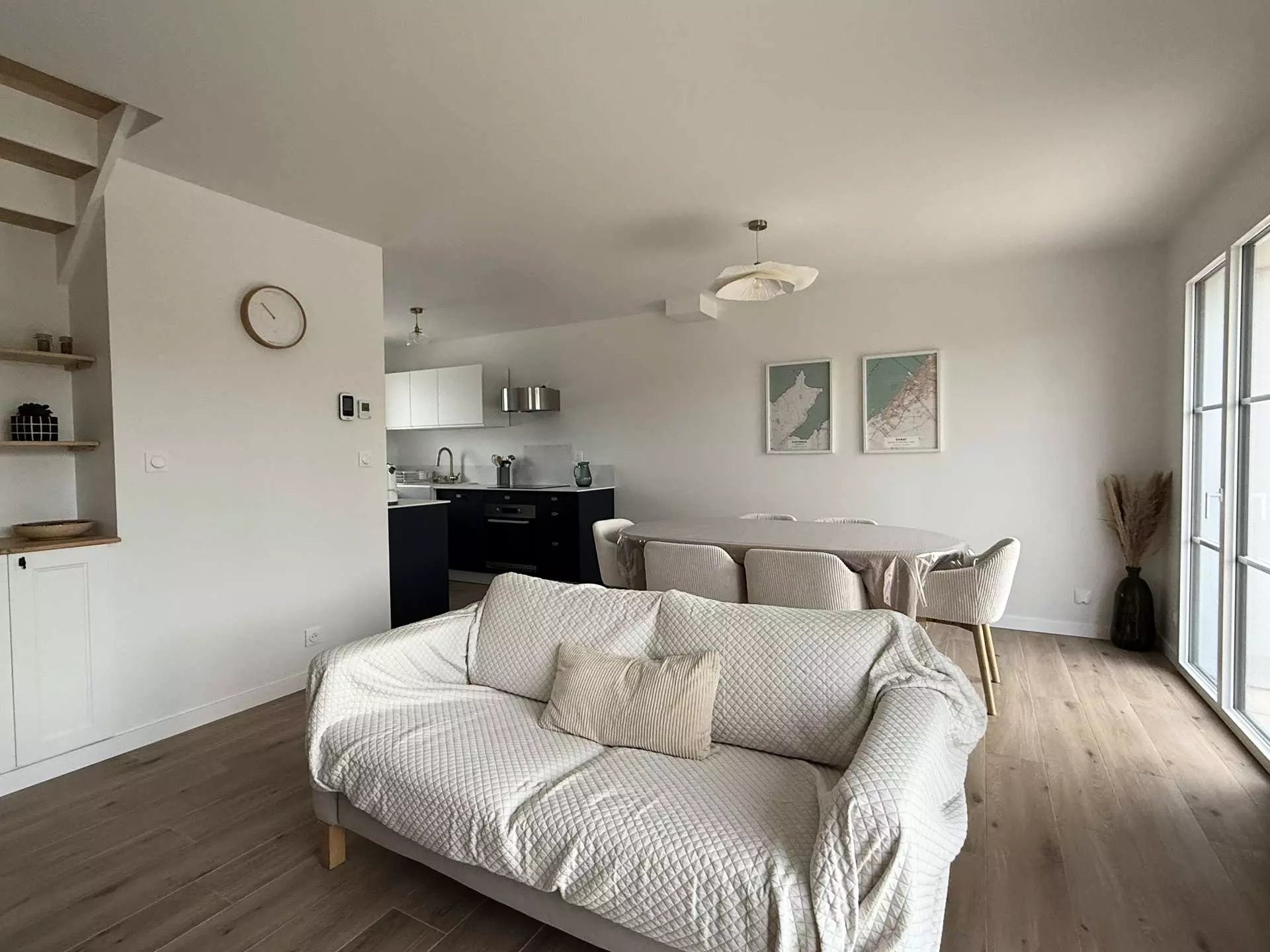 Salon équipé d’un canapé, d’une table basse, d’un coin repas pour 6 personnes, ouvert sur une cuisine entièrement aménagée.