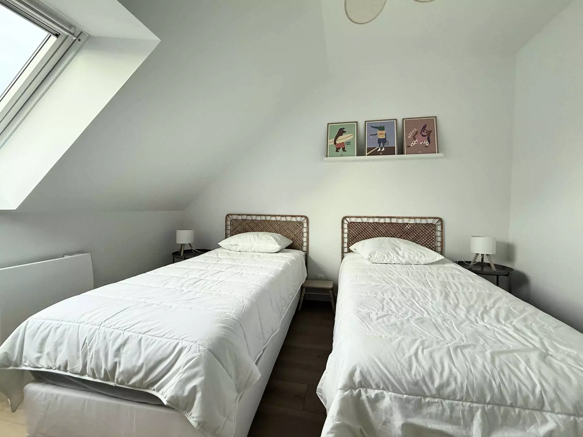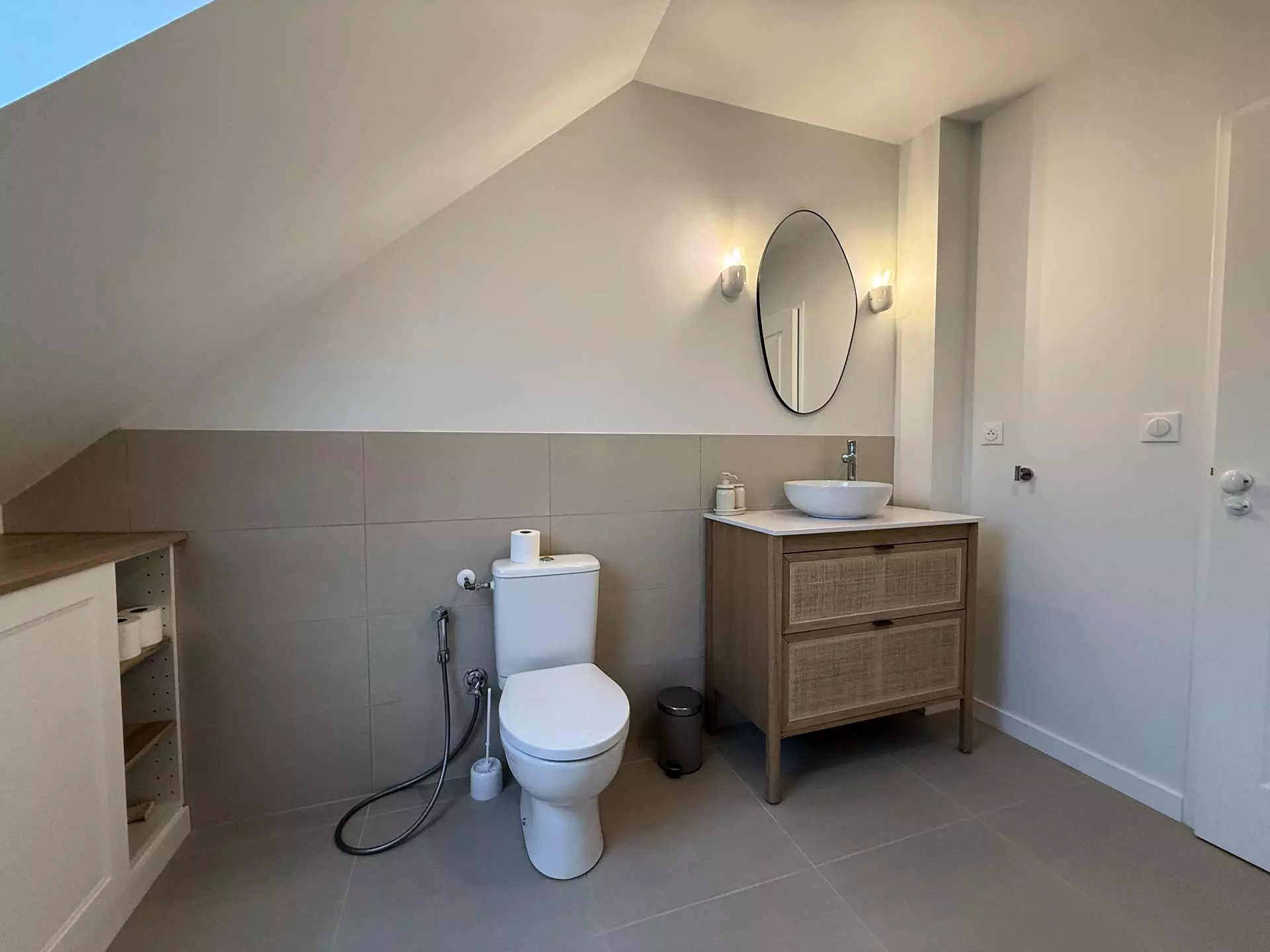 Suite 2 : chambre avec deux lits 90 cm (pouvant être rapprochés sur demande), penderie et commode, ainsi qu’une salle de bain privative avec meuble vasque et WC séparé.